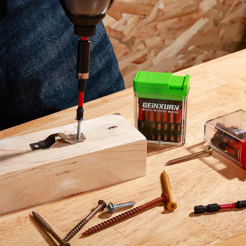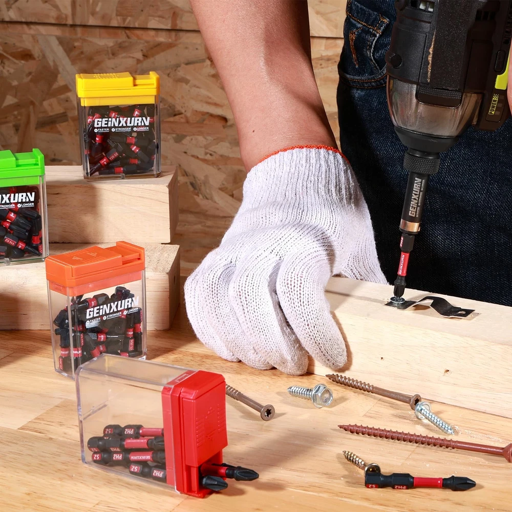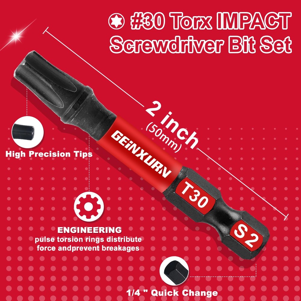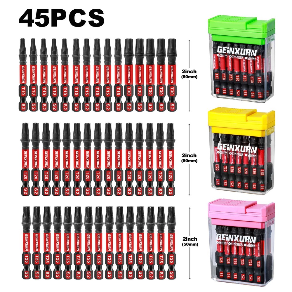 Quantity: 45Pieces Torx Screwdriver Bits 2 inches (T10x5,T15x5,T20x15,T25x15,T30x5) driver bits Material: Advanced metallurgy hardened S2 alloy steel Shank: 1/4 in. hex Strong Magnetic Anti-impact and tough, great wear resistant. These impact tough bits are an impact rated line of screw driving bits and bit holders that have been enhanced to handled a new generation of higher torque impact drivers. Provide 10X longer bit life than standard impact bits. Impact Rated Screwdriver Bit Impact Shock Absorbent Zone stands up to punishment from high-torque impact drivers. Long-lasting engineered tips provide enhanced strength that can handled high-torque impact drivers, so it can tightening or loosening screws easier. Torx Screwdriver Bit Set: 2 inches(T10x5,T15x5,T20x15,T25x15,T30x5) driver bits, they're all have a customized box Impact Star Bits: Impact Shock Absorbent Zone stands up to impact drivers. It can be handled a new generation of higher torque impact drivers S2 Alloy Steel: it owns the features of high hardness and good toughness and resistance through strictly heat treatment, durable and suitable for any industrial use Precision Tips Head: deliver a better fit and less cam-out, each edge can accurately lock the screw, stabilizes without slipping and improves work efficiency. Avoid damaging the screw and screwdriver head Wide range of uses: Made to fit 1/4 In. hex impact drivers drill screw bit set is not only work with impact driver, but also magnetic screwdriver bit perfect for any regular drill, electric,hand screwdrivers and more