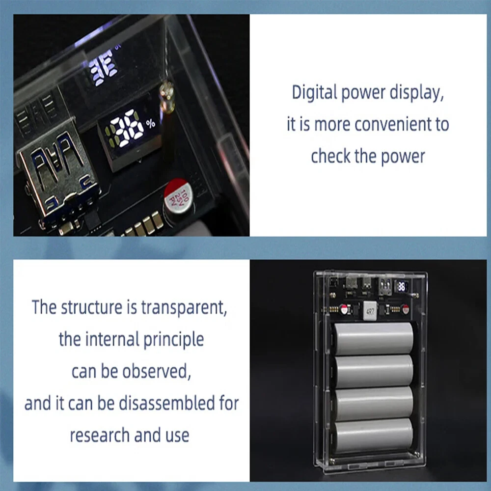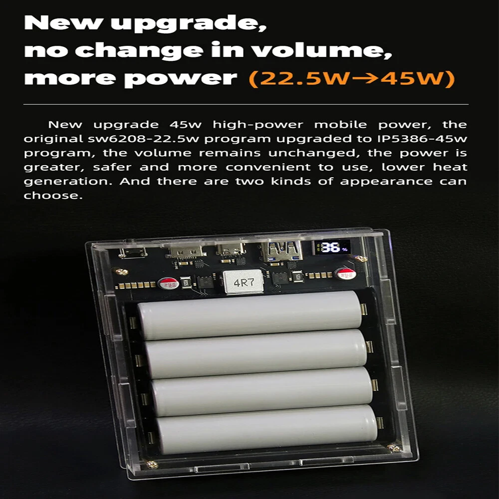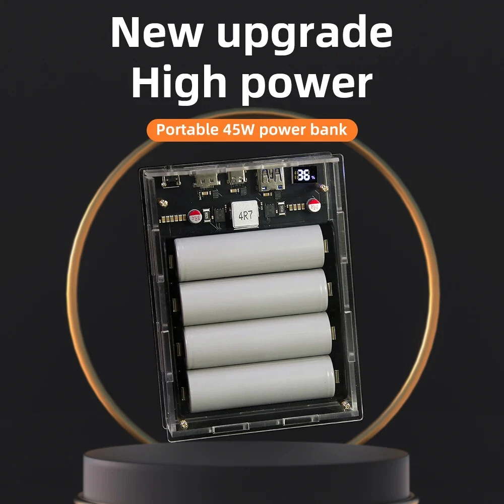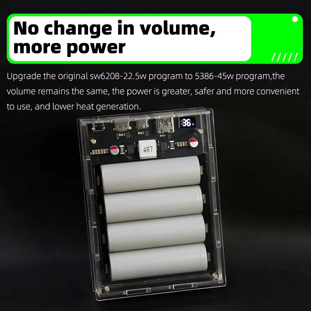 SAFE & SECURE SHOPPING 100% SATISFACTION GUARANTEED FAST SHIPPING PD 45W Two Way LED Light Digital Display Battery Fast Charge Power Bank Case Product Description Features: 1. The product adopts a four-string lithium battery structure, with built-in BM3451 lithium battery protection circuit, double protection to prevent overcharge and over-discharge of the battery. 2. Built-in 4 LED lighting lamps, although the power is small, it is completely enough in the dark, and the warm white is not dazzling, and supports long-term lighting without heat. Long press the switch to turn on or off the led. 3. The solderless battery box supports 18650 and 21700 batteries. It can be activated by direct installation without welding. Pay attention to the installation direction. Installing the battery reversely will cause the element to burn. The fully transparent acrylic shell needs only a few screws to fix it, which is simple and convenient, and can also be replaced quickly after damage. Introduction: Size: 130 * 95 * 34mm Weight: 200g Total capacity: 21700 finished products 19200 mah Battery pack voltage: 12-16.8v Maximum power: 45w The 45w high-power mobile power supply has been newly upgraded, and the original sw6208-22.5w scheme has been upgraded to 5386-45w scheme, which has the same volume, higher power, safer and more convenient use, and lower heating. There are two appearances to choose from. The product has three interfaces, one Apple interface (only input, not output). A type-c interface, bidirectional 45v, supporting input and output up to 20v2a,there is also a usb output. IP5386 supports a variety of fast charging protocols: PD, QC2.0, QC3.0, QC3+, FCP, AFC, SCP, Apple. NOTE: 1. 21700 types of finished products use 4 new 4800mah batteries made in China Yiwei. The option of spare parts does not include batteries, and spare parts do not have after-sales service! Please watch the assembly video carefully before installation! 2. The acrylic shell of the product is 10 yuan per set. Please test whether the product function is normal before installing the shell. If you tear the protective plate of the shell, you can't refund it! If you don't like it, you can contact customer service to apply for after-sales service 3. Please pay attention to the battery installation direction and look at the positive and negative on the circuit board! Package includes: 1*1set Power Bank Case Payment Shipping Returns Contact US Payment Payment must be completed within 5 days. If you have any problems about payment, please contact us via ebay message. Shipping We only ship to confirmed ebay Order addresses. Please comfirm that your Order address is in line with your shipping address. Please kindly note that the combined shipping is not provided because the shipping fee is calculated by weight. Also, the each additional item means exactly the the same color and size. It takes about 7-15 working days to US; about 10-30 working days to other countries. Transit time may be a little delayed because of the bad weather and customs inspection. If you do not receive your item within 30 working days since payment finished, please contact us immediately for further assistance. Returns Items can be returned for exchange or refund within 30 days from the date you receive your merchandise. We are not responsible for any purchase after this 30-day period. Return shipping is the responsibility of buyer unless the return is a result of our mistake (i.e., your receive the wrong item). We will pay for shipping replacement back to you if an exchange is requested. Contact US Customer satisfaction is very important to us and our feedback rating reflects this satisfaction. If you have any questions, Our customer service staffs welcome feel free to contact us by EBAY message box. We strive to answer all questions and resolve any problems as quickly as possible. Copyright © 2022 Tongtool On Dec 10, 2024 at 01:25:37 PST, seller added the following information: