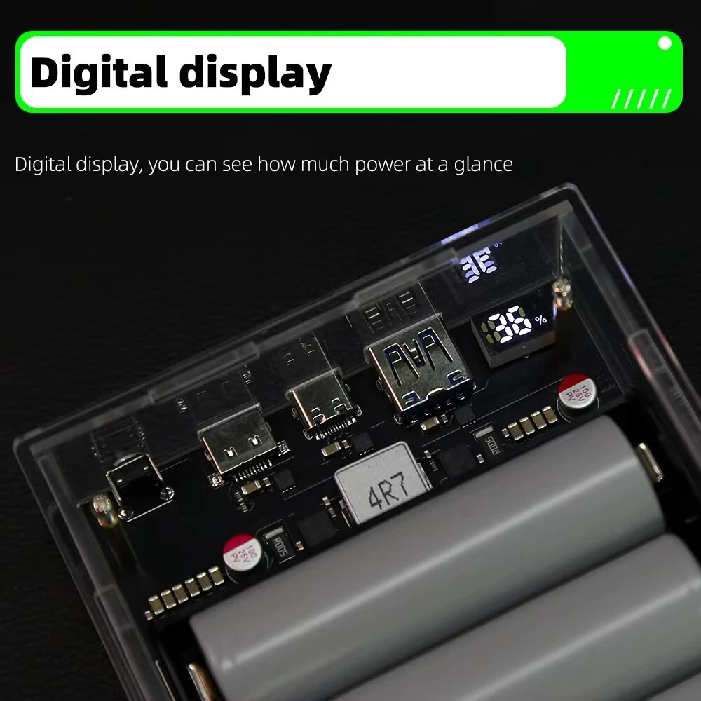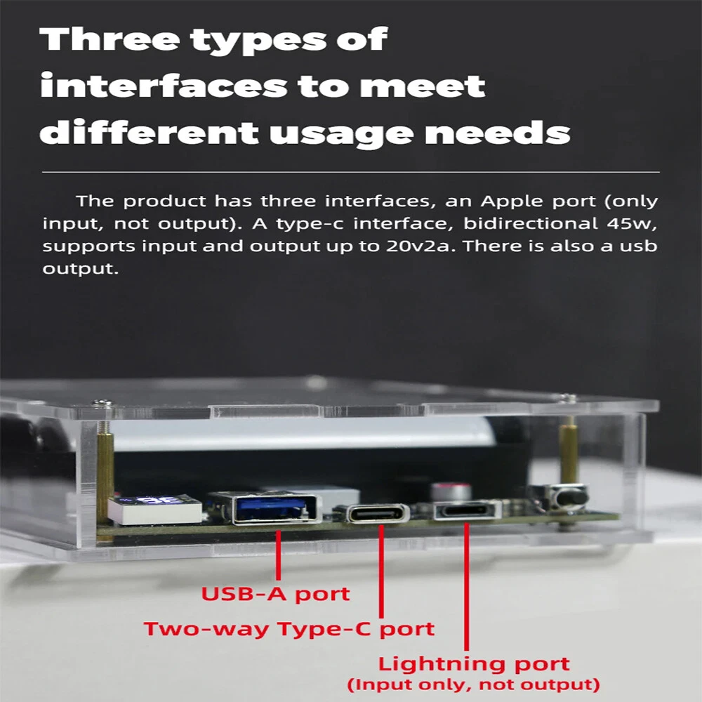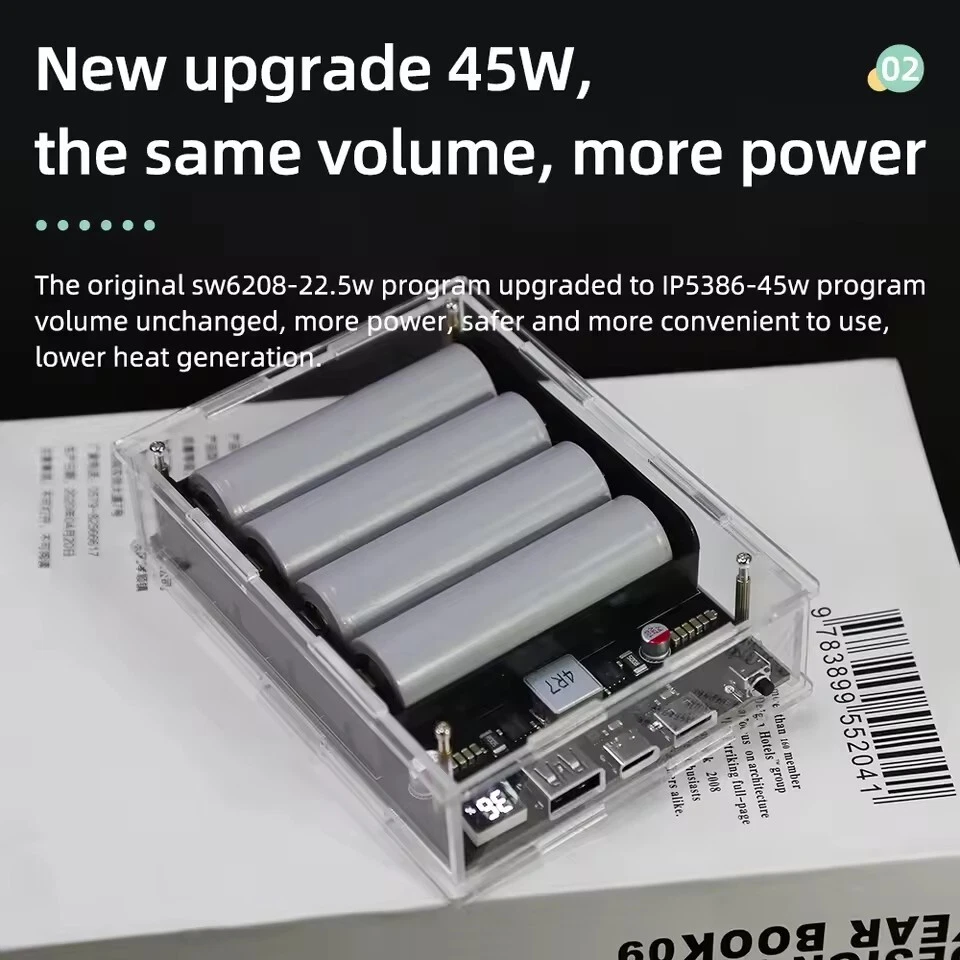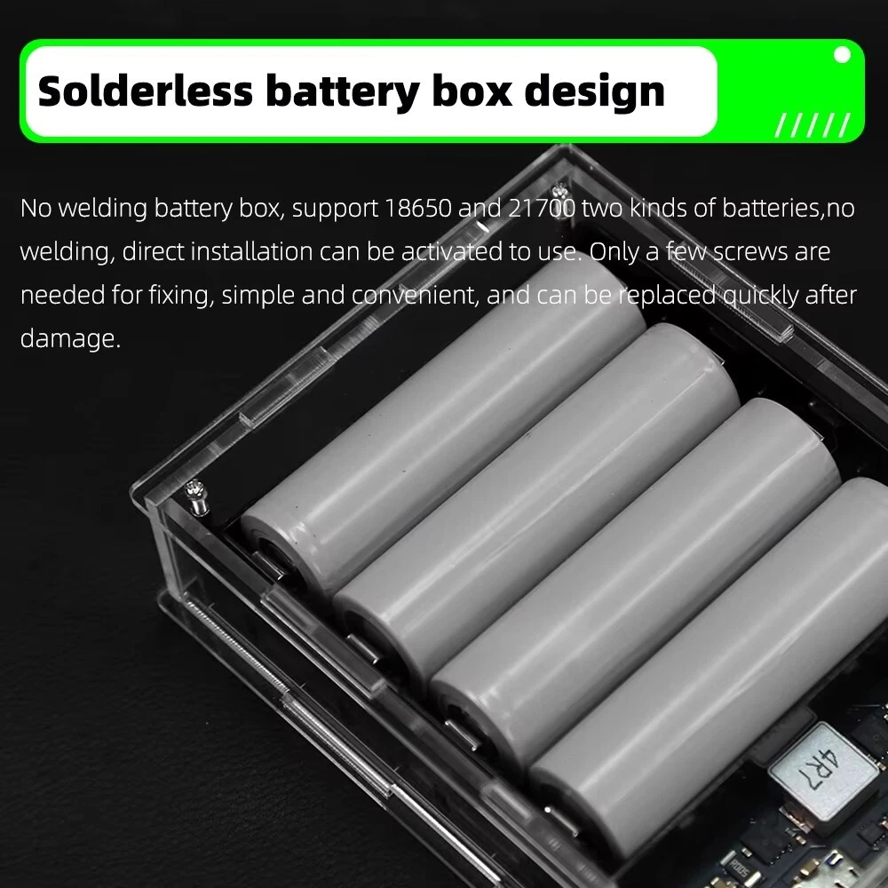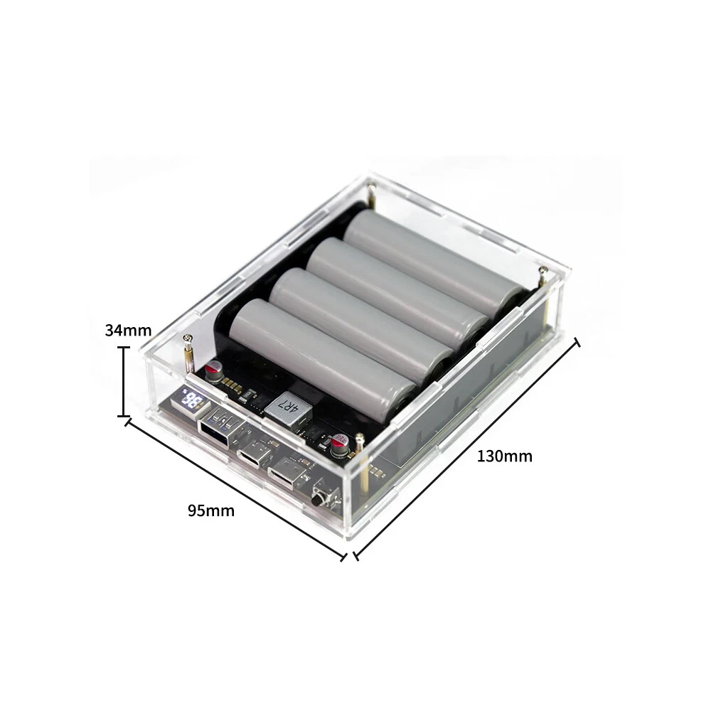 SAFE & SECURE SHOPPING 100% SATISFACTION GUARANTEED FAST SHIPPING PD 45W Two Way LED Light Digital Display Battery Fast Charge Power Bank Case Product Description Features: 1. The product adopts a four-string lithium battery structure, with built-in BM3451 lithium battery protection circuit, double protection to prevent overcharge and over-discharge of the battery. 2. Built-in 4 LED lighting lamps, although the power is small, it is completely enough in the dark, and the warm white is not dazzling, and supports long-term lighting without heat. Long press the switch to turn on or off the led. 3. The solderless battery box supports 18650 and 21700 batteries. It can be activated by direct installation without welding. Pay attention to the installation direction. Installing the battery reversely will cause the element to burn. The fully transparent acrylic shell needs only a few screws to fix it, which is simple and convenient, and can also be replaced quickly after damage. Introduction: Size: 130 * 95 * 34mm Weight: 200g Total capacity: 21700 finished products 19200 mah Battery pack voltage: 12-16.8v Maximum power: 45w The 45w high-power mobile power supply has been newly upgraded, and the original sw6208-22.5w scheme has been upgraded to 5386-45w scheme, which has the same volume, higher power, safer and more convenient use, and lower heating. There are two appearances to choose from. The product has three interfaces, one Apple interface (only input, not output). A type-c interface, bidirectional 45v, supporting input and output up to 20v2a,there is also a usb output. IP5386 supports a variety of fast charging protocols: PD, QC2.0, QC3.0, QC3+, FCP, AFC, SCP, Apple. NOTE: 1. 21700 types of finished products use 4 new 4800mah batteries made in China Yiwei. The option of spare parts does not include batteries, and spare parts do not have after-sales service! Please watch the assembly video carefully before installation! 2. The acrylic shell of the product is 10 yuan per set. Please test whether the product function is normal before installing the shell. If you tear the protective plate of the shell, you can't refund it! If you don't like it, you can contact customer service to apply for after-sales service 3. Please pay attention to the battery installation direction and look at the positive and negative on the circuit board! Package includes: 1*1set Power Bank Case Payment Shipping Returns Contact US Payment Payment must be completed within 5 days. If you have any problems about payment, please contact us via ebay message. Shipping We only ship to confirmed ebay Order addresses. Please comfirm that your Order address is in line with your shipping address. Please kindly note that the combined shipping is not provided because the shipping fee is calculated by weight. Also, the each additional item means exactly the the same color and size. It takes about 7-15 working days to US; about 10-30 working days to other countries. Transit time may be a little delayed because of the bad weather and customs inspection. If you do not receive your item within 30 working days since payment finished, please contact us immediately for further assistance. Returns Items can be returned for exchange or refund within 30 days from the date you receive your merchandise. We are not responsible for any purchase after this 30-day period. Return shipping is the responsibility of buyer unless the return is a result of our mistake (i.e., your receive the wrong item). We will pay for shipping replacement back to you if an exchange is requested. Contact US Customer satisfaction is very important to us and our feedback rating reflects this satisfaction. If you have any questions, Our customer service staffs welcome feel free to contact us by EBAY message box. We strive to answer all questions and resolve any problems as quickly as possible. Copyright © 2022 Tongtool On Dec 10, 2024 at 01:25:37 PST, seller added the following information: