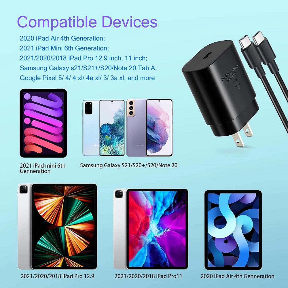 45W Wall Charger Specification: [Type]: 45W PD3.0 fast charge charger [Output power]: 45W [Material]: Fireproof ABS Plastic + PC [Port Type]: USB-C [Input voltage]: AC 100-240V 50-60Hz [Working temperature]: 0-70℃ [Output voltage]: PDO : 5V/3A or 9V/3A or 15V/3A or 20V/2.25A [Output current]: PPS : 4.05A(3.3-11V) or 2.8A(3.3-16V) or 2.1A(3.3-21V) [Output protection]: Over-current protection,short circuit protection, overvoltage protection, overheat protection. 45W Wall Charger Feature: USB-C PD3.0/QC3.0 Fast Charger 1.Universal Compatibility: 45W PD USB Type C wall Charger , PD3.0 QC3.0 dual technology perfect work compatible iPhone 14 series,iPhone 13 series/Samsung S22/Note 20 etc. 2.Safe Charging & Syncing -- Type C USB Awall adapter with intelligent chip automatically detects and delivers the optimal charging power for connected devices, to guarantee fast charging while protecting battery life. Over-current, over-voltage and short-circuit protection effectively protect your devices from damage and ensure the safer charging overnight. 3.Compact Size: comes in a pocket-friendly size, easily portable and lightweight, can go wherever the journey takes. 4.No Charging Cable in package, You need to use your original charging cable. Fast Charging Cable Features: 1. Type C to Type-C Cable: USB-C connector offers a user-friendly reversible design, fast Charging and transferring, Up to 480 Mbps data transfer speed; power output up to 3Amp. 2. Support QC and PD fast charge, support data transmission. Fast charging your USB-C laptops, tablets and smartphones by using 60W 45W 30W 18W 15W USB-C Power Adapters, suports PD 3.0 and QC 3.0 fast charging. Data transfer speed is up to 480Mbps. 【Note: Not support video output.】 3. Suitable for charging mobile phones, earphones, iPad, laptops (over 60W recommended 100W charging cable) 4. Strong toughness, not easy to break when bending 6. Anti-fracture design, upgraded 3D aluminum connector and unique laser welding technology can ensure that the metal parts will not break. 6. The high-quality nylon braided cable has increased durability and no tangles. The special stress relief design can withstand 10,000+ bending tests. Compatible device model: -For iPad Pro: For iPad Pro 12.9" 4th Gen (2020), iPad Pro 12.9" 3rd Gen (2018), iPad Pro 11" 4th Gen (2020), iPad Pro 11" 3rd Gen (2018) which is USB C port. -For Samsung: Galaxy S22/S22+/S22 Ultra, Galaxy S21/S21+/S21 Ultra, Galaxy S20 FE/S20/S20+/S20 Ultra, S10, S10+, S10e, S9, S9+ Plus, S8, S8+ Plus/Active, Note 20/20 Ultra, Note 9, Note 8, Note 7... -For Google: Pixel, Pixel 2, Pixel 3, Pixel 4, Pixel XL, Pixel 2XL, Pixel 3XL, Pixel 4XL, Pixel 3A, Pixel 3A XL... -For LG: G7 Thing, G6, G5, Stylo 4, V20, V30, V35, V30S, V40 ThinQ Plus... -For Motorola: Moto G6, G6 Plus, G7 Plus, G7 Power... -For other Type-C devices Package includes: 45W Wall Charger+3FT 5A Dual Type-C Fast Charging Cable