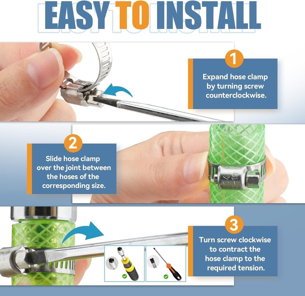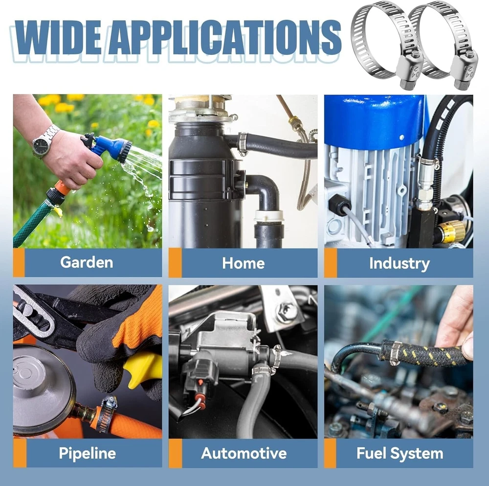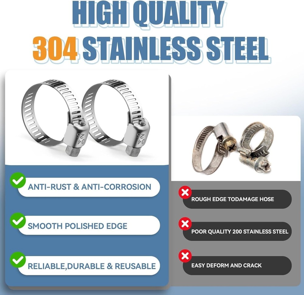 These hose clamps are a game-changer! The 304 stainless steel construction makes them super durable and rust-resistant, perfect for tough jobs. With 45 sizes from 1/4" to 1-1/8", they fit almost any hose in my garage—from plumbing to car repairs. The worm gear design gives a tight, secure grip every time. No more leaks or loose fittings! Super handy for DIY projects and professional use. Definitely worth the money for such reliable quality.