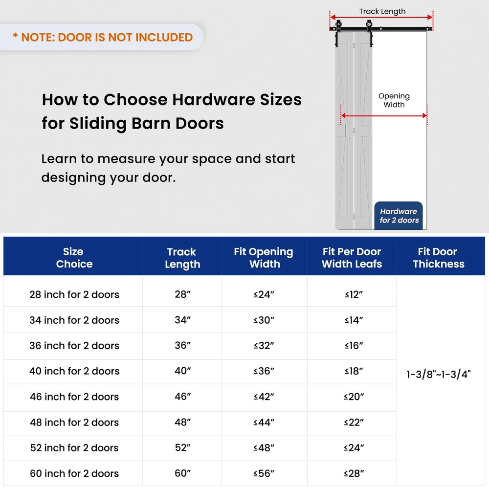 [Why Choose Us]: Our bifold door hardware kit is made of high-quality carbon steel and has the characteristics of corrosion resistance and waterproofing. It is equipped with rollers made of high-strength nylon material, which runs smoothly and has low noise. [Easy Installation]: Our products are packaged in partitions, marked with graphics. Professional instruction and customer service team help you solve all installation problems in time. Save the cost of finding a carpenter or decoration team. [Package Included]: 1x 3.8FT Rails, 3x Rail Spacers, 1x Fixed Roller, 1x Adjustable Roller, 1x Roller Lock Bracket,1x Bottom Pivot Plate & Sleeve, 2x Top Connector Plates, 3x Butt Hinges, 3x Hex Key; All other necessary hardware is included as you see in the pictures. [DOOR NOT INCLUDED] [Door Weight Max Capacity]: Our bifold barn door hardware kit Capacity is 360 lb, Fit sigle door panel max width: 22", Fit door panel thickness: 1 3/8" and 1 3/4". [Right Choice for Your House]: Compared with the classic track, our bifold door hardware kit saves more space and has more applicable scenarios:bedrooms, living rooms, wardrobes, storage rooms, cloakrooms, dressing room, etc.