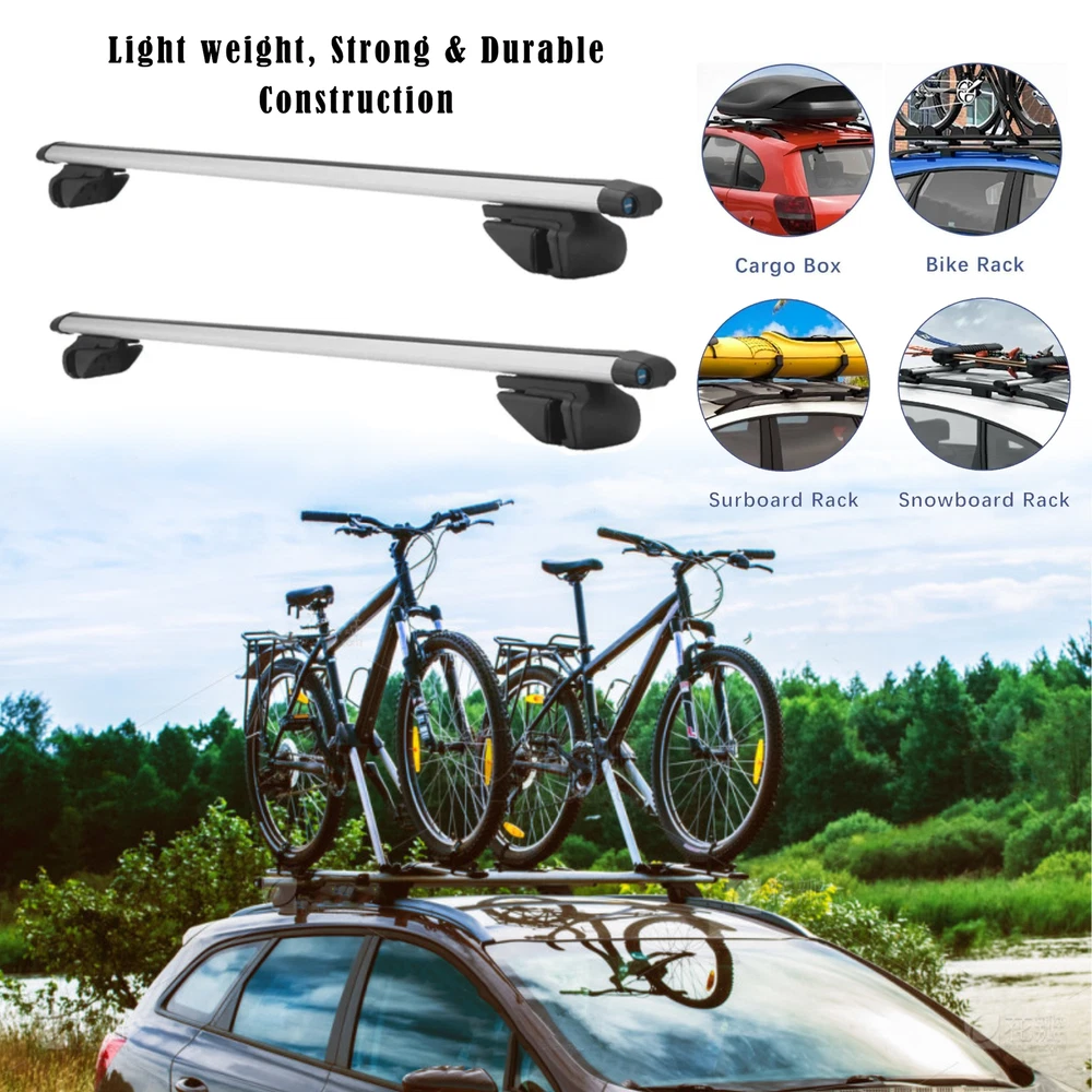 Vehicle Fitment Guide: 1.Universally for vehicles with an existing roof side rail system 2.Do not fit flush mounted or round/oval shaped roof rails 3.Please measure the dimension of the factory roof side rail to make sure our clamps is big enough to fit your application & your vehicle tower distance is not over 42 inches before purchasing 4.If you have problems with the installation, please contact us or go to a professional modification store for help. Features: Large Load Capacity: They are made of high-strength aluminum alloy and specially designed for distributing the load evenly, powerful enough to bear objects with a maximum weight of 150kg, hard to break. Locked Mechanism: Built-in locking system on roof crossbars to prevent it from being stolen. And locks & keys will help you to remove the ends for cleaning the crossbar inside or draining the water. Strong Clamp: The inside of each clamp is designed with rough surface for a tight, firm, hard-to-shake and secure clamping effect. Additionally, it can prevent the damage to the paint. Wide Application: They are widely used for cargo transportation, such as kayaks, canoes, luggage, snowboards, ski bikes, fishing rods, etc. Specifications: Material: Aluminum Alloy Load Capacity: 150kg Fitting Clamps Inner Width: Max 6cm/2.4in Product Size: about 120 x 7 x 5.5cm/47.2 x 2.8 x 2.2in Rod Length: about 120-124cm/47.2-48.8in Package Included: 2x Adjustable Aluminum Cross Bar 4x brackets and necessary mounting hardware for installation. Built-in lock & key On Jan 16, 2025 at 15:03:01 PST, seller added the following information: