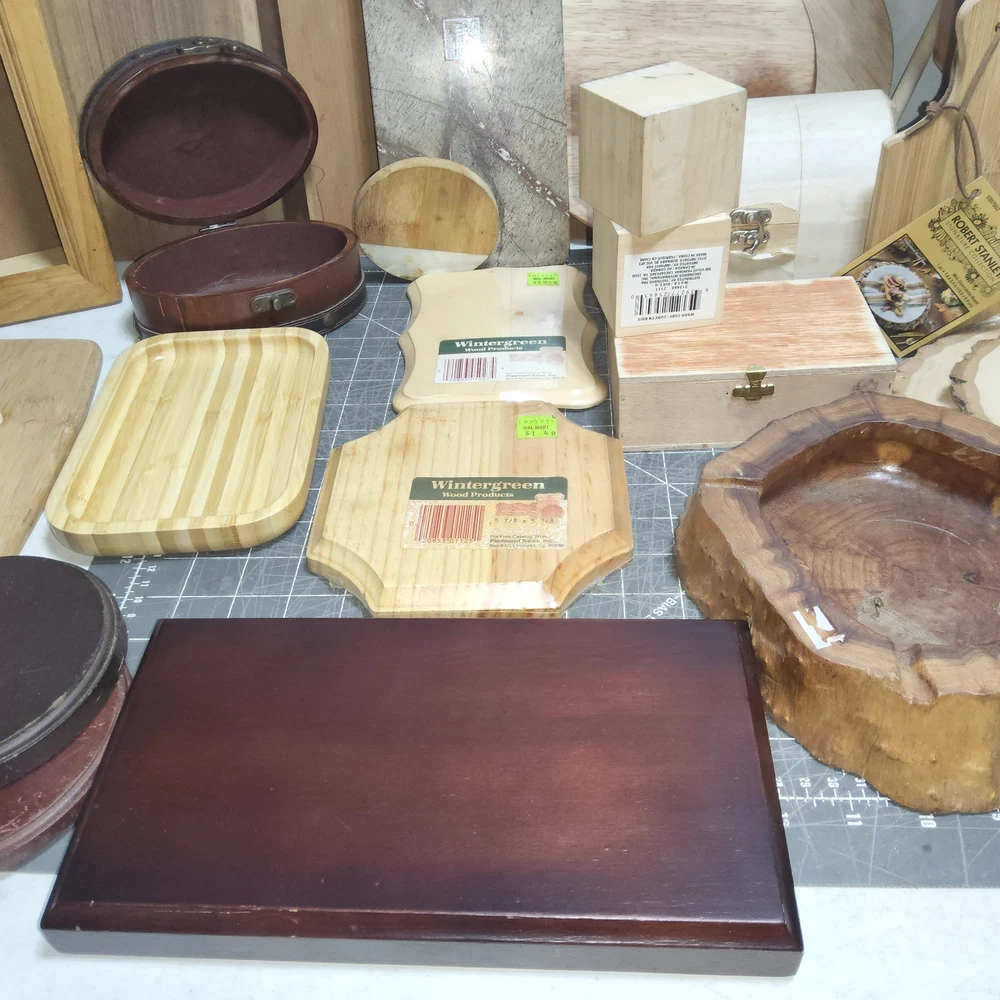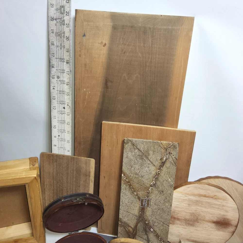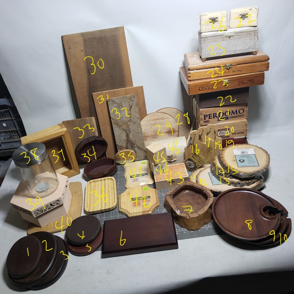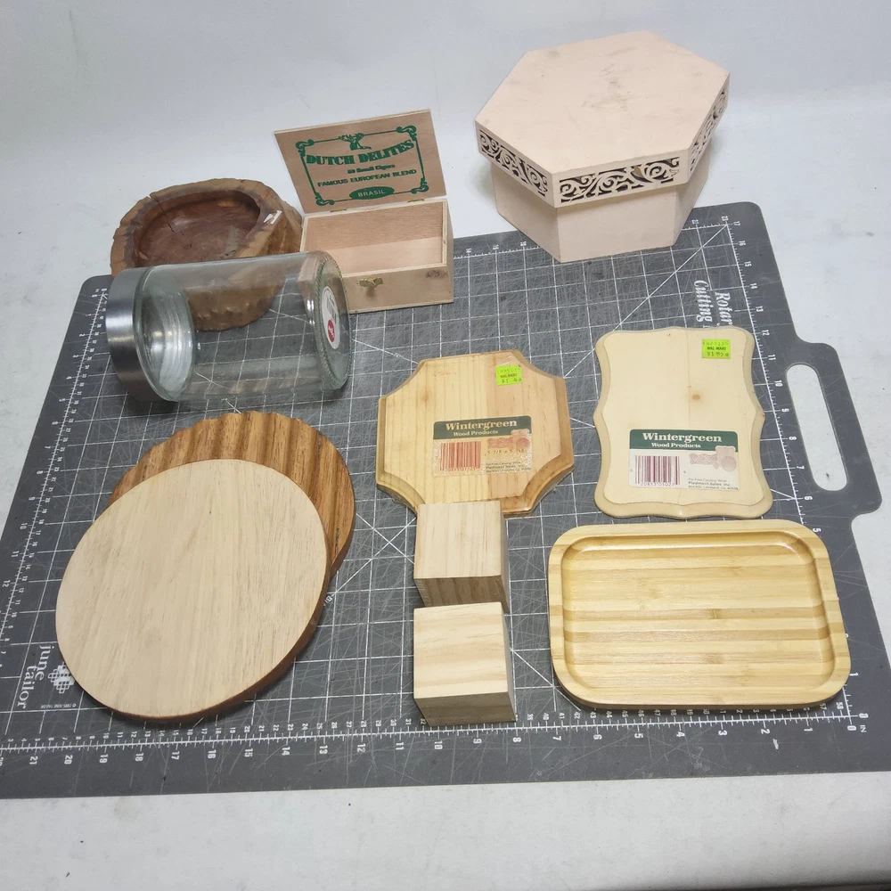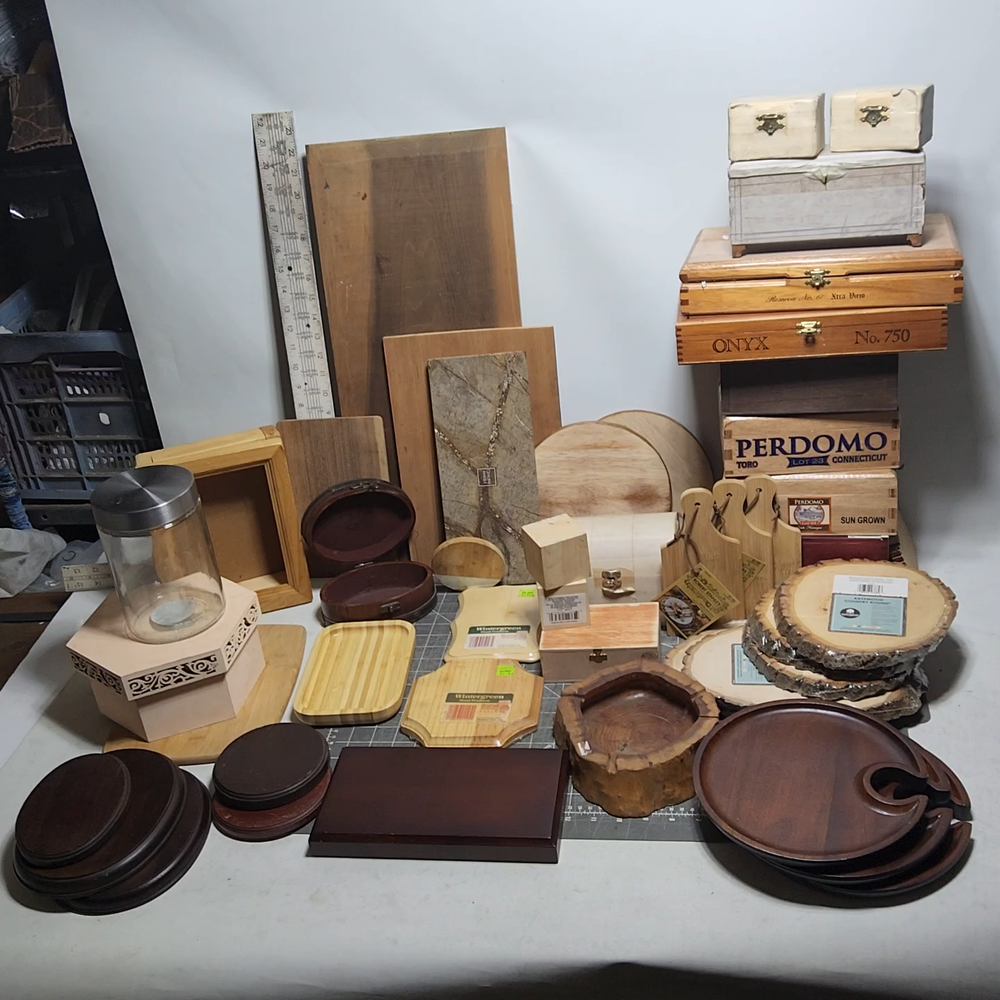 Can combine shipping on all orders. 46 wood crafting laser etching supplies upcycle blanks bases rounds cigar boxes My fellow creators/crafters/hoarders/etc., i bring you a collection of wooden pieces from thrift stores,yard sales,flea markets,etc. I bought them to mess around with on my laser machine. Sold it so don't need these anymore. Lots of goodies to create on,deconstruct, upcycle, reimagine, etc. I've sanded a few down to process on the laser machine. Others are taped off to mark where laser should engrave but never git to it so tape may be sticky. Some still have finishes like wooden bases. Some new pieces. Cigar boxes are made of spanish cedar and cut beautifully under a laser. Make tons of jewelry. 1 marble slab that has a small chip on the corner. All types of wood. Cherry,cedar,pine,bamboo(technically grass),oak 1 glass jar with metal top. All ready for you to monkey up. Packed and ready to go.