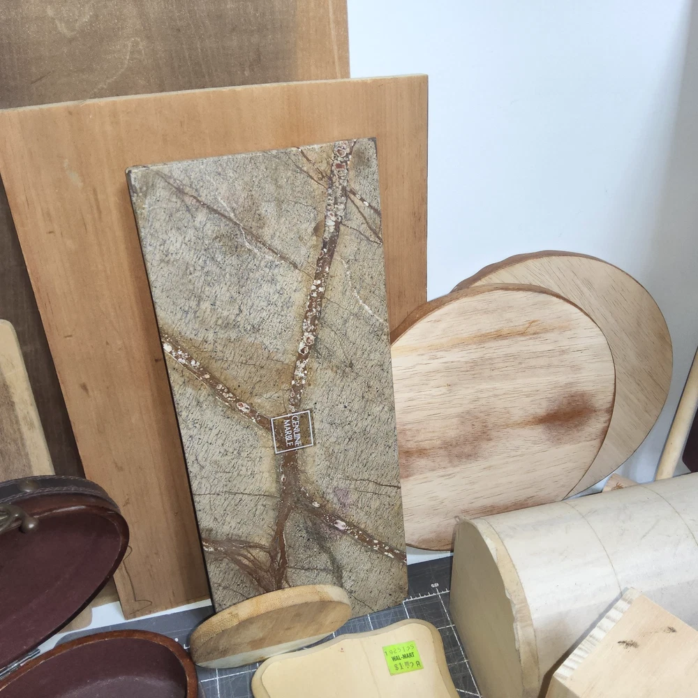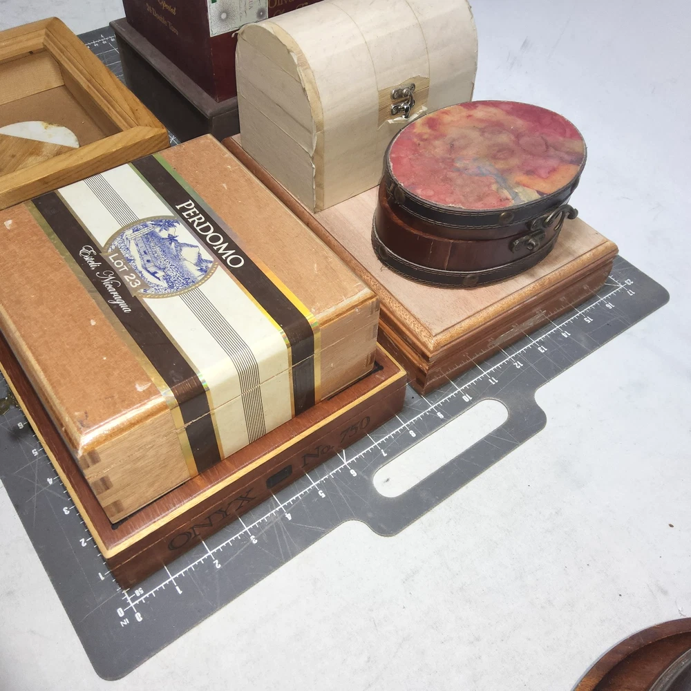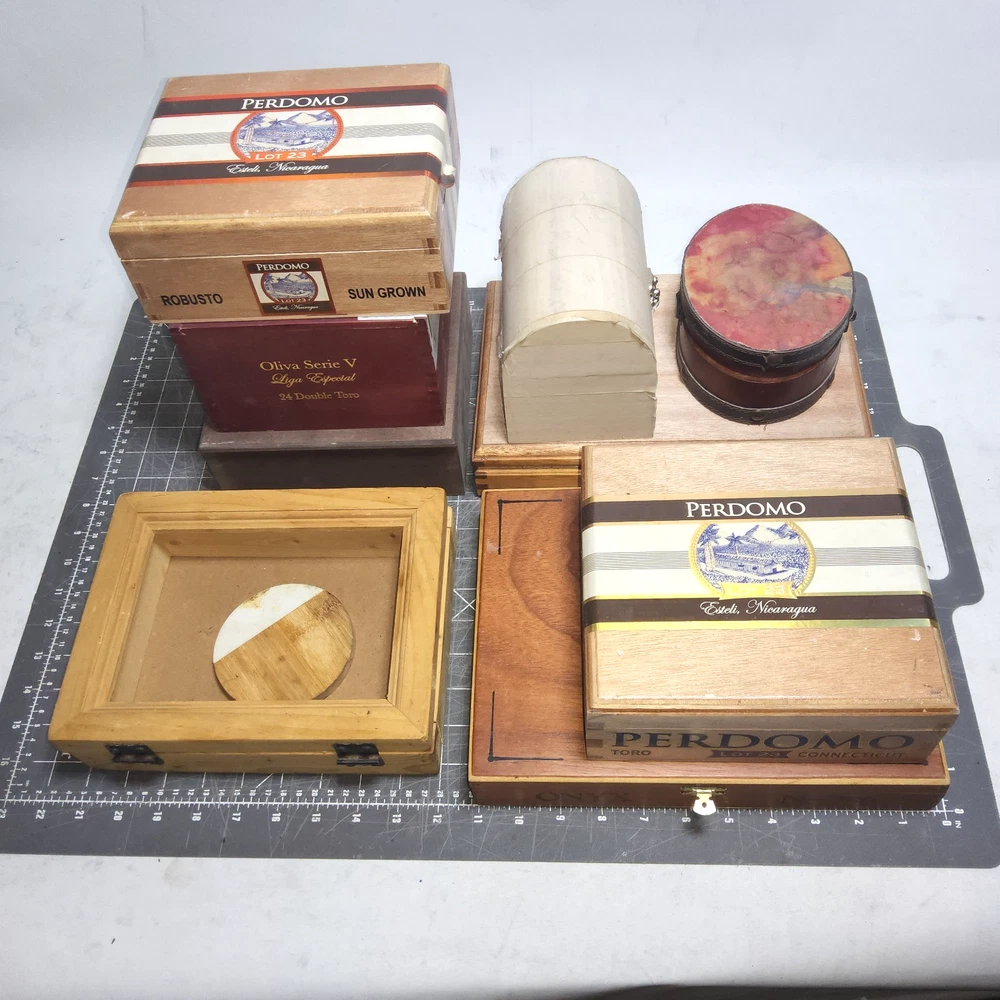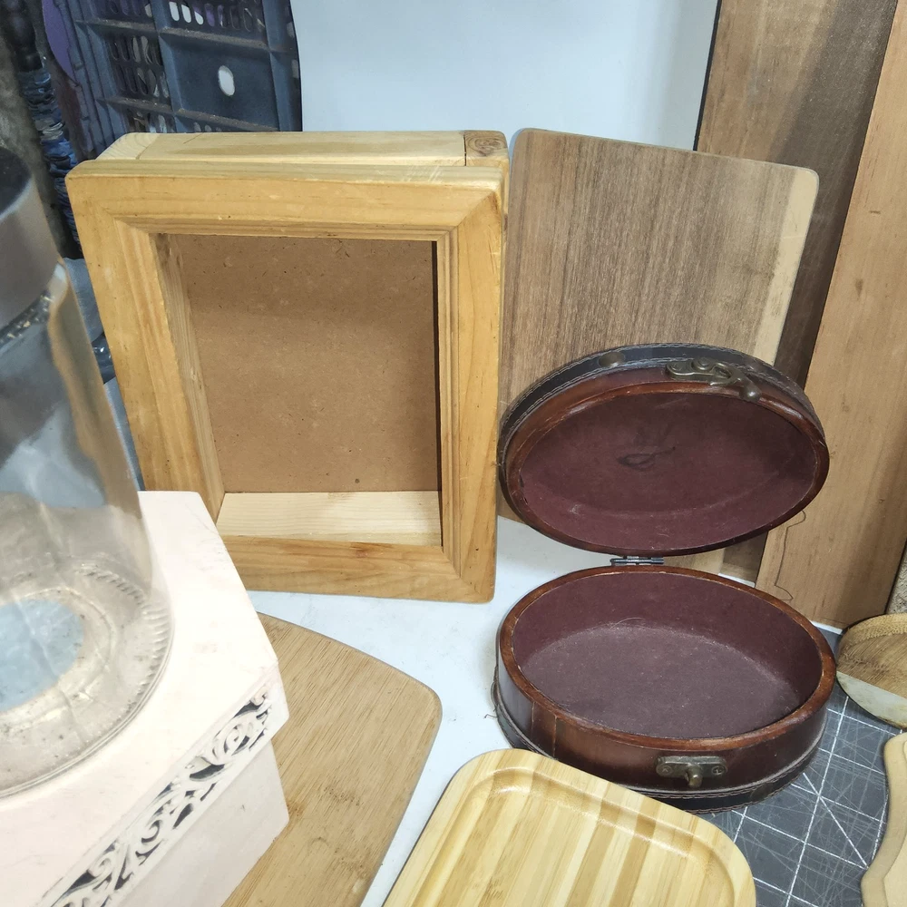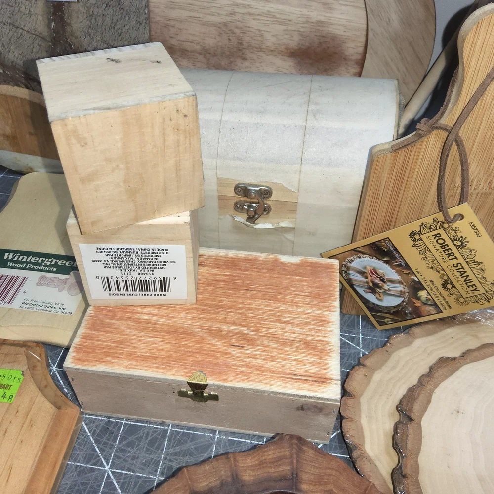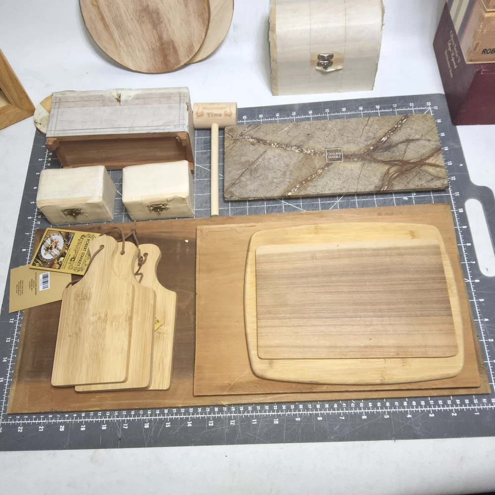 Can combine shipping on all orders. 46 wood crafting laser etching supplies upcycle blanks bases rounds cigar boxes My fellow creators/crafters/hoarders/etc., i bring you a collection of wooden pieces from thrift stores,yard sales,flea markets,etc. I bought them to mess around with on my laser machine. Sold it so don't need these anymore. Lots of goodies to create on,deconstruct, upcycle, reimagine, etc. I've sanded a few down to process on the laser machine. Others are taped off to mark where laser should engrave but never git to it so tape may be sticky. Some still have finishes like wooden bases. Some new pieces. Cigar boxes are made of spanish cedar and cut beautifully under a laser. Make tons of jewelry. 1 marble slab that has a small chip on the corner. All types of wood. Cherry,cedar,pine,bamboo(technically grass),oak 1 glass jar with metal top. All ready for you to monkey up. Packed and ready to go.