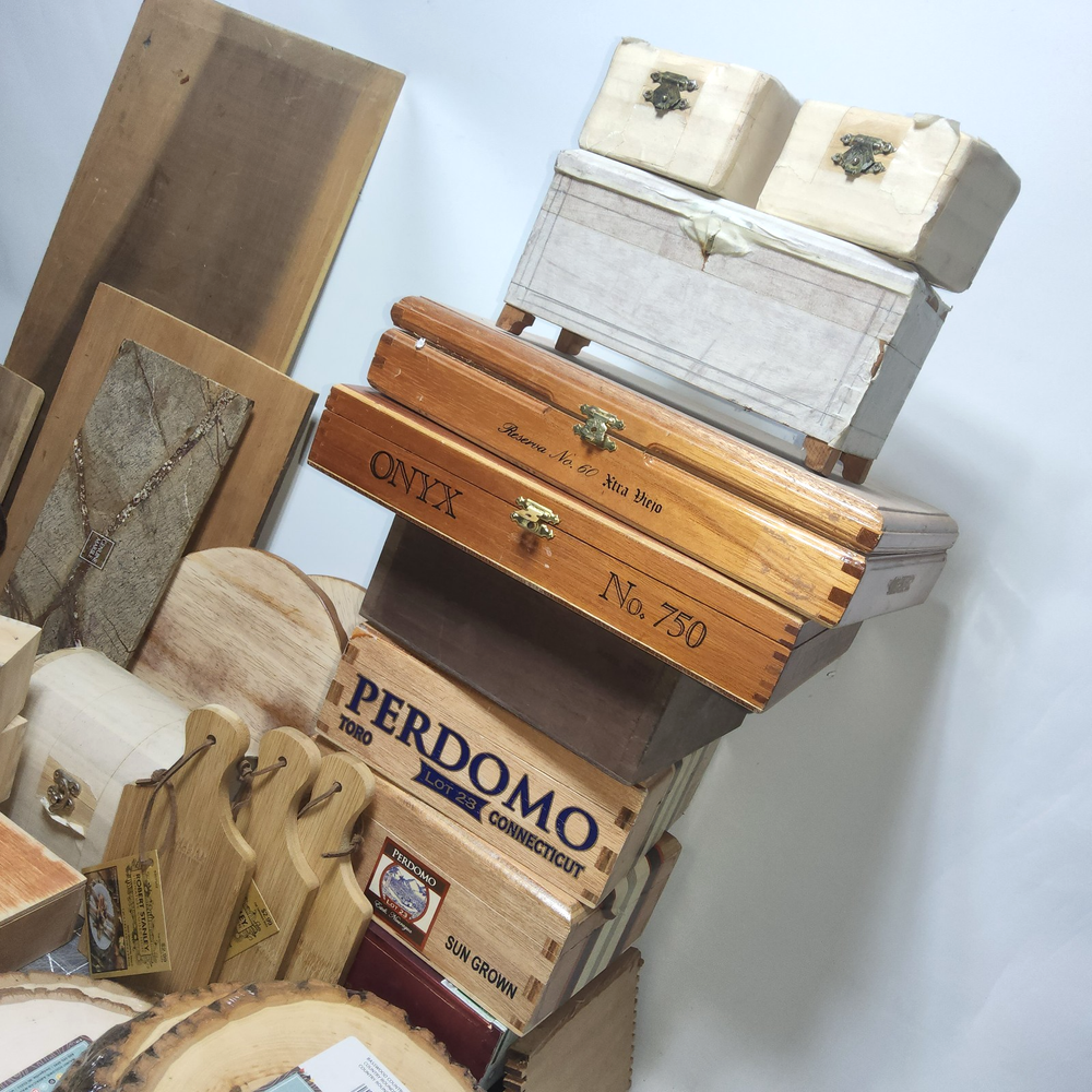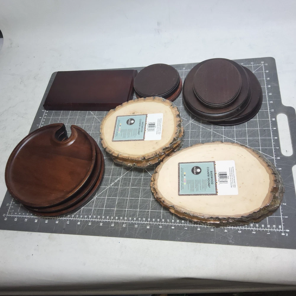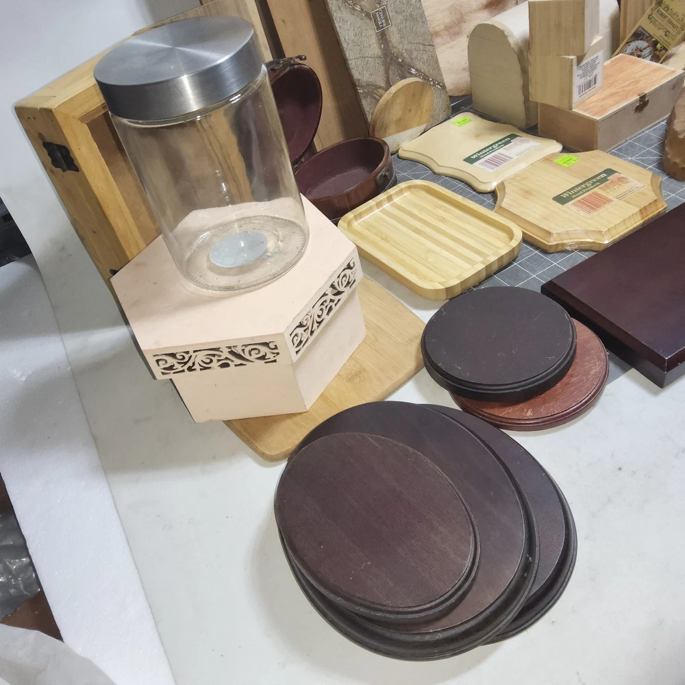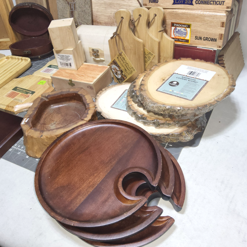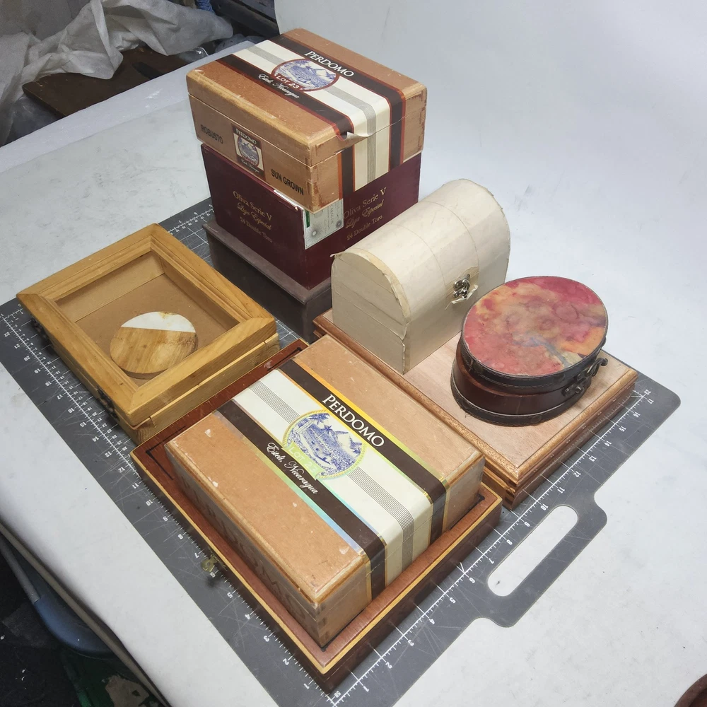 Can combine shipping on all orders. 46 wood crafting laser etching supplies upcycle blanks bases rounds cigar boxes My fellow creators/crafters/hoarders/etc., i bring you a collection of wooden pieces from thrift stores,yard sales,flea markets,etc. I bought them to mess around with on my laser machine. Sold it so don't need these anymore. Lots of goodies to create on,deconstruct, upcycle, reimagine, etc. I've sanded a few down to process on the laser machine. Others are taped off to mark where laser should engrave but never git to it so tape may be sticky. Some still have finishes like wooden bases. Some new pieces. Cigar boxes are made of spanish cedar and cut beautifully under a laser. Make tons of jewelry. 1 marble slab that has a small chip on the corner. All types of wood. Cherry,cedar,pine,bamboo(technically grass),oak 1 glass jar with metal top. All ready for you to monkey up. Packed and ready to go.