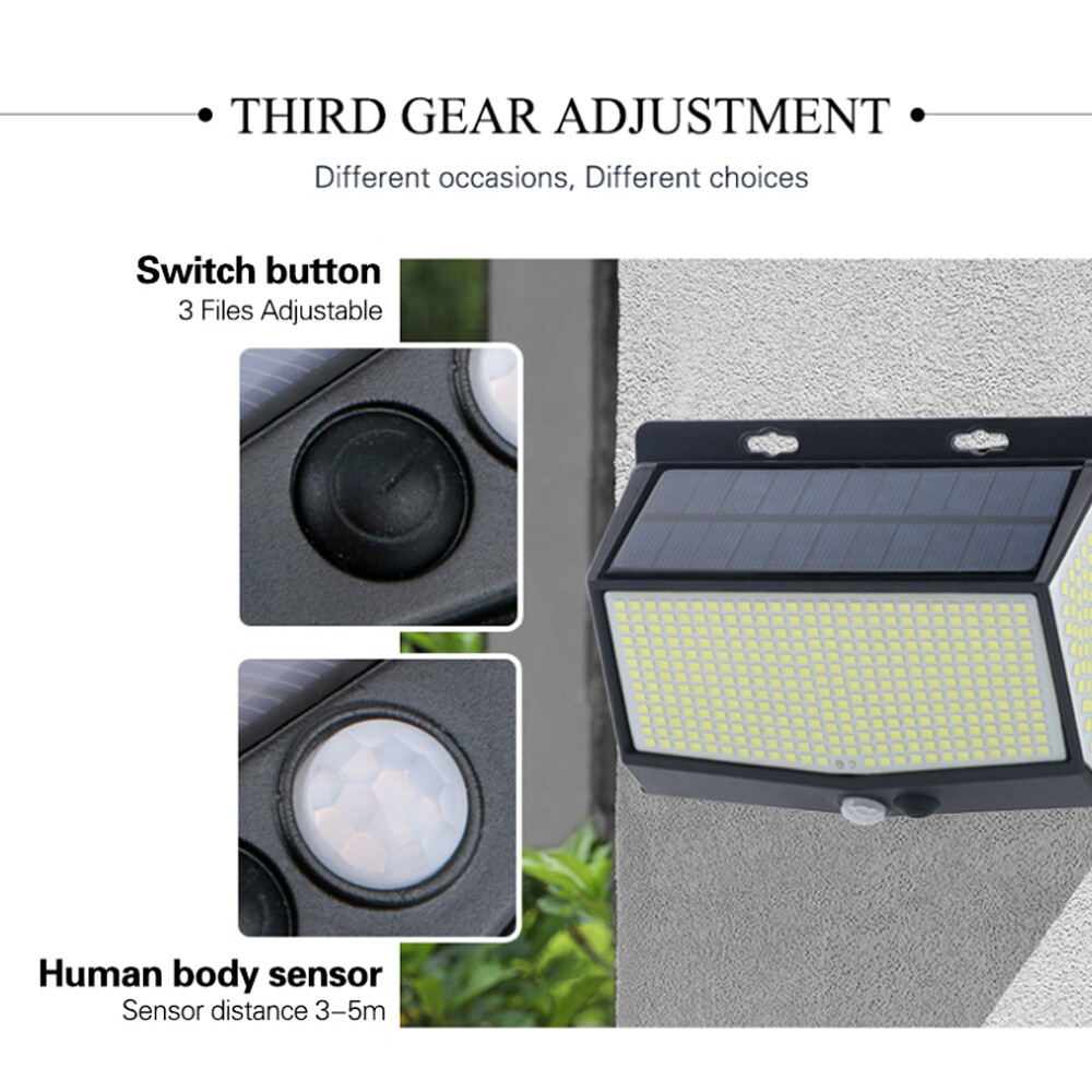【 Eco-friendly Product 】 468 LED solar wall light added indicator is a product that designed to be energy saving and environmental protecting. It has long durability and long-life span. More than that, it has low fault repair rate and high radiation stability which makes it an awesome product. 【 Easy to Install 】 468 LED solar wall light is very simple to install, no wiring is needed. Just find a spot and Adhere to the wall with the attached double-sided tape to the outdoor well sun-lit location. 【 Easy to use 】 468 LED solar waterproof four-sided human body induction wall light switch front setting is easier to operate. It has 3 setting which you can achieve by pushing the button in the middle. It has intelligent light-sensing sensor and wide range lighting angle. Description and Features 3 Modes Available - Mode 1. Medium Bright: When the night falls, the solar light will maintain 1/2 brightness. - Mode 2. Dim Bright + Full Bright : Slight brightness when no motion is detected. When motion is activated, it lights up in full brightness and turns back to slight brightness when motion is no longer detected. - Mode 3. No Bright + Full Bright : No brightness when no motion is detected. When motion is activated, it lights up in full brightness and turns back to no brightness when motion is no longer detected. - Can be widely used for garden, patio yard, deck garage, pathway porch in most kinds of weather. Weather Resistance - Our units are made of high-impact ABS which can withstand snow, rain and other extreme weather conditions. IP65 waterproof and heatproof, solar powered lights, suitable for most kinds of weathers. 300 ° Wide Angle -The solar wall lights by using exclusive 4-Side Built-in LEDs Wide-angle Lighting Design, the illumination range can be improved up to 300°. So, the coverage area has been upgraded almost three times than before. Sufficient Use Time - It can be used more than 10 hours after charging, which is more convenient. Packing list: Solar Light Screw English manual On Jan 8, 2025 at 03:12:10 PST, seller added the following information: