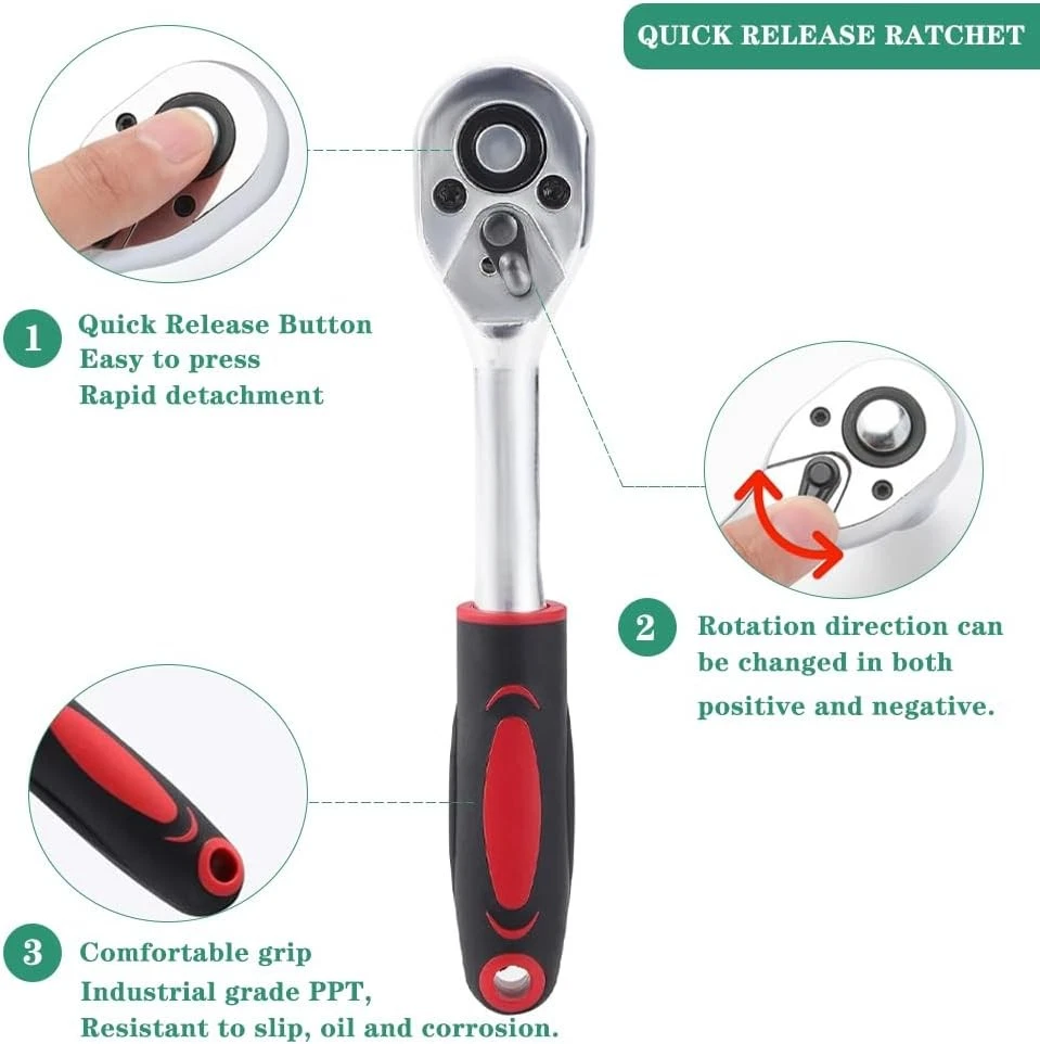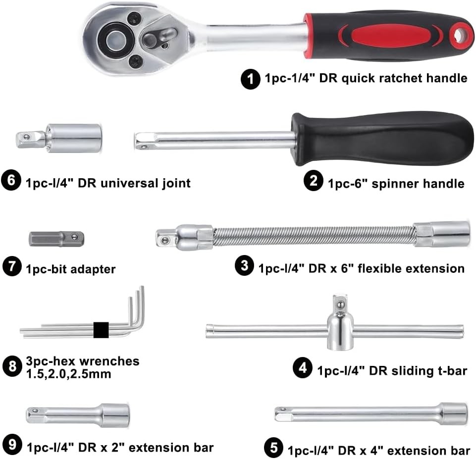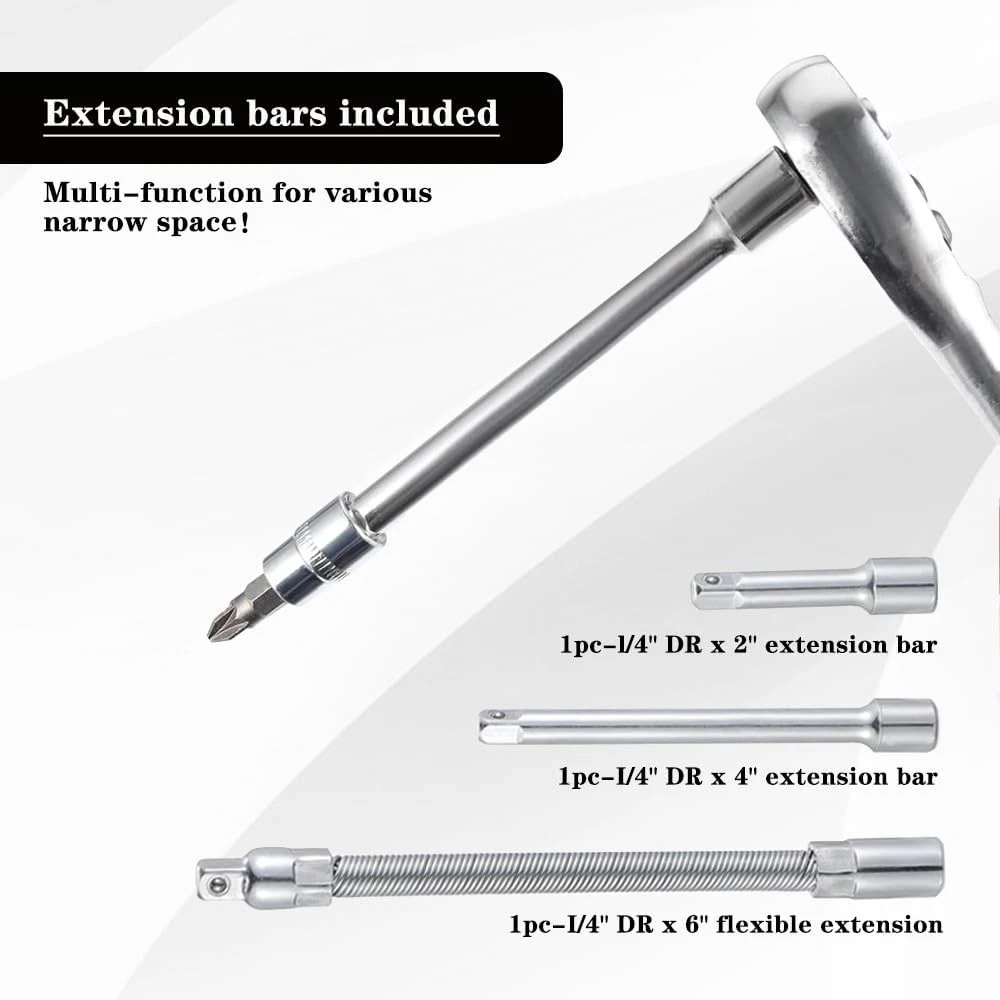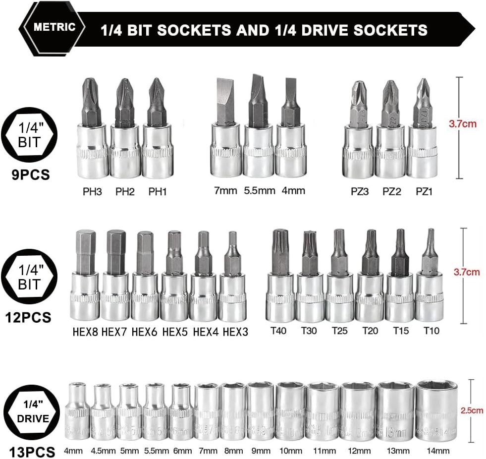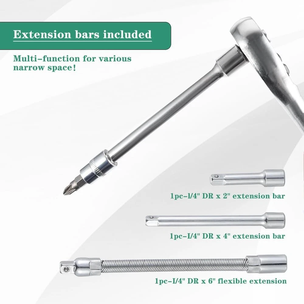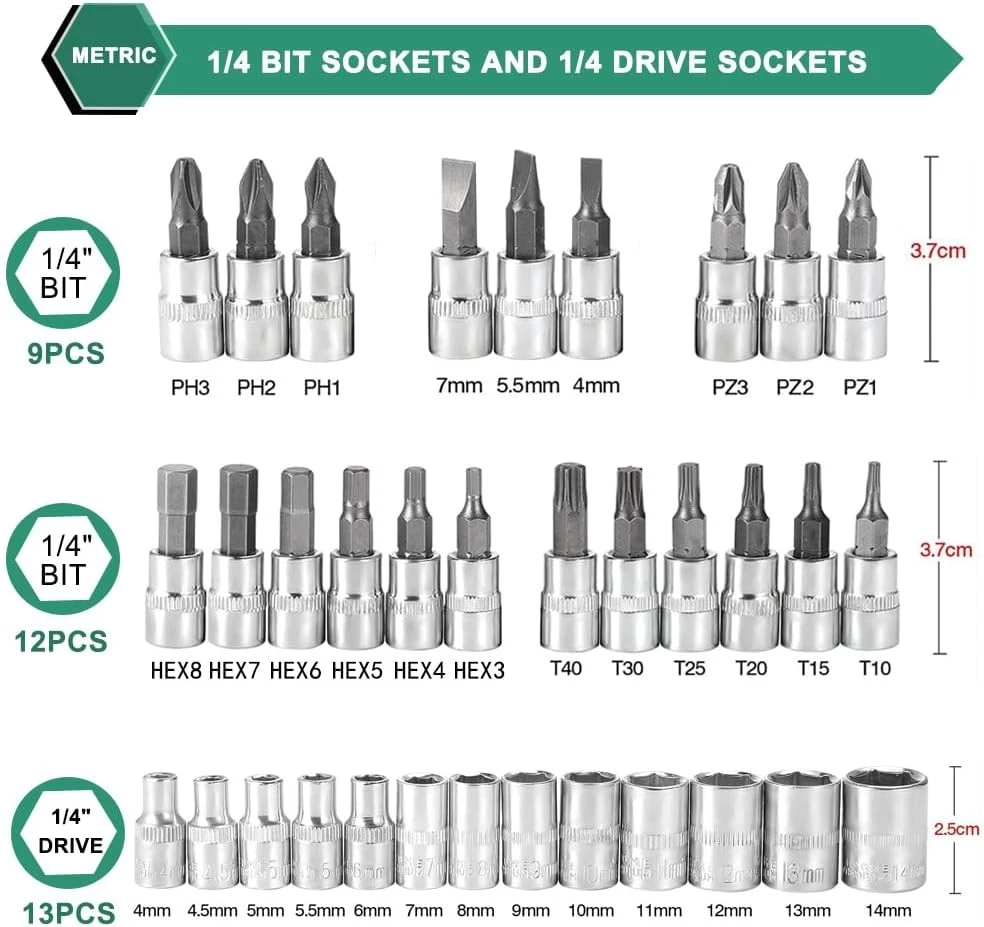 Fe ature : 【Quality First】Our tool set are all made from premium quality chrome vanadium steel alloy, greatly improves the strength and service life of the product,and the triple plating anti-rust treatment gives it excellent corrosion resistance. 【What you get】The set includes a handy toolbox containing socket set with 21 sockets in various sizes (SL4, 5.5, 7, PH1, 2, 3PZ1, 2, 3 HEX 3, 4, 5, 6, 7, 8 T10, 15, 20, 25, 30, 40). It also features 13pcs 1/4 DR metric sockets:4,4.5,5.5,6,7,8,9,10,11,12,13,14 mm and a 1/4 quick ratchet handle for ease of use. 【Multi extension bars】For versatility in different scenarios,this ratchet set included multi extension bars : 1pc 1/4"dr universal joint, 1pc 1/4"dr × 2" extension bar, 1pc 1/4"dr × 4" extension bar, 1pc 1/4"dr × 6" flexible extension, 1pc 1/4"dr sliding t-bar, 1pc 1/4"dr sliding t-bar, 1pc 6" spinner handle and 1pc-bit adapter. 【Easily Used and Storage】This set is user-friendly, featuring a quick release switch and reversible mechanism for easy operation, The rubber handle for better and more comfortable grip. The compact green toolbox makes the sockets easy to store and carry. 【Wide Application】 This socket wrench set is perfect for home improvements, woodwork, construction, bicycle and motorcycle repairs, car maintenance, and other DIY projects. Makes for a special gift for men on various occasions like Father's Day, Birthday or anniversary. Package Includes: 21pc-bit sockets: SL4,5.5,7; PH 1,2,3; PZ1,2,3; hex3,4,5,6,7,8; T10,15,20,25,30,40 13pc-1/4" DR sockets: 4, 4.5, 5, 5.5, 6, 7, 8, 9, 10, 11, 12, 13, 14 mm 3pc-hex wrenches: 1.5, 2.0, 2.5 mm 1pc-1/4"DR universal joint 1pc-1/4"DR × 2" extension bar 1pc-1/4"DR × 4" extension bar 1pc-1/4"DR × 6" flexible extension 1pc-1/4"DR sliding t-bar 1pc-1/4"DR quick ratchet handle 1pc-6" spinner handle 1pc-bit adapter 1pc-blow case Quality First Manufactured from high quality chrome vanadium steel to improve longevity, a full range of sizes are available for household use. Joints with 360 Degree Rotation 360-degree swivel joint allows easy bypass of obstacles. Extension Rods Extension bar cuts through obstacles to access tight spaces. Designed to Prevent Falling Safety locking design prevents dropping while working. Adaptor for Electric Drill Wearable hand drill adapters can be used with hand drills and sockets. Long Lasting Durability Our reversible drive sockets set are all made from premium quality chrome vanadium steel. Well Organize Plastic storage case keep all your sockets organized without a mess! Won't be lost anymore! Widely Application :Works on cars, appliances, machinery and other tasks requiring hex bit socket set. Many sizes choice provide more convenience.