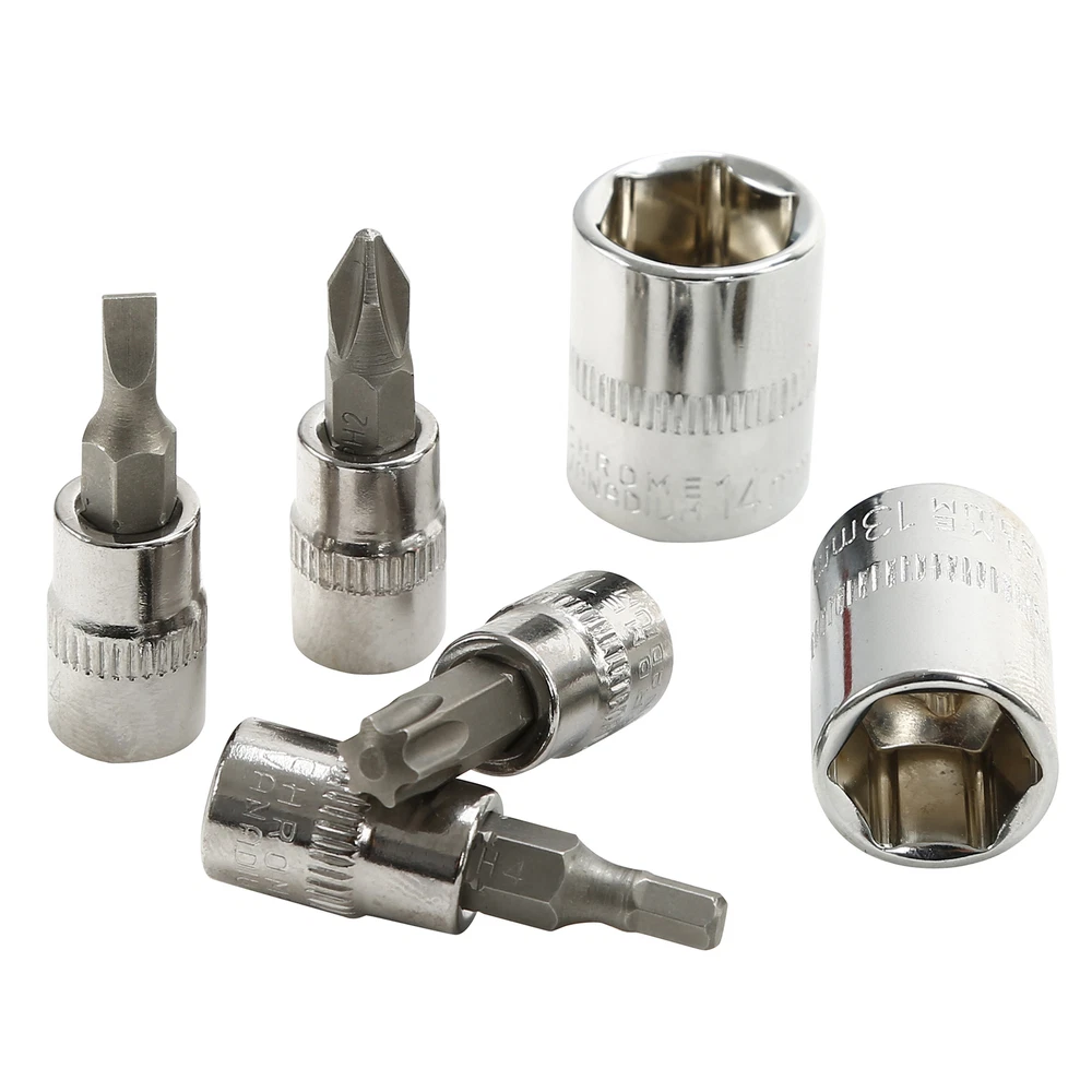 DESCRIPTION: Main Material: Chromium-vanadium steel This item is well made of premium material for durable and practical use. With high quality and precise design, it will ensure its popularuty and practicability. There are 46 pcs of tools that will meet all your needs. Perfect accessory kit for car owners. PACKAGE INCLUDE: 21PCS - BIT SOCKETS: SL4, 5.5, 7 PH1, 2, 3 PZ1, 2, 3, HEX3, 4, 5, 6, 7, 8 T10, 15, 20, 25, 30, 40 13PCS - 1/4"" DR SOCKETS: 4, 4.5, 5, 5.5, 6, 7, 8, 9, 10, 11, 12, 13, 14MM 3PCS - HEX KEY WRENCHES: 1.5, 2.0, 2.5MM 1PC - 1/4"" DR UNIVERSAL JOINT 1PC - 1/4"" X2"" EXTENSION BAR 1PC - 1/4"" X4"" EXTENSION BAR 1PC - 1/4"" X6"" FLEXIBLE EXTENSION 1PC - 1/4"" DR SLIDING T BAR 1PC - 1/4"" QUICK RATCHET HANDLE 1PC - 6"" SPINNER HANDLE 1PC - BIT ADAPTOR 1PC - BLOW CASE On Oct 14, 2024 at 08:35:18 PDT, seller added the following information: