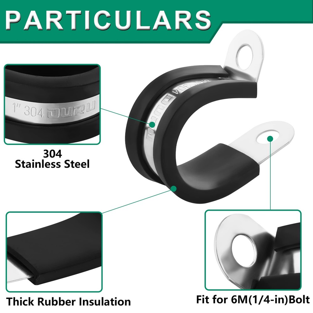 46PCS Big Size Cable Clamps Assortment Kit —The stainless steel cable clamps assorted box including 6 different sizes,12pcs 1/2”(13mm),8pcs 1"(25mm),8pcs 1-1/4”(32mm),6pcs 1-1/2”(38mm),6pcs 1-3/4”(45mm),6pcs 2"(51mm),various sizes are available to meet your needs Black Metal Cable Clamps-Each cable clamp is made of 304 high quality stainless steel with rubber coated cushioned.Excellent performance in abrasion,moisture,rust,cold and heat resistance even in harsh environments. It is strong and will not rust or break.It is the best choice for demanding indoor and outdoor Durable Rubber Insulated Wire Clamps-Used to fix and support pipes or wires and cables.The nylon rubber cushion on the cable clamp prevents damage caused by shock due to vibration,effectively protects the line and tube.Rubber insulation provides a safer installation.It can be firmly fixed in the right position,study and reliable Easy installation-The 46pcs garden hose pipe clamps kit(13-51mm) in a storage box for easy to carry and . With unique R-shaped design,flexible twisting and easy to control during installation,simple disassembly.You only need to use a screwdriver and screws to fix the clamps in the proper place,save time and effort.It can be recycled and reused,can be used for a long time Ideal for Application-The marine grade rubber p clamp.Used in automotive,industry,boat,outdoor,home decoration,DIY,RVs and any place where vibration may occur.Such as wires,cables,pipes,line management and repair