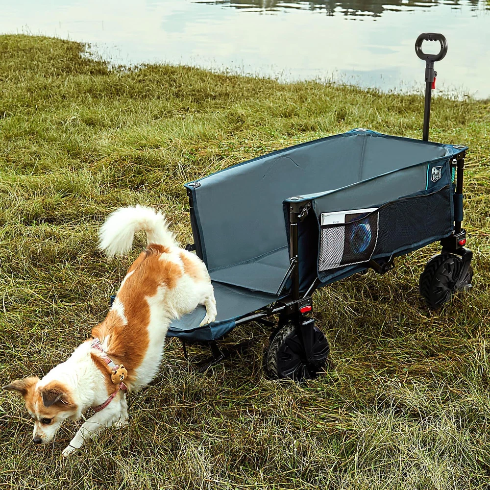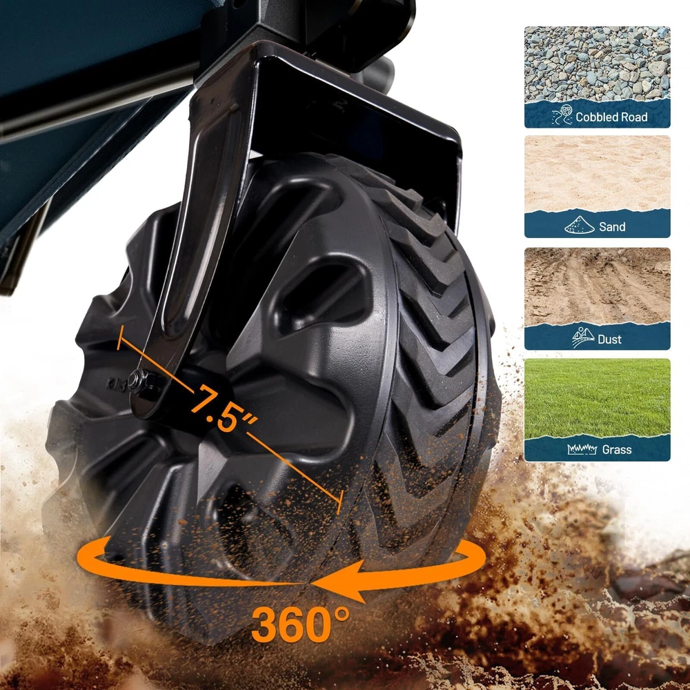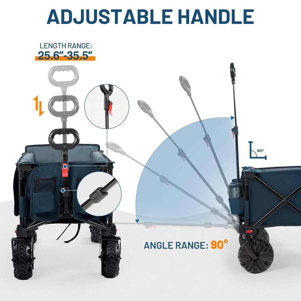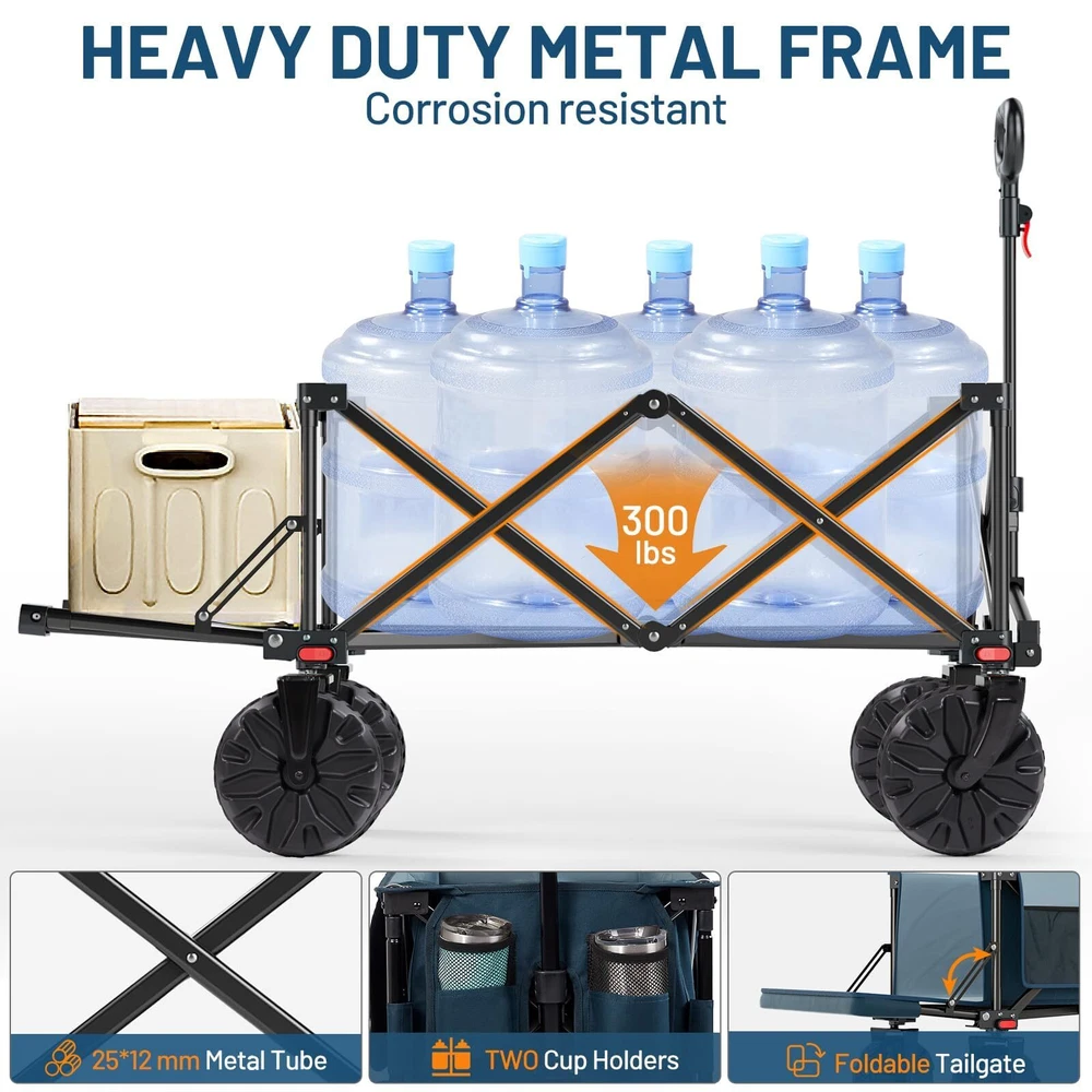 LONGER & SPACIOUS: This collapsible wagon features a foldable tailgate, great for a 10x10ft pop-up canopy, and offers a storage capacity of up to 200 L/7 cu.ft, 50% more than other wagons. It is also very friendly to pet dogs, able to get in and out easily ALL-TERRAIN WHEELS: Equipped with 7.5"x 3.4" big wheels, this beach wagon cart ensures easy maneuverability with 360° rotating front wheels, ideal for camping, shopping, or gardening without causing fatigue STURDY FRAME: Crafted with a heavy-duty alloy steel frame supporting up to 300lbs, and featuring long-lasting 500D Oxford fabric, this folding wagon is built to last; the mesh bottom allows for easy cleaning with water AMPLE STORAGE: The heavy duty wagon includes 2 cup holders and oversized side pockets for convenient storage; the utility cart handle can be adjusted from 25.6" to 35.5" to accommodate different heights, ensuring a comfortable experience QUICK FOLDING: No assembly required, simply lift from the bottom and fold away in seconds; with a compact size of 13.8 "x9.5 "x30.3", it can be stored easily in a suitcase, garage, or closet for convenient transportation BELIEVE US: At , each product is meticulously crafted with care and supported by our dedication to ensuring customer contentment. Should any concerns arise, our assistance is readily available