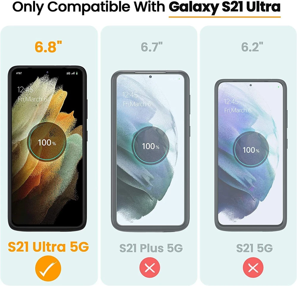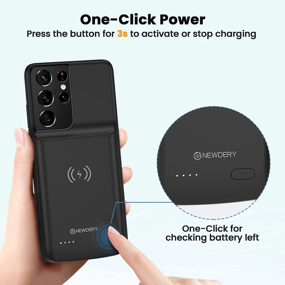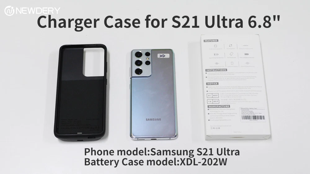 Only for Samsung s21 ultra 6.8 inches NEWDERY Rechargeable Protective Battery Pack Charger Case 4700mAh Compatible With Samsung S21 Ultra 5G 6.8 1. Only for Samsung s21 ultra 6.8 inches, not for s21 6.2 inches, s21 plus 6.7 inches, or other phone models. 2.Built in 4700mAh Lithium ion battery, add extra power to your phone. 3.Support Simultaneously Charge, Phone Charge First. 4.Qi wireless charging & Bluetooth headsets support. 5.This s21 ultra charger case is not waterproof. please use only in dry environments. 6.Certificated by CE, FC and Rohs. This is a portable product that can be carried on the plane. 7.Power your phone anywhere, anytime. Full Protection: Camera protection Soft rubber part Hard shell backplane Raise-Edge Protection Inner face soft fabric Hard shell backplane and raise edge protect your phone from scratch, wear and tear. Built in smart chip: Smart LED Indicator One-click the power button to track the remain power of the Samsung s21 ultra charger case. The light will flash when slim power bank charges your phone. After the samsung s21 ultra battery case is full charged, the led doesn't flash Protect your phone from overcharging, short-circuiting, over voltage, and over current. Provide a safe and effective charging environment for your mobile phone Lightweight And Easy To Hold Lightweight and ultra-slim design for your comfort gives you no hassle carrying it around. Goes right in your pocket, and hold it on your palm. It is comfort to the touch and not slippery whatever. What you get 1*Samsung Galaxy S21 Ultra Battery Case 1*User Manual