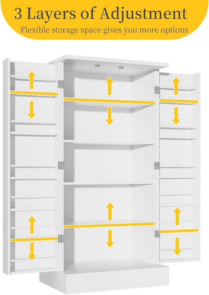 Product Description About this item • 【Adjustable Shelves】This pantry cabinets for kitchen storage has two 6-level shelves and one 5-level compartment, 4 shelves that can be adjusted in 3 levels to meet your individual needs Color: White Recommended Uses: For ProductDish, Pans, Pots, Crockery, Utensils, Kitchen Appliances, Tableware, Cutlery, Detergent, Wipes Product Dimensions: 16"D x 24"W x 47"H Special Feature: Waterproof, Durable, Adjustable Shelf