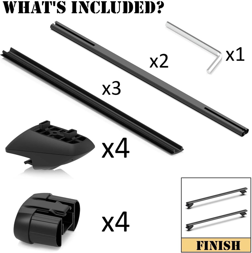 Raised Rail Fit: Our roof rack cross bars are adjustable from 30.7 inches to 44.8 inches, flexibly compatible with cars, vehicles and SUVs with raised side rails with a gap between 30.7 and 44.8 inches Bring You Durability: Cross bars is made from powder-coat finish aluminum, which means scratch resistance, anti-corrosion, and can be used for many years. Clamp stand bases with rubber pads secure your cross bars firmly on the vehicle side rails and protect the vehicle from scratching Expand Car Capacity: It's sturdy enough to carry up to 165 lbs (75 kg). It will free up the inner space of your vehicle and maximize the storage possibility of your vehicle to load camping gear, luggage, fishing poles, bikes, snowboards, skis, and other rooftop accessories and ensure you enjoy outdoor adventures to the fullest Easy Installation & Removal: The crossbars come with a detailed instruction manual, which help you install them in a few minutes. Just simply align with the preset holes of the vehicle side rails and install the roof racks with the attached wrench. We also has an installation video and it shows you the installation steps clearly Notes: Please make sure it fits your vehicle before purchasing! For safety when carrying long large accessories such as surfboards or skis, please use special racks and fixing devices to secure them to the rack. This slim cross bar is not suitablefor use with two lift racks products! (We can recommend pro series)