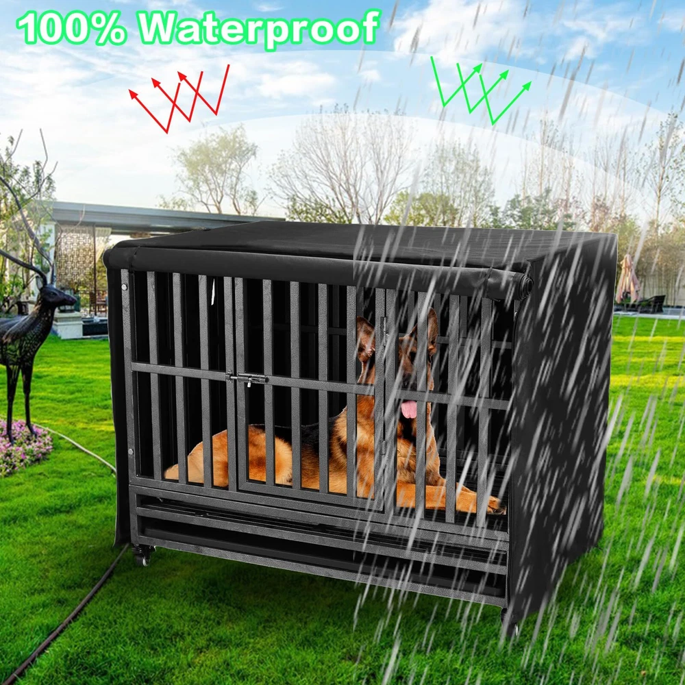 Fits Perfectly:The dog crate cover snugly fits over your dog's 36-inch crate.Crate cover dimension: 48.82L x 31.89W x 34.25H inch.This dog kennel cover is designed specifically for heavy duty dog crates. The dog crate cover is also versatile enough to fit most brands of standard 36-inch wire crates.(Only Cover, Without Crate) 100% Blackout & Privacy:The dog crate covers block 100% of light.The crate cover provides a quiet, private, relaxing and cozy environment for your dog. The dog crate covers makes your dog more relaxed and calm. Prevents your pet from feeling anxious during times of stress or when there is a lot of noise around.The dog kennel cover is also resistant to spills and splashes. Premium Material-600D oxford:The dog crate cover is made of heavy-duty sun-proof 600D Oxford fabric. The surface of the kennel cover is covered with PU coating, which is very wear-resistant and can prevent pets from scratching and causing damage. And this crate cover is windproof and waterproof. Compared with PVC type dog cover, our dog crate cover is more breathable, softer, not easy to tear and durable. The crate cover can block most of the direct sunlight. Ventilation & Breathability: This dog crate cover has an entrance door on the front facade and a window on the side . Adjustable sight lines and ventilation with breathable side windows to ensure air circulation. Easy to Install:All you need to do is place it on the dog crate. Then secure the four side loops to the dog crate to complete the installation. The dog crate cover is equipped with a roller blind for adjustable visibility and ventilation