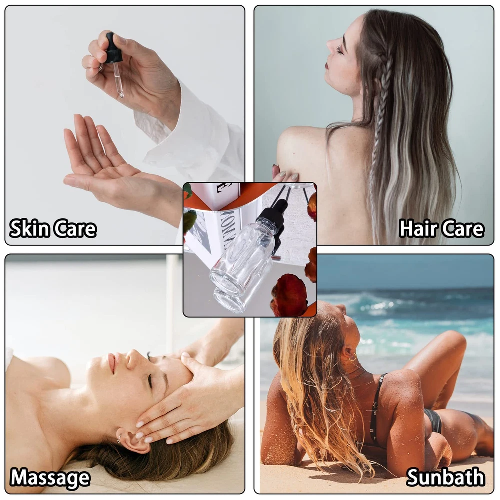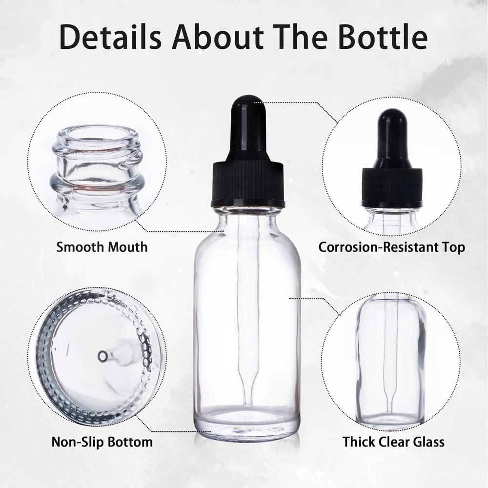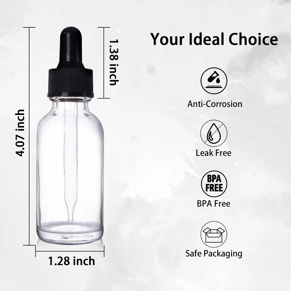 Package List: 48 Pack 1 oz (30 ml) Clear Glass Dropper Bottles, 2 Extra Glass Eye Droppers, 1 Brush, 2 Funnels, 1 Measuring Cup (30ml) and 54 Pieces Labels. Premium Quality: These essential oil dropper bottles are made of thick, sturdy-feeling glass, wear-resistant and corrosion-resistant, can be used repeatedly. Also, our clear bottles feature high-transparency glass walls, allowing you to see the liquid clearly. Great Use: The glass dropper with a thick silicone top makes it easy to suck up and dispense accurate amounts of liquids without waste. And the dropper cap can fit tightly with the bottle mouth, effectively preventing any liquid leakage. Ideal Travel Bottles: The clear glass bottle is light and compact, easily fits into your handbag or purse. It is convenient for you to carry essential oils, hair oil, perfume, aromatherapy products or any precious liquids for sunbath, massage, hair salon and so on. Complete Accessories: 2 funnels and 1 measuring cup (30ml) help accurately fill the liquid into bottles. 54 labels are good for marking different liquids. The brush allows you to clean the bottles easily, and bonus 2 droppers for replacement. The glass bottles and accessories are packaged carefully with a foam tray, if they still get broken, please contact us. Thanks!