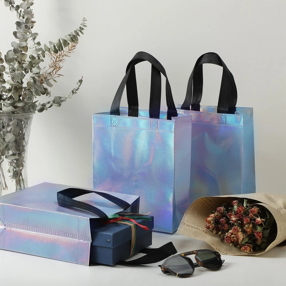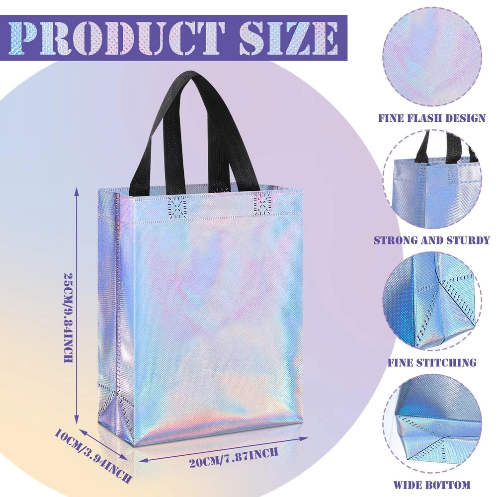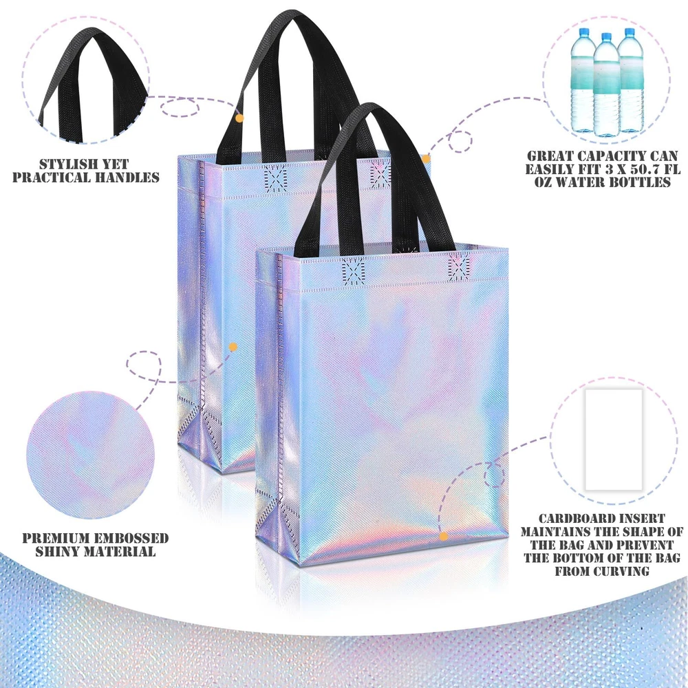 Features: Ideal tool for gift packaging: Shiny colors of the reusable tote bags with handles can quickly attract people's attention. When others receive your gift packaged in these packages, they will make people feel your caring. Wide applications: In addition to being applied for wrapping gifts, the party favor bags with handles can also be applied in daily life. They are good companions for you to , documents, and go out for fun. Specifications: Material: non woven fabric Color: holographic Size: approx. 8 x 4 x 10 inches/ 3.15 x 1.57 x 3.94 cm (width x depth x height) Package includes: 48 x Reusable gift bags Notes: Manual measurement, please allow slight errors on size. The color may exist a slight difference due to different screen displays. Ample Quantity: you will receive 48 pieces of bulk tote bags, designed in black handles, which are sufficient to meet your daily packaging and needs, bringing convenience to your life Reliable Material: made of quality non woven fabric, the flash shopping bag is lightweight and structurally durable, reusable and foldable; It is easy to carry around helping you reduce the burden of shopping and storage Proper Size: each of shiny gift bags is approx. 8 x 4 x 10 inches/ 3.15 x 1.57 x 3.94 cm in width, depth and height, which is convenient to hold a lot of items, such as fruits, vegetables, daily necessities, umbrellas, clothes and so on Waterproof Film: the surface is covered with a waterproof film, which can be slightly waterproof in rainy weather to secure your items while the film can enhance the texture of the bag, be careful not to get too wet Not Easy to Deform: the reusable gift bags with handles are equipped with cardboard pads at the bottom of the bag to prevent the bottom from being broken, and it can effectively fix the basic shape even if it is not loaded