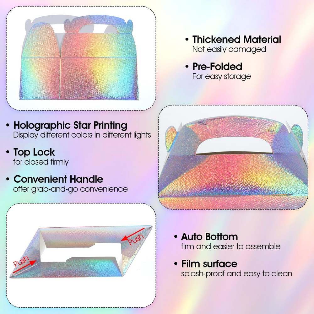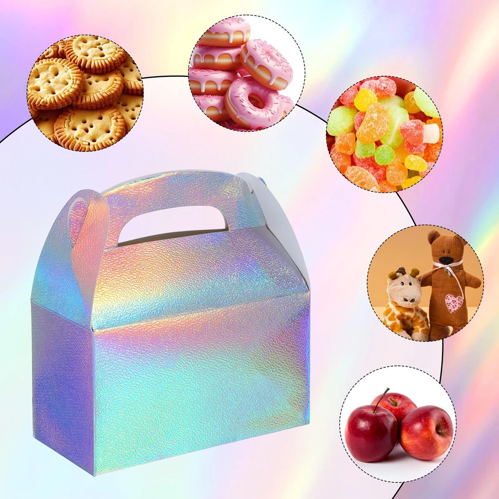 Features: Stunning 48-piece set of iridescent party favor boxes, designed to elevate any celebration with their mesmerizing holographic finish. These gable boxes are perfect for party favors, birthdays, weddings, and more, offering a unique and eye-catching way to present your gifts. The rainbow gift bags are not only visually appealing but also durable, Surface waterproof, and oil-repellent boxes are perfect for securing snacks, desserts, or crafts, ensuring your treats are securely stored. Specifications: Color: Iridescent Material: Cardboard Dimensions: 16x9x8.5 cm/6.3x3.5x3.3 inches Packaging List: 48 x Iridescent Party Favor Boxes Notes: Manual measurement, please allow 1-2cm error exists. The color may have color difference due to different monitors. Sparkling Goodie Boxes: includes 30 piece of iridescent party favor boxes, features a captivating holographic design, perfect for birthdays, weddings, and festive celebrations. Iridescent treat boxes are ideal for snacks, candy, toys or crafting gifts Durable: Each gable measures 6.3" x 3.5" x 3.3", providing ample room for party favors, toys, and treats. These candy boxes are made from sturdy and recyclable cardboard , sturdy and reliable, shiny favor boxes will make your presents stand out Pop-Up Design: Designed with a convenient pop-up bottom, these gable boxes for party favors are easy to assemble, saving time on party setup. Includes handles for convenient carrying, of the best rainbow gift bags for any special event Versatile Treat : These party favor boxes can be personalized with stickers, ribbons, graffiti, draw or tags, allowing you to create unique goodie boxes for your guests. Decor your party with shiny cardboard boxes that everyone will love Celebration Essential: Whether it's a , wedding, Christmas, or any festive occasion, these holographic bags are a must-have for creating memorable party experiences. Elevate your event with these stunning candy boxes, bring a classy and festive touch to your party