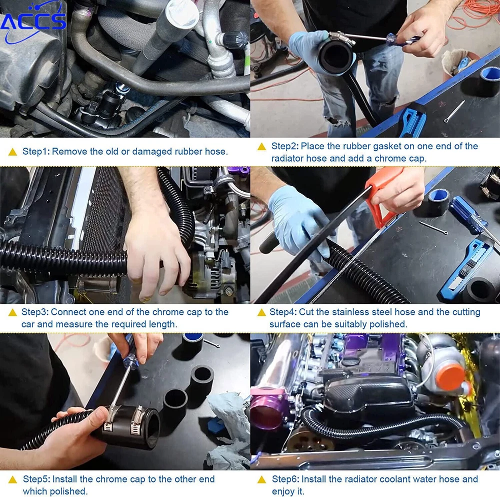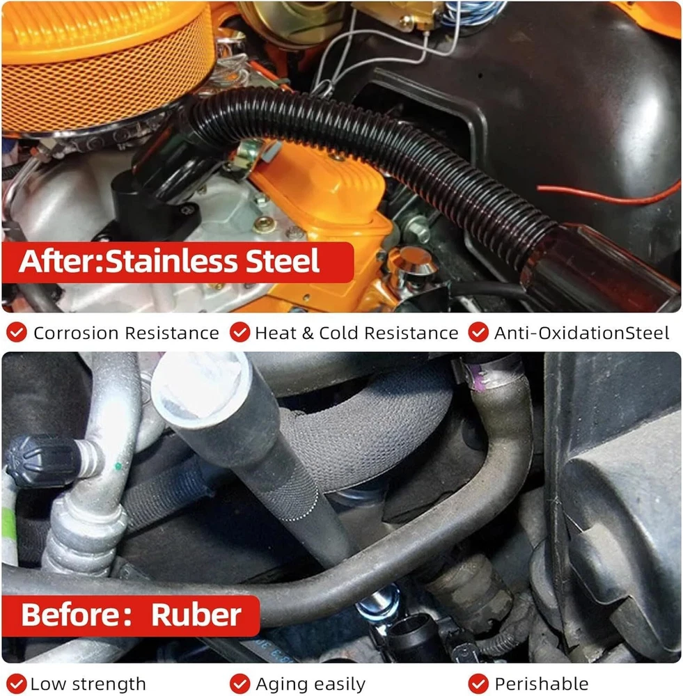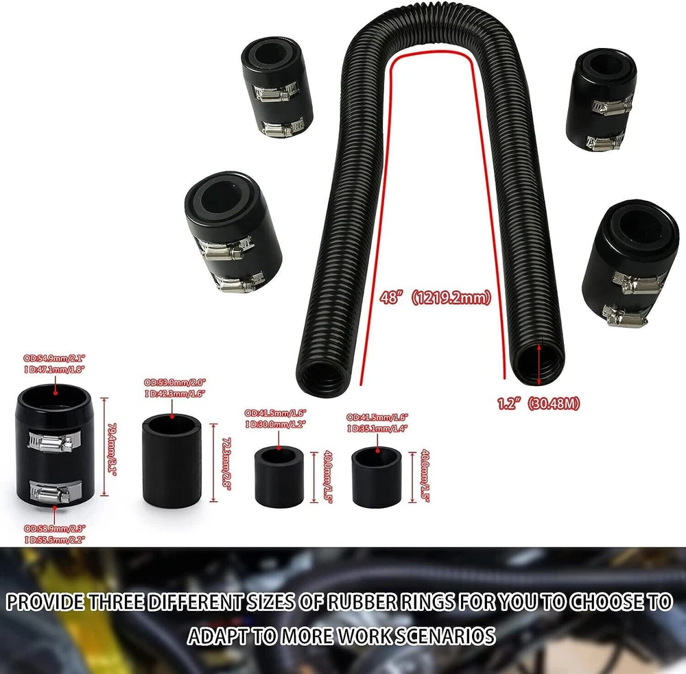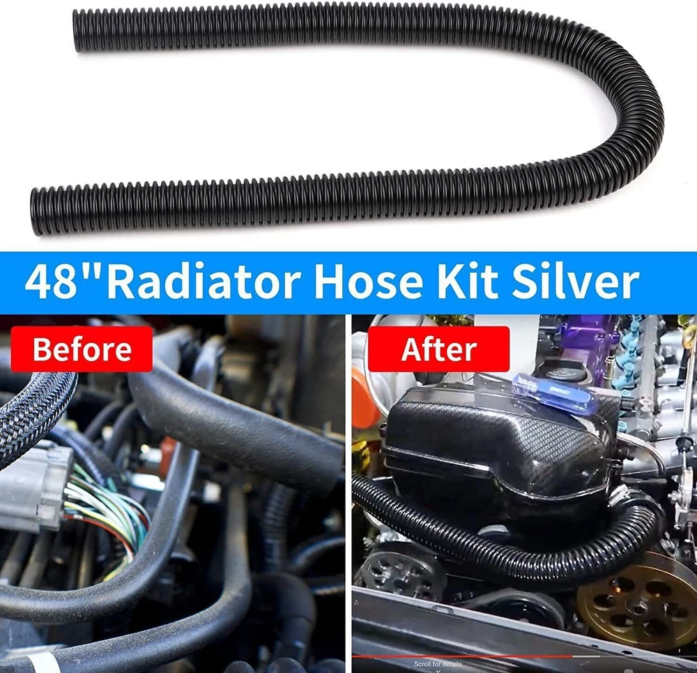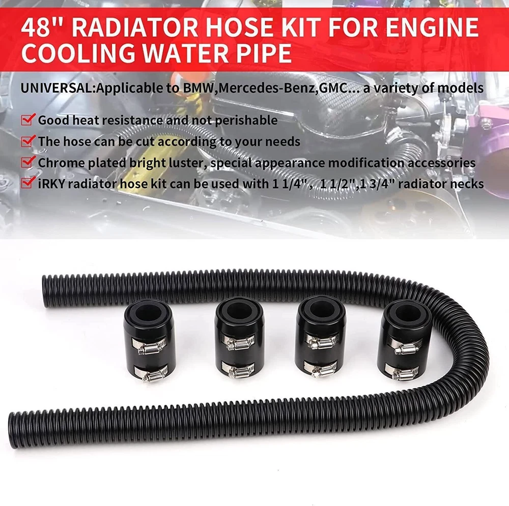 48" Stainless Steel Radiator Flexible Coolant Water Hose w/ Caps Kit Universal Item Description Quality Assurance: Coolant Water Hose Kit is made of aluminum alloy and stainless steel. Compared with rubber hoses, it has better heat resistance, better heat resistance, and is not perishable. Appreciation: Replace the hose of the original car, chrome-plated to a beautiful luster, dedicated to the appearance of modified accessories, open the cabin will have a different surprise MATERIL QUALITY: Made from extremely high quality stainless steel, Coolant Water Hose Kit has better heat resistance, better heat resistance, and is not perishable, will not blow or rot out like a rubber one. INSTALl EASYILY: These hoses can be formed by simply bending them to the desired shape, flexible design eliminates the hassle of finding a rubber hose with just the right bends, The hose can also be cut to the required length as you need. APPLICATION FEATURES: This radiator hose kit can be used with 1 1/4", 1 1/2", 1 5/8" radiator necks(Universal) COMPREHENSIVE SERVICE: 100% brand new Stainless Steel flex radiator hose, 90 Day Warranty, Buy with confidence! If problem in the year quality 90 Day time, please do not hesitate to contact us for a free and easy replacement or refund. Features Material Quality: Made of high quality stainless steel, the cooling water hose kit has better heat resistance, better heat resistance, not easy to rot, will not blow out or rot like rubber. Easy to install: These hoses can be formed by simply bending them into the desired shape, the flexible design eliminates the hassle of finding rubber hoses with the correct bend, the hoses can also be cut to the desired length as needed . Application Features: This radiator hose kit can be used with 1 1/4", 1 1/2", 1 3/4" radiator necks (universal) Comprehensive service: 100% brand new stainless steel flexible radiator hose, 3 months warranty, buy with confidence! If there is a problem within the three-month quality warranty period, please feel free to contact us. 48-inch Radiator Hose Compared with rubber hoses, stainless steel radiator hose has better heat resistance, better heat resistance, and is not perishable. 4pcs Chrome Caps & Clamps The rubber hose sleeve adapters and reducers allow the hose to be used with 1-3/4", 1-1/2", and 1-1/4" hose connections. Flexible Shape Its shape can be changed according to the conditions of your car. Cut as much as you use The 48-inch length can also be cut to your ideal length. Specifications Condition:100% Brand New Warranty: 90 Day Free Return:30 Day Material: Stainless Steel Color: Black / Silver This product is available in two styles: black and silver. Please leave a message to let me know your preferred color. Fitment UNIVERSAL:Applicable to BMW,Mercedes-Benz,GMc... a variety of models First select and connect the appropriate size reducers separately, and finally connect the clamps. Package Included 1 Pc Stainless Steel Flex Hose, 48 in. length, 1 5/8" O.D. 4 Pcs End Cap Covers, Chromed Aluminum 4 Pcs Rubber Hose Sleeve Adapters, 1 3/4" I.D. 4 Pcs Rubber Reducers, 1 1/4" I.D. 4 Pcs Rubber Reducers, 1 1/2" I.D. 8 Pcs Hose Clamps As pictures show FAQ: I purchased by mistake, how do I cancel the order? Please contact us ASAP. If the item has not been shipped out we can cancel the order for you. If the item was shipped out you can refuse the package and wait for the item to return to us. I received your item but it does not fit or is defective Please contact us so we can assist you on the matter. Buy with confidence Our quality is based on meeting the requirements of the manufacturer and improvement them in design problems manufacture. NOTE: (1)It would be highly appreciated if you might contact us first once you have any problems concerning the items. And you can expect all the issues would be resolved ASAP! (2)Please let us know before you send us the neutral/negative feedback that wont help to finish the issues. And I will definitely try my best to provide the best solutions which would meet our satisfactory! (3)According to the distance of the receipt address items would be sent from CA or NJ