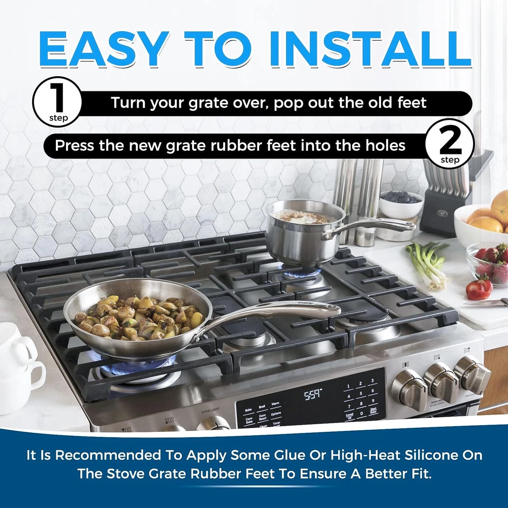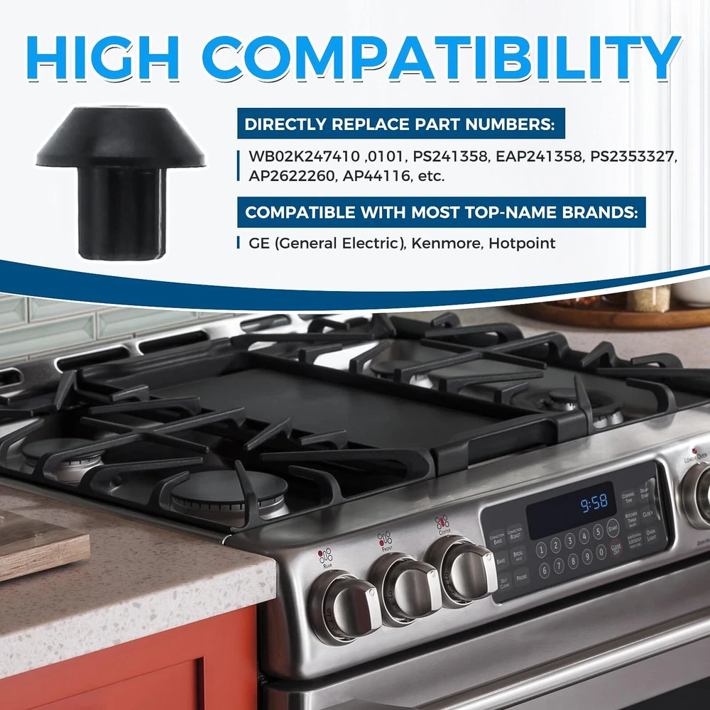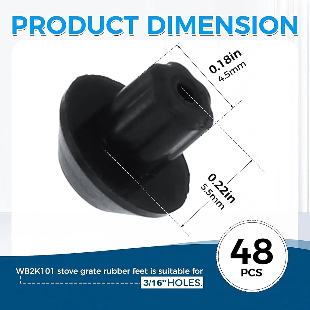 48 Stove Gas Range Grate Rubber Feet Bumper For Kenmore Hot-Point KitchenAid Pad [๐๐ซ๐๐ฆ๐ข๐ฎ๐ฆ ๐๐๐ญ๐๐ซ๐ข๐๐ฅ]: These WB2K101 small stove grate rubber feet replacements for GE / Ken-more / Hot-point is made of wear resistant and heat resistant rubber, which is rigorously tested by the manufacturer and meets OEM design and quality [๐๐จ๐ฆ๐ฉ๐๐ญ๐ข๐๐ข๐ฅ๐ข๐ญ๐ฒ]: Our WB2K101 range grate rubber feet replacements are compatible with most brands: GE (General Electric), Kenmore, Hotpoint, and can replace part numbersWB02K0101 WB02T10461 AP2622260 PS241358, etc [๐ ๐ฎ๐ง๐๐ญ๐ข๐จ๐ง]: The worn burner feet can cause scratches on your gas hob then affect its appearance. Our small rubber feet replacement for GE attached to the bottom of the burner grate can prevent scratches on the cooktop and stabilize your pans, ensuring your grates remain balanced. [๐๐๐ฌ๐ฒ ๐ญ๐จ ๐๐ง๐ฌ๐ญ๐๐ฅ๐ฅ]: What you can do is to turn your grate over, then pop out the old feet and press the new grate rubber feet into the holes. It is recommended to apply some glue or high-heat silicone on the stove grate rubber feet to ensure a better fit. [๐๐๐๐ค๐๐ ๐ ๐๐ง๐๐ฅ๐ฎ๐๐๐]: You will receive 48 pack WB2K101 range grate rubber feet replacements for GE. The ruber bumper has 5mm/0.18" in shaft diamter, and 6mm/0.22" in shaft length, fitting in a 3/16" hole. There is a 1mm vent hole in the center of the footpad. (Note: Please double check the size and model before making the purchase.) It is no doubt this is a nice choice for you stabilize your grates. Compatible Brands & Models Fit for GE EGR2000EC1BB, EGR3000ED0BB, EGR3000EH1BB, EGR3001ED1SS, EGR3001EF1SS, EGR3001EH1SS, J2B900BEF1BB, J2B900CEF1CC, J2B900SEF1SS, J2B900WEF1WW, J2B912BEK3BB, J2B912CEK3CC, J2B912SEL2SS, J2B912WEK3WW, J2B918BEK5BB, J2B918SEK1SS, J2B918SEL2SS, JGB282DET2BB, JGB282EED1ES, JGB282SET1SS, JGB296DET1BB, JGB296DET1WW, JGB296DET2BB, JGB600SET1SS, JGB605DET1BB, JGB605EED1ES, JGB605SET1SS, JGB650DEF2WW, JGB650EEF2ES, JGB650SEF1SS, JGB750DEF1BB, JGB750EEF1ES, JGB810DET1BB, JGB840SET2SS, JGB850DEF1BB, JGB870DEF1BB, JGB908BEK6BB, JGB920KEC1CC, JGBP28BEA2CT, JGBP29DEM1BB, JGBP32BEJ1BB, JGBP33BEH1BB, JGBP35AEA5AA, JGBP40BEC1AD, JGBP79AEB2AA, JGBP85AEB2AA, JGBP86BEL3BB, JGBP87BEL3BB, JGBP88BEL3BB, JGBP99BEH1BB, P2B912DEM2BB, P2B918DEM2BB, PGB908DEM2BB, PGB910SEM1SS, PGB916DEM2BB, PGB916DEM2WW, PGB916SEM2SS, PGB918DEM2BB, PGB918SEM2SS, PGB975SEM1SS, etc. Fit for Hotpoint RGB845BEC1WH, RGB845BEC2WH, RGB845BEC3WH, RGB845WEC1WW, RGB845WEC2WW, RGB845WEC3WW, RGB845WEC4WW, RGB845WEC5WW, etc. Fit for Kenmore 36275521000, 36275528000, 36275701001, 36275701002, 36275702001, 36275702002, 36275707001, 36275707002, 36275708001, 36275708002, 36275990001, 36275990002, etc. NOTE: Not all models are included. If you are not sure whether this range grate rubber feet fits for your model, you can ask us. Shipping We offer FREE shipping on all orders! We ship within Three business days of payment, usually sooner. We use a selection of shipping services such as UPS, FedEx, USPS etc. We only ship to the lower 48 states, no APO/FPO addresses or PO Boxes allowed. Local pickups and combined shipping options are not provided at this time. Return You can return a product for up to 30 days from the date you purchased it. Any product you return must be in the same condition you received it and in the original packaging. Please keep the receipt. Payment We accept payment by any of the following methods: PayPal Please pay as soon as possible after winning an auction, as that will allow us to post your item to you sooner! Feedback Customer satisfaction is very important to us. If you have any problem with your order, please contact us and we will do our best to make you satisfied. Contact Us If you have any queries, please contact us via ebay. We usually respond within 24 hours on weekdays. Please visit our eBay store to check out other items for sale! Thank you for shopping at our store.