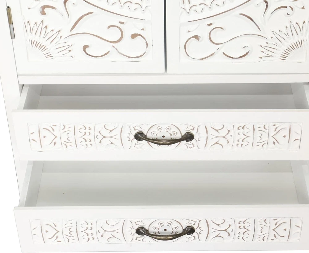 This stunning cabinet adds elegance and function to any room! The intricate carved doors and spacious shelving make it perfect for displaying decor while keeping things organized. Solid wood and MDF construction ensure durability, and its compact size fits beautifully in tight spaces. Love how it elevates my home’s style while offering practical storage!