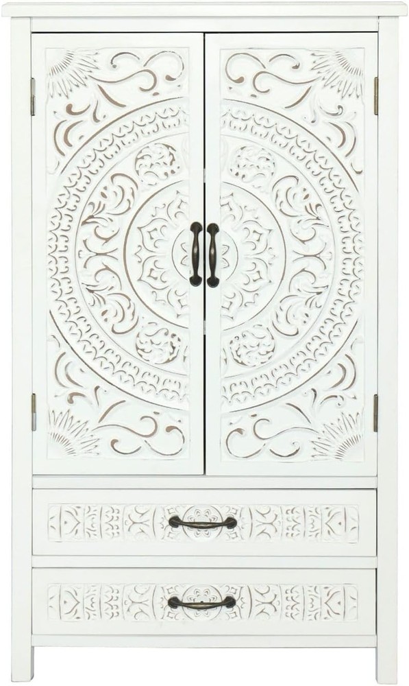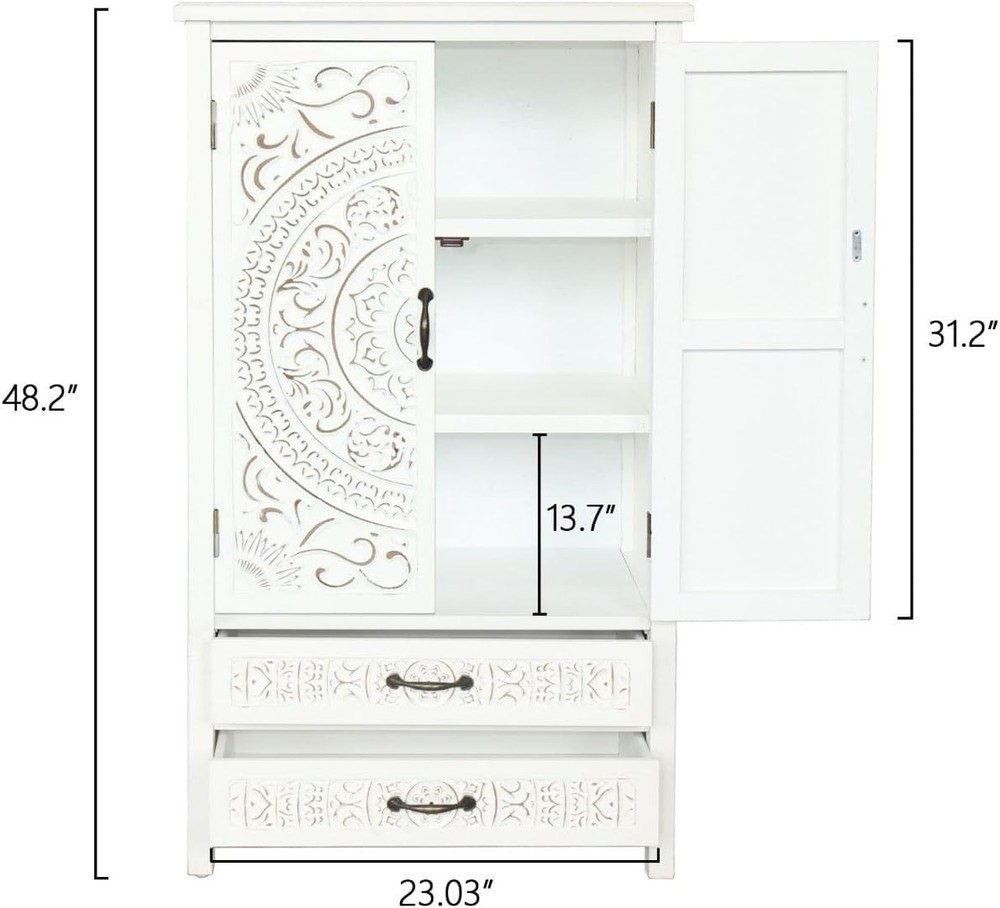 Product Description About this item • ELEGANT DESIGN WITH STORAGE: Beautifully carved pattern on cabinet doors and drawers brings artistic flair to any room while providing practical storage space with interior shelving measuring 13.7" in height • PERFECT SIZE FOR ANY SPACE: Measuring 26.77" L x 15.33" W x 48.23" H, this versatile white storage tower fits perfectly in living rooms, hallways or entryways without overwhelming your space • QUALITY CONSTRUCTION: Crafted from solid wood and premium MDF for long-lasting stability and performance, supporting up to 58.30 lbs of your favorite decorative items, books, • VERSATILE STORAGE SOLUTION: Features two spacious cabinet doors with two bottom drawers • RUSTIC FARMHOUSE CHARM: The white finish with intricate carved detail combines modern functionality with classic design, complementing both contemporary and traditional home décor styles while providing attractive organization Specifications: -Main Material: Solid Wood + MDF -Product Dimensions: Assembled Length (in.):26.77 Assembled Width (in.):15.33 Assembled Height (in.):48.23 -Product Weight (lbs.):58.30 -Assembly Required: Yes 1. The color of the actual product may differ from the image due to the lighting or the monitor’s display. 2. Manual measurement has been used; there may be some reasonable error. Package includes: 1 x Storage Cabinet