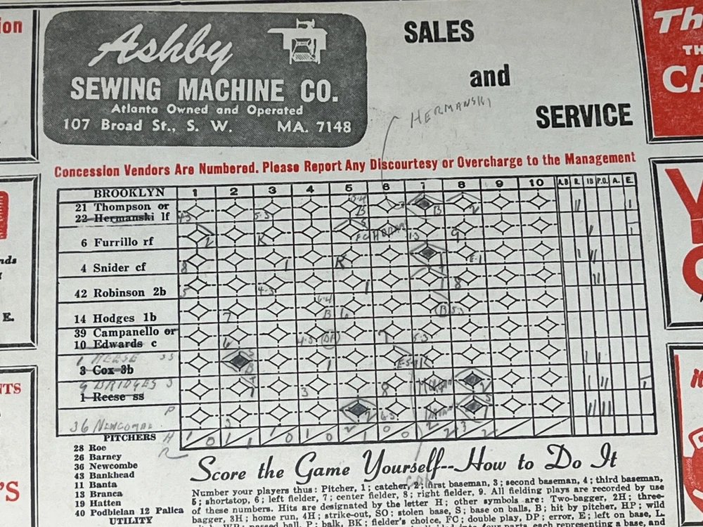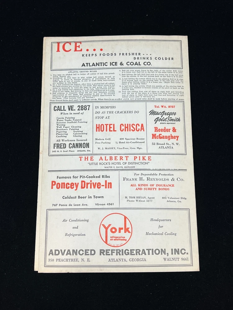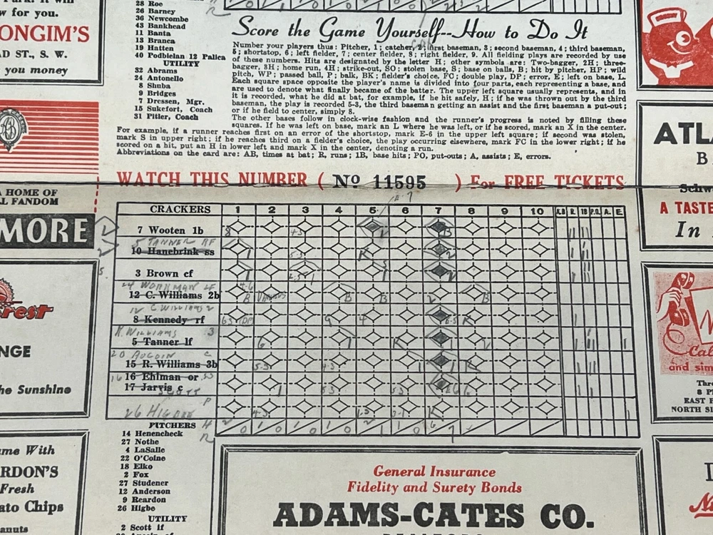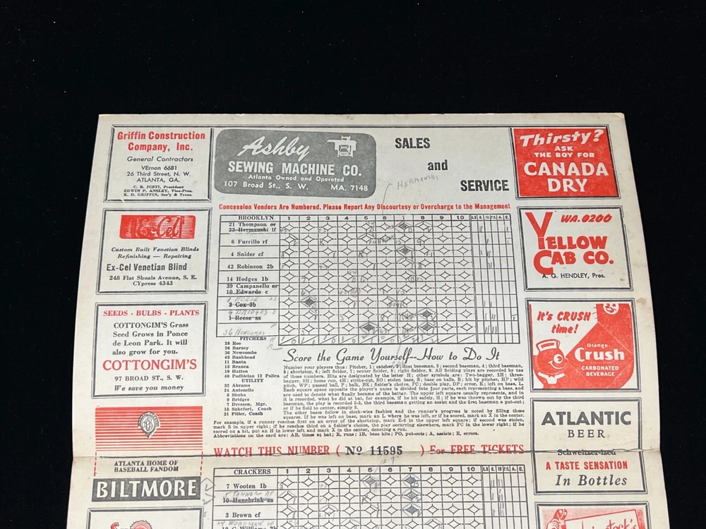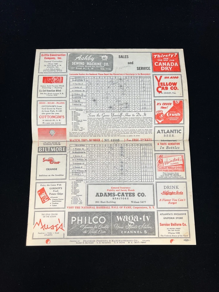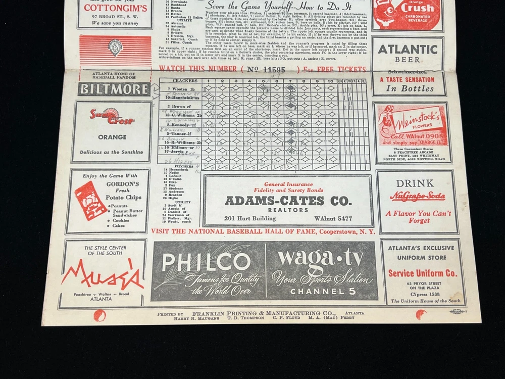 4.8.51 Atlanta Crackers vs Brooklyn Dodgers Score Card Scored W/Coca Cola 11595