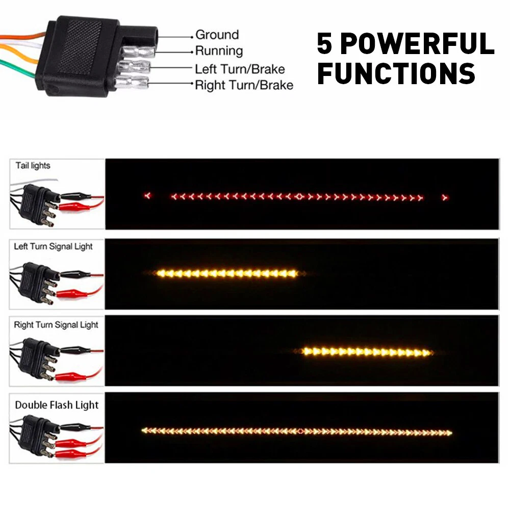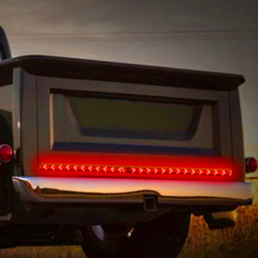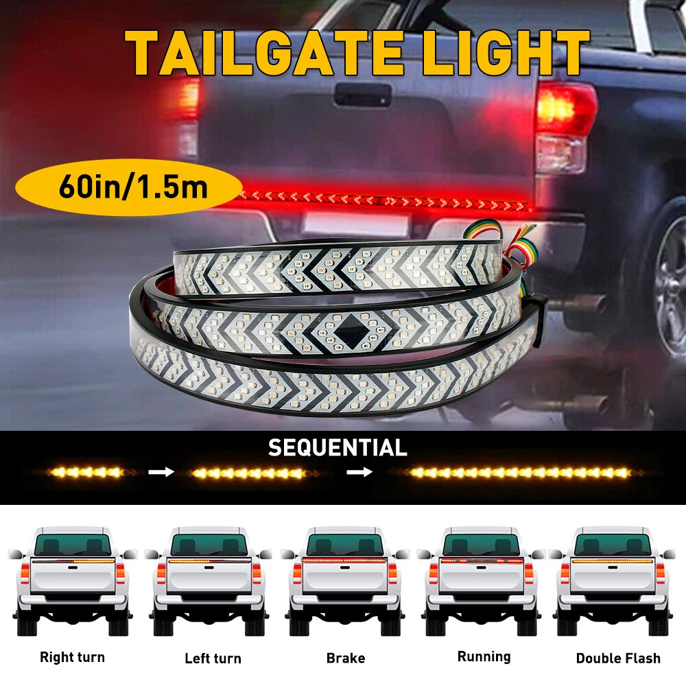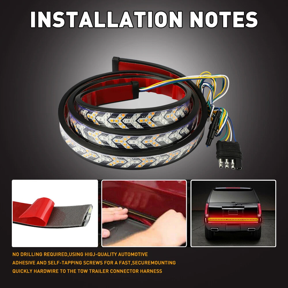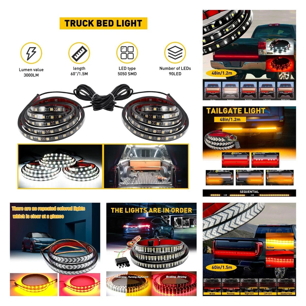 60"-Version 1-White Red Yellow 5 Function & 3 Color. The 60'' Quad Row LED Tailgate Light Bar tucks into the recess between your tailgate and bumper for avoid traffic collisions, illuminates in conjunction with your truck’s brake lights, reverse lights, turn signals, running lights and hazard lights in White/red. Turn signals with 3 stage scanning lights Don't be left in the dark. For faster, safer and more enjoyable driving, the tailgate light strip running 624pcs high intensity SMD LEDs with quad row design (400% brighter than single row light), adds a unique custom touch to your rig and the attention of other drivers behind you at day and night 48"/60" Row LED Truck Tailgate Light Bar Strips Tail Turn Signal Brake Reverse M 60"-Version 1-White Red Yellow 5 Function & 3 Color. The 60'' Quad Row LED Tailgate Light Bar tucks into the recess between your tailgate and bumper for avoid traffic collisions, illuminates in conjunction with your truck’s brake lights, reverse lights, turn signals, running lights and hazard lights in White/red. Turn signals with 3 stage scanning lights Don't be left in the dark. For faster, safer and more enjoyable driving, the tailgate light strip running 624pcs high intensity SMD LEDs with quad row design (400% brighter than single row light), adds a unique custom touch to your rig and the attention of other drivers behind you at day and night Ready to take on any kind of weather. Seamless design with IP67 waterproof rate and shockproof silicone tube, passed through 50,000 hours working lifespan testing providing the most durable light, to ensure more resistant to dirt, snow and ice accumulations Plug and play without drills. The tailgate light bar comes with 3M double-sided foam tape, just affix the tape and tailor the installation to your vehicle. The 4-pin tow plug comes ready to connect to your factory 4-pin trailer adapter for a true plug and play installation, but if you regularly tow your vehicle’s or without 4-pin adapter you can hard wire the light strip to your vehicle Fit for DC 12 vehicles with 60inch tailgate and TURN, such as Pickup, Truck, Ford, Chevy, Jeep, Dodge Ram, GMC, Toyota, Nissan, SUV, Tractor, Trailers, Cars, RV, VAN, etc. Certified with IP67, CE and RoHS. Make sure the turn light color of your vehicle before purchase. Specification: Type: Quad row LED Tailgate light bar Light Length: 60 inch(150cm) Input Voltage: DC 12-16V LED QTY: 624pcs Luminous Flux: 12000LM Waterproof Rating: IP67 Lifespan: up to 50000 hours Material: Diecast Aluminum + PC Dimension:60*0.62*0.12inch Color:White+Red+Amber Package Included: 1PC x 60INCH Quad row LED Tailgate light bar 48"-Version 1-White Red Yellow Specifications: LED number: 432pcs LED type: 2835SMD Product length: 48inch(1.2m) Waterproof grade: IP68 Service life: more than 5000h+ Wide Fitment: With working voltage of 12V DC, fit for Amber turning on most vehicles. Such as Dodge Ram 1500 2500, 3500, 4500, Ford F150, F250, Chevy, Silverado, GMC, Sierra, Toyota Tundra, and most cars, trucks, Pickup, SUV, RV, Van, trailers, etc. Features: *More advanced with 6 founctions: More advanced than other tailgate lights, our lights have 6 founctions: Braking Light, Turn signal(left+right), Reversing lights,sequential strobe light,running light. *High Brightness: With 432pcs 2835 SMD led chips to give out the super-bright beam. Adds clear visibility to the rear drivers,better-ensuring safety traffic on roads. *Simple Installation: No drilling required, using high-quality automotive adhesive and self-tapping screws for a fast, secure mounting. *High Waterproof: Manufactured from fully sealed flexible silicone housing with IP68 waterproof rate, the durable tailgate lights work perfect whatever in rainy or snowy environments. *Wire connection: Brown-negative pole White-running light(low bright red light) Yellow-turn left(dynamic yellow light)/brake(high bright red light) Green-turn right/brake(dynamic yellow light) Red-reversing light(white light) Packaging inclued: tailgate light*1 48"/60"-Version 2-White Red Specifications: LED number: 72pcs LED type: 3528SMD Product length: 48inch(1.2m)/60inch(1.5m) Waterproof grade: IP68 Service life: more than 5000h+ Features: *More advanced with 5 models: More advanced than other tailgate lights, our lights have 5 models for you to improve driving safety. *High Brightness: Adds clear visibility to the rear drivers,better-ensuring safety traffic on roads. *Simple Installation: Product with high-quality automotive adhesive makes it not fall off easily. *High Waterproof: IP68 waterproof rate makes it durable and works perfectly in rainy or snowy environments. *Wire connection: Brown-negative pole White-running light(low bright red light) Yellow-turn left(high bright red light) Green-turn right(high bright red light) Red-reversing light(white light) Packaging inclued: tailgate light*1 60"-Version 3-White Red Yellow Product Feature: FULL FUNCTIONS: The new style tailgate light features full functions of the brake, flowing turn signal, double flash, and brake light. BRIGHT LIGHTS: With 528pcs(276Pcs Red+252Pcs Yellow)2835 SMD led chips to give out the super-bright beam. Adds clear visibility to the rear drivers, better-ensuring safe traffic on roads. PREMIUM QUALITY: Adopts fully sealed silicone housing with IP67 waterproof rate, works well whatever in rainy or snowy days. With inline fuse for short circuit protection, heavy-duty, and super durable. EASY TO INSTALL LED Tailgate Light Bar: No drilling required, using high-quality automotive adhesive and self-tapping screws for a fast, secure mounting, quickly hardwire to the tow trailer connector harness. UNIVERSAL FITMENT: This flexible light strip features 60 inches long, widely suited for almost all 12V operated at DC 12V wide voltage, Pickup Trucks, Trailers, Cars, SUV, RV, VAN, boat anchor, etc. Product Specification Type: Truck Tailgate Strip Bar Shell Material: PVC LED Color: Red/Yellow Red For Brake Light Yellow For T