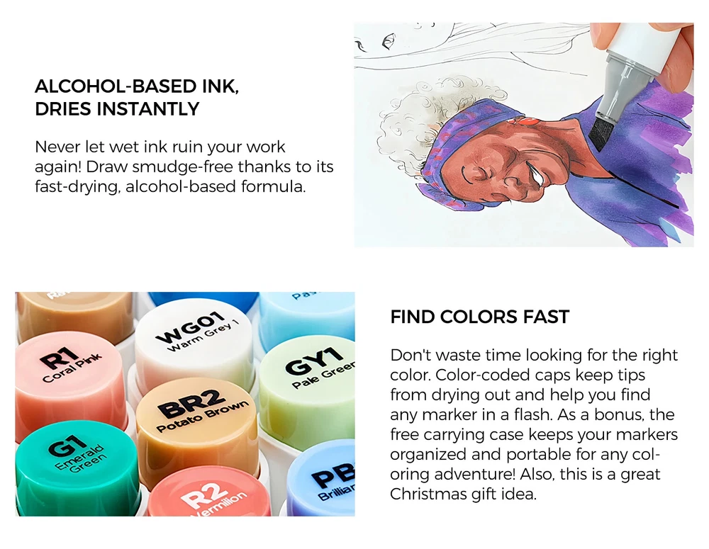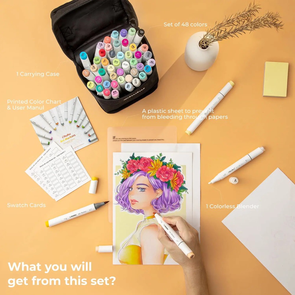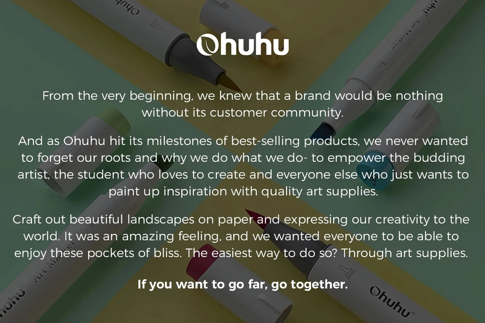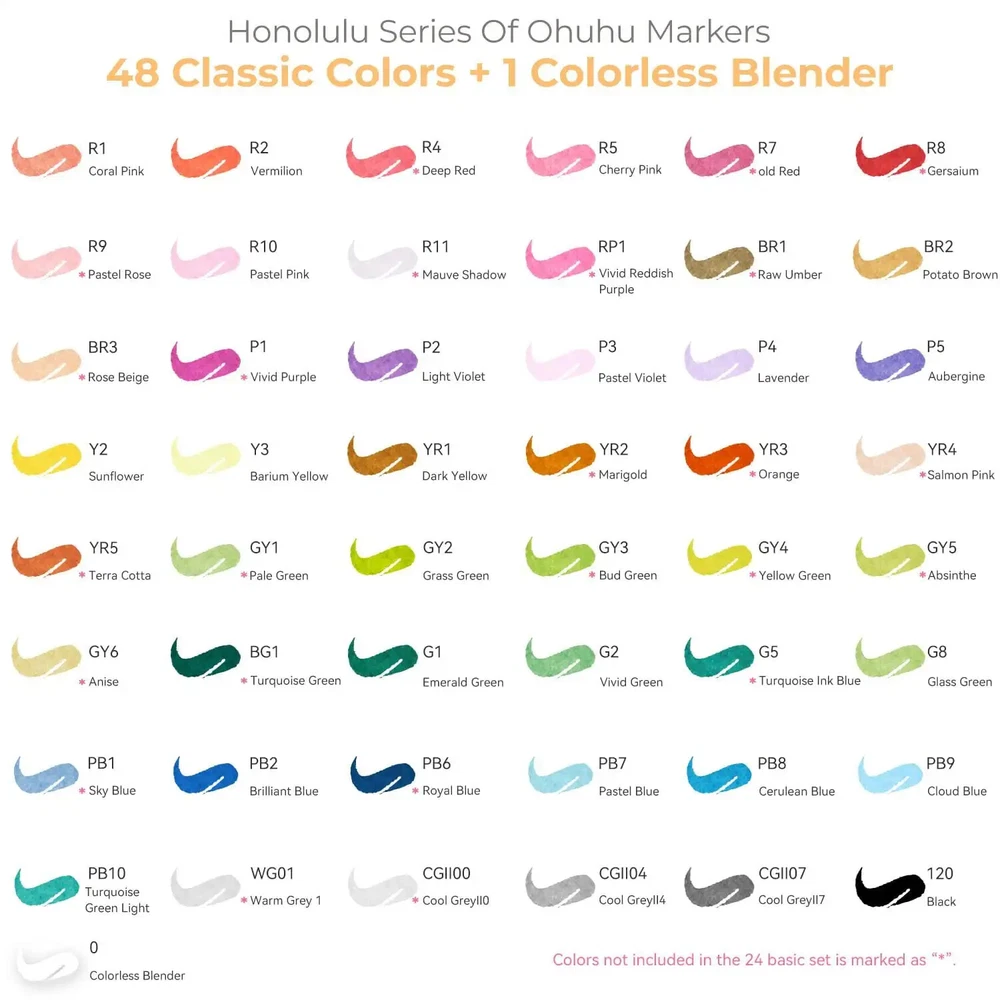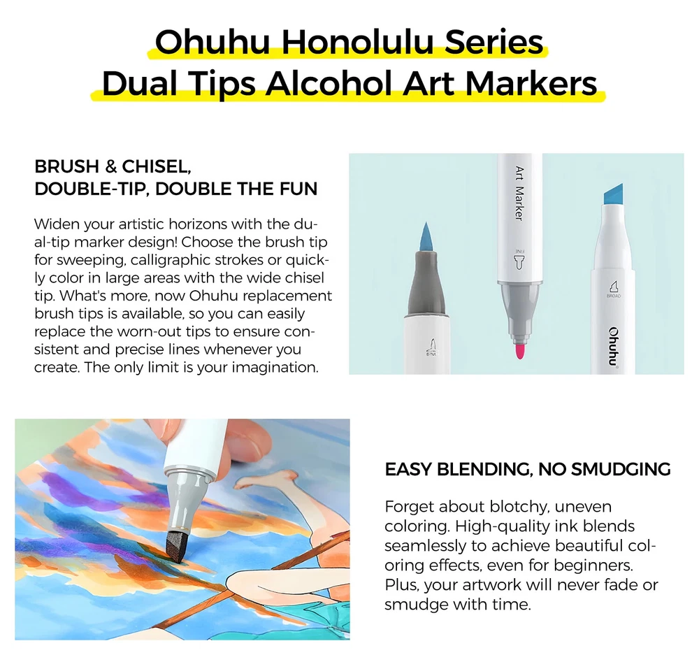 Main Featrues 【Honolulu Series】BRUSH & CHISEL , DOUBLE-TIP, DOUBLE THE FUN Widen your artistic horizons with the dual-tip marker design! Choose the brush tip for sweeping, calligraphic strokes or quickly color in large areas with the wide chisel tip. What's more, now Ohuhu replacement brush tips is available, so you can easily replace the worn-out tips to ensure consistent and precise lines whenever you create. The only limit is your imagination 【Honolulu B Series】BRUSH & FINE , DOUBLE-TIP, DOUBLE THE FUN Widen your artistic horizons with the dual-tip marker design! Choose the brush tip for sweeping, calligraphic strokes or the fine tip for details. What's more, now Ohuhu replacement brush tips is available, so you can easily replace the worn-out tips to ensure consistent and precise lines whenever you create. The only limit is your imagination REFILLABLE INK FOR A LIFETIME OF CREATIVITY With 51 Ohuhu popular colors available for refills now and more on the way, your creativity knows no bounds. Enjoy a wide range of hues and keep your markers going for years to come. Whether you're exploring the rich colors of Honolulu, Oahu, the Kaala, or the bold hues of Molokai Series, they are refillable now. Switch between sets seamlessly and unlock endless artistic possibilities SEAMLESSLY BLENDING Say goodbye to unsightly splotches and uneven coloring. Our high-quality ink seamlessly blends to create beautiful, professional-grade artwork, perfect for both beginners and experienced artists; Also, no more frustrating smudges or wet ink ruining your work. Our alcohol-based ink dries quickly, ensuring that your art is always clean, crisp, smudge-free, and ready to display 48 VIBRANT COLORS + 1 COLORLESS BLENDER The rainbow is at your fingertips - choose from 48 brilliant colors and bring your ideas to life. The color spectrum is yours to explore with 48 brilliant shades to choose from, plus a colorless blender for better blending effects. From coloring books to professional masterpieces, our brush markers will breathe life into your artwork EASY IDENTIFICATION, ORGANIZATION & PORTABILITY Don't waste time searching for the perfect color. Our markers come with color-coded caps to keep you organized and efficient. Plus, the free carrying case makes these markers perfect for any coloring adventure or as a thoughtful gift for any artist Product Description