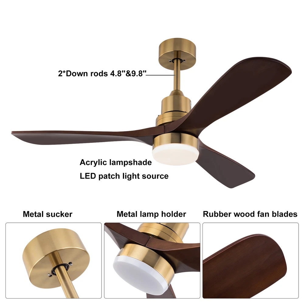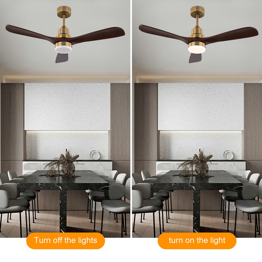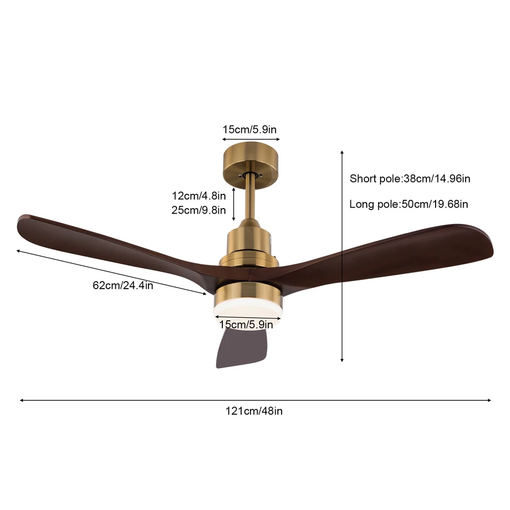 Description Create a cozy interior with this ceiling fan light now! Light color, fan speed, reverse function, and time-setting can be easily adjusted by remote control, providing you with a smarter and more convenient life. Combining a simple round lampshade, brown fan blades, and copper color base, it will add more charm to your home. Package Included 1*Ceiling Fan Light 1*Romote Control 1*English Instruction All Needed Accessories 48 Inch 3 Colors LED Ceiling Fan Light w/ Remote Control Fan Light Timer 40W Key Features Sturdy & Durable: The high-quality glass and iron with polishing and electroplating processes give this product high hardness, corrosion resistance , and wear resistance , keeping it practical and beautiful for long-term use Generous Appearance: The simple colors, glossy body, and elegant lines make this succinct-style light an excellent decoration in your house. Thoughtful Design: It comes with six wind speed adjustments, the reverse function, and the timer function (1h, 2h, 4h) to meet your different needs at different times. Excellent Lighting: The high-transmittance lampshade, energy-saving LED light source, and three light colors(3000K, 4500K, and 6000K) can provide different lighting atmospheres while taking great care of your eyes and mood. Remote Control: It comes with an easy-to-understand remote control that allows you to switch on and off and control the ceiling fan light within a certain range (9.84-16.4 ft), making your life simpler and more comfortable. High Adaptability: You can choose to install any of the 2 equipped lamp poles of 4.8" and 9.8" in height according to your needs. Its wide voltage design(85-265V) makes it adapt to different voltage environments. Easy to Clean: The smooth surface and open structure allow you to simply wipe dust away with a soft cloth. Exquisite Gift: With good performance and unique appearance, it can be used as a housewarming gift for parents, friends, and lovers so that they can also enjoy a more exquisite life. Protective Package: To prevent the product from being damaged during transportation, we packed it with foam to protect your products to the maximum extent possible. Details Pure Copper Motor: The pure copper motor has stable operation, high efficiency, and low noise (35db) to provide plenty of power for the fan. Glass Lampshade: It has high transparency that ensures bright and even lighting, bringing you visual pleasure while protecting your eyes. Round Base: The 5.9-inch base increases the contact area with the ceiling, which makes the support more stable and improves safety during use. Application It is suitable for farmhouses, bedrooms, dining rooms, living rooms, kitchens, hallways, gyms and other indoor places. Specifications Color: Copper Color Material: Iron, Glass Process: Polish, Electroplating Light Source: LED Mount Type: Ceiling Mounted Assembly Required: Yes Motor Type: Pure Copper Motor Number of Wind Gears: 6 Reverse Function: Yes Voltage: 85-265V Motor Power: 40W Noise Level: 35dB Color Temperature: 3000K, 4500K, 6000K Illumination Area: 10-15㎡/107.64-161.46ft² Suitable Height: 2.8m/9.19ft Remote Control Battery Type: 2*AAA Batteries(Included) Remote Control Distance: 3-5m/9.84-16.4ft Time Setting: 1, 2, 4 Hours Efficiency: E EU Energy Label Efficiency Labeling Class: A++to E Product Overall Size(With Short Rod)(D*H): 121*38cm/48*14.96inch Product Overall Size(With Long Rod)(D*H): 121*50cm/48*19.68inch Rods Length: 12cm/4.8inch, 25cm/9.8inch Each Fan Blade Length: 62cm/24.4inch Lampshade Diameter: 15cm/5.9inch Base Diameter: 15cm/5.9inch Package Included 1*Ceiling Fan Light 1*Romote Control 1*English Instruction All Needed Accessories Notes Please check the size carefully before ordering. Please make sure the power is cut off before installation. Please do not install it next to the air conditioner or heater, which will affect the service life of the product. Please wear electric insulation gloves (not included) and avoid scratching the surface of the product and the electric wire when installing. Please conduct a power test before installation. Please install it by someone with an electrical license if necessary. For a safe and secure installation, please ensure that the electrical box is firmly mounted and properly attached to a structural part of the building. Please make sure that all wires are connected and all screws are tightened into the ceiling. When unpacking, be careful not to pull with the wires as a bad connection may result. Please use this item within the applicable voltage range and clean it regularly. Please wipe with a soft cloth, it is not suitable to clean with cleaning agents. Please allow the slight color difference caused by the shooting light and 1-3cm error due to manual measurement, and make sure you do not mind before you order. Payment Delivery details Terms of sales About us Contact us Payment We accept ebay payment 。 Fees such as import duties, taxes are not included in the item price or shipping costs. These charges are the buyer's responsibility. Delivery details Shipping: 2-9 working days to: USA Terms of sales We maintain high standards of excellence and strive for hundred percent customer satisfaction. Feedback is very important to us. We hope that you contact us immediately before you give neutral or negative feedback, so that we can address your concerns. It is impossible to address issues if we do not know about them! About us Your satis faction is our ultimate goal. We work hard to earn your trust and future business. Our certified technicians have tested each item before shipping. The unit comes with 1 year limited warranty on all manufacturing defects. a) If you receive a defective item, you may return it or ask for a discount. Please contact us within 14 days after you receive the package. b) What you returned must be intact and in its original packaging as re? u. Customer is responsible for shipping costs of the returned item. c) We will cover the cost