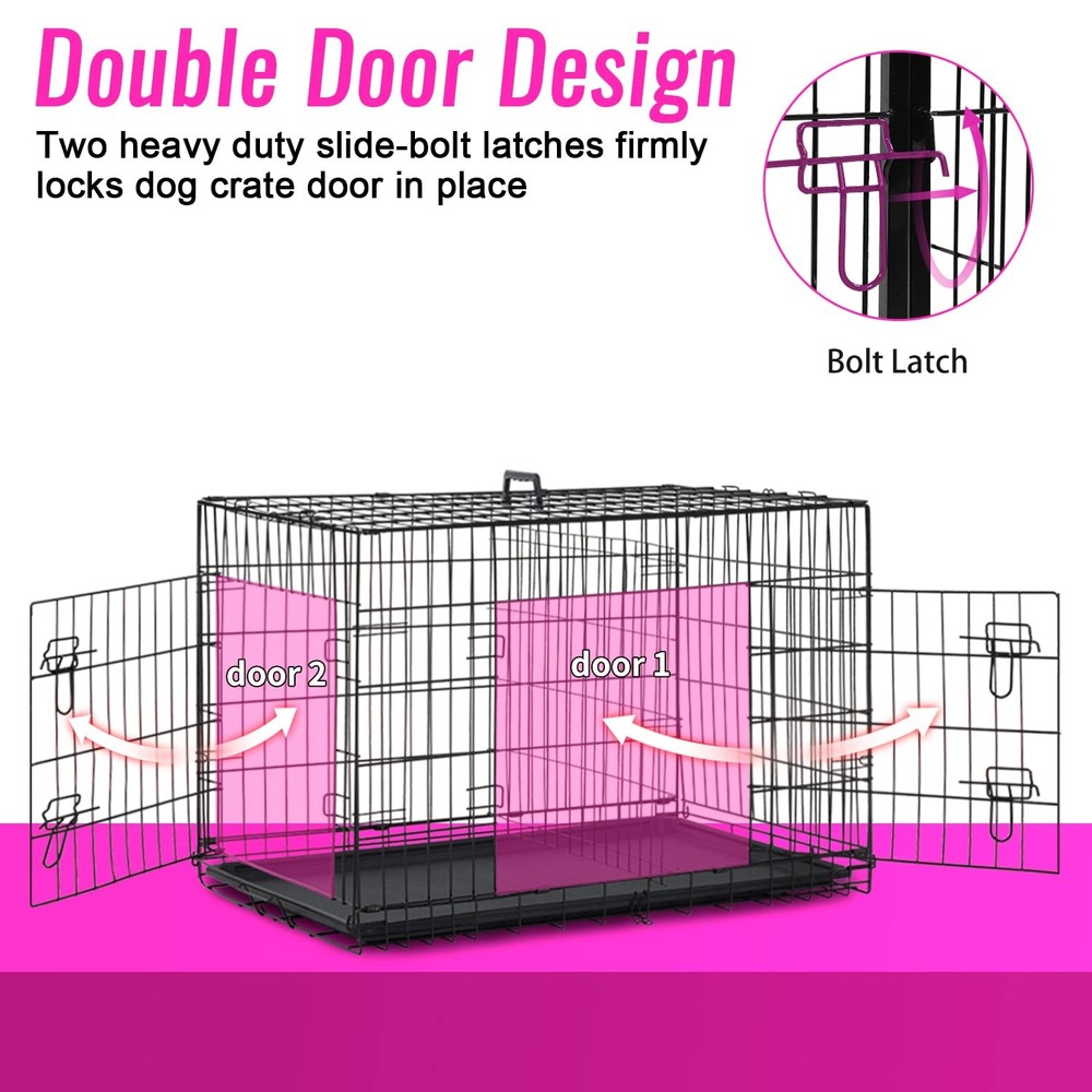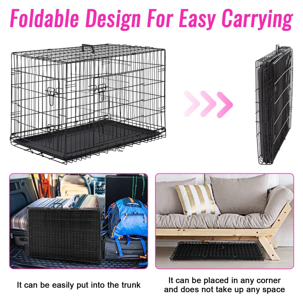 🐕【Dog Crate Made of Durable Materials】: the dog crate Made of high Tensile-Strength wire gauge.The dog cage ideal for training and transporting well-behaved pets. Pet crate epoxy coating finish extends the life of the crate and provides resistance against rust, corrosion, and fading, even in the most extreme climates. Dog crate dog cage pet crate. 🐕【Designed to Safe and Comfortable】: The pet cage have two large doors, one on the front and one on the side, are easy to open, close.Heavy duty securely lock with dual latches, providing a safe and secure environment for your pet.The dog cage designed to keep animals safe and comfortable. Pet kennel wire dog crate animal cage. 🐕【Easy Assembly】: This dog cage does not require any tool assembly, dog cage can be deployed directly. It only takes a few minutes. The pet cage divider can separate two pets in two spaces.Dog crate pet cage dog cage with divider. 🐕【Easy to Clean】: the dog cage includes a durable leak-proof ABS Composite tray that will not stain, warp, corrode or retain pet odors. The pet cage bottom pan features an integrated Lip around the perimeter, to contain any mess from spilling outside the dog kennel. Dog cage with tray pet crate metal dog cage. 🐕【Folds Easy to Storage and Portable】: this pet cage with handle is ideal for travel.Fold-and-carry construction dog crate with collapsible design that folds into a package less than 3" Thick. Features a removable carrying handle that can be mounted on any side of the crate as needed. You can easily carry or storage This dog cage.Dog crate with handle metal dog cage dog kennel.