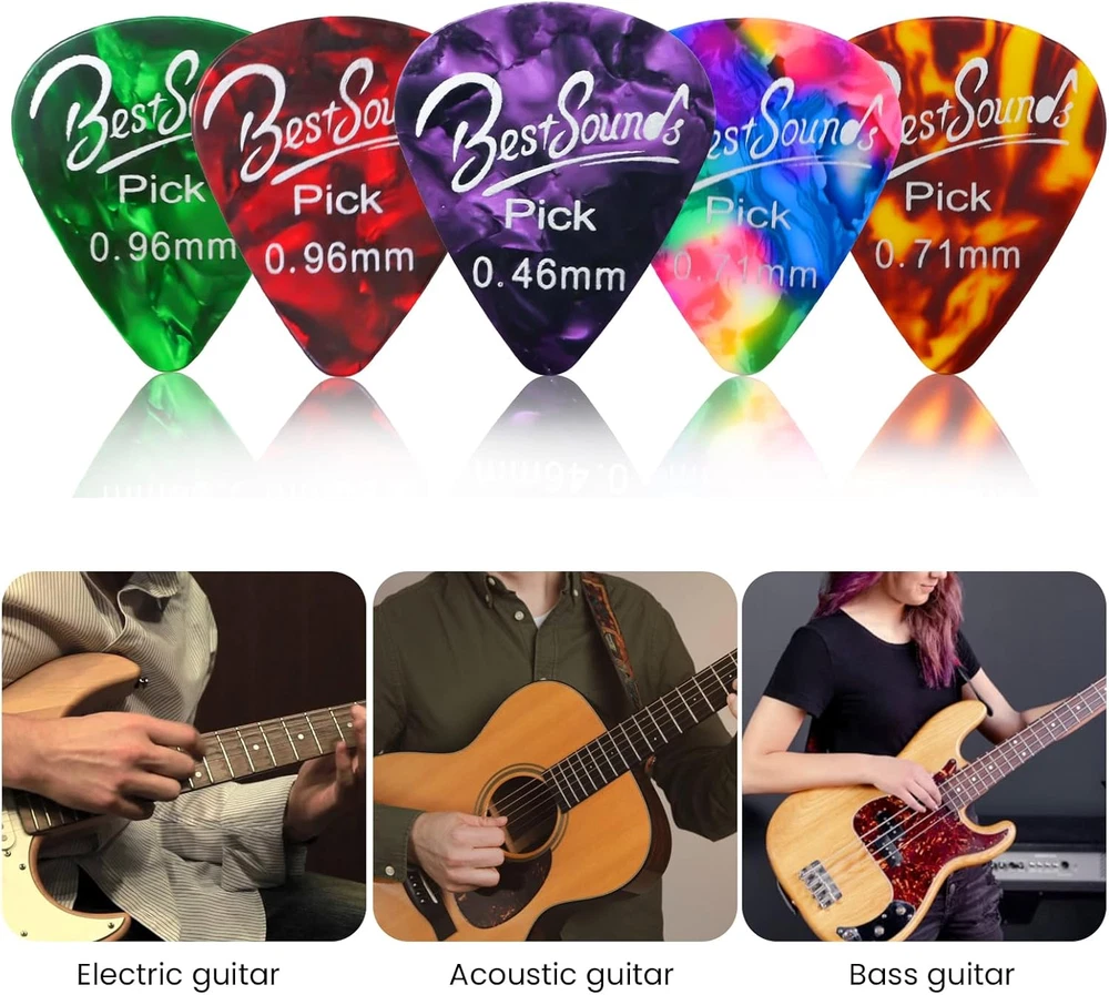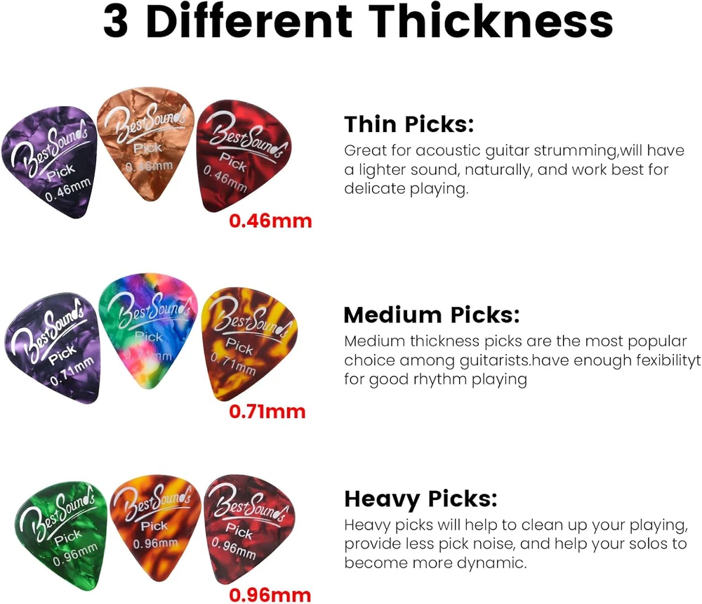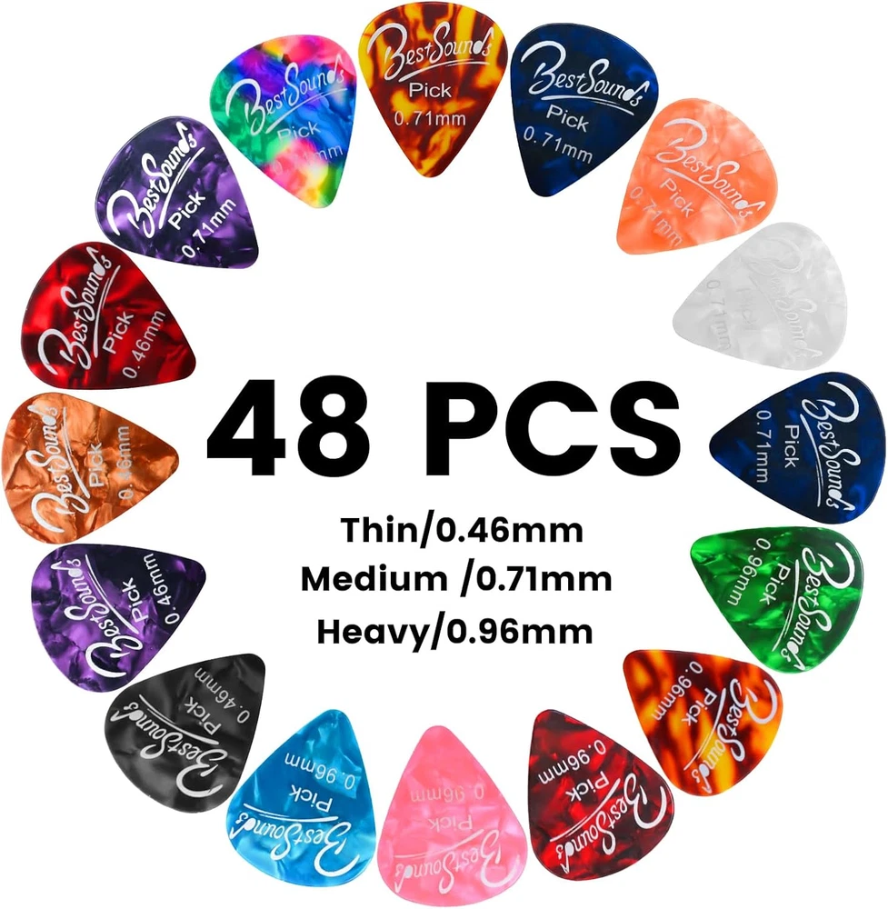 Store New Arrivals Add to Favorite View Feedback Contact 48PCS Guitar Picks, [Thin/Medium/Heavy] Variety Pack Celluloid Pearl Guitar Picks for Acoustic, Electric or Bass Guitars 0.46 Mm/0.71 Mm/ 0.96 Mm, Random Colors(Thin/Medium/Heavy) Description Item model number PK-100 Color 48Pack Thin/Medium/Heavy Product Dimensions 4.33 x 2.76 x 0.2 inches Material Celluloid,Celluloid Pearl Material Type Celluloid,Celluloid Pearl Compatible Devices Guitar Item Weight 1.48 ounces Guitar Pick Thickness medium Color Name 48Pack Thin/Medium/Heavy Is Discontinued By Manufacturer No Size Light /Medium/Heavy 3 DIFFERENT THICKNESS - Thick/Heavy (0.96mm) 16pack, Medium Sized (0.71mm) 16pack and Light/Thin (0.46mm) 16pack. Each Picks is labeled with it's Size/Thickness! OUTSTANDING PERFORMANCE - Light gauge (0.96mm) ideal for strumming,Medium gauge (0.71mm) works well for both strumming and articulate picking. Heavy gauge (0.96mm) ideal for strumming and articulate picking. CLASSIC GUITAR PICK SHAPE - Fits in the Finger Perfectly. Wide Body with a Dense Round Tip. Provides a Wonderful Classic Tone. PICKS - Offers a strikingly unique gift for any guitar or bass player, ensuring complete satisfaction as a perfect gift choice for any day of the year. CUSTOMER SERVICE - Dulphee Musicals is committed to providing each customer with the highest standard of customer service. Backed with a free-replacement, no hassles guarantee, fast support, buy with complete confidence! Product Description Premium Classic Pearl Celluloid Picks Package Includes: Total 48 pack guitar picks, comes in many different thickness and colors to transform your playing style and guitar tone. Thickness: Thin(0.46mm) The perfect choice for strumming and recording acoustic guitar. Very flexible. Great treble and lower dynamic range. Perfect for beginners. Great for acoustic guitar and ukuleles. Medium(0.71mm) Flexible but still rigid enough for note control. Right amount of flexibility for a snappy fluid attack that's bright and crisp. Heavy(0.96mm) Unexpected flexibility with great bass tones. Its medium-sharped tip, provides extra warm tones. Design for: Acoustic Guitar, Electric Guitar, Bass Guitar, Ukulele, Banjo, etc. Best Gifts for Kids Teens Girls Boys Youth Men Women Professional Guitarist, Musicians and Beginner. Celluloid Material Picks Offers A Warm, Round Music Tone! Celluloid is one of the most popular guitar pick materials today. Celluloid is known for providing a natural feel and warm, fat tone. A man-made material, celluloid was first introduced in the early 1900's as a substitute for natural tortoise shell picks. Celluloid is more flexible than tortoiseshell but much stiffer than nylon. These picks can produce a snappier tone with more high end than nylon. ABOUT US We offer the best prices around on high quality products. Our E-store includes media such as books, movies, music and games while offering electronics, toys, sporting apparel, clothing, tools, general home, garden items and more. SHIPPING We are always working hard to ensure your package arrives as soon as possible. Please understand that some factors like weather, high postal traffic, and the performance of shipping companies are outside of our control. We offer free shipping to the lower 48 states and ship within 2 business days of payment, usually sooner. We do not accept P.O. Boxes. Please provide a physical address. RETURNS We offer a 30-Day Return Policy on items which you are not completely satisfied with. You have the option for a full-refund or an exchange of the item. No returns are available on items shipped outside of the USA. PAYMENT We accept PayPal. CONTACT US This page content is yet to come Please ad us to your favorite seller and visit again later Thank You CUSTOMER SATISFACTION We try our very best to make sure every customer is completely satisfied. If there's a problem, message us! We're happy to help.