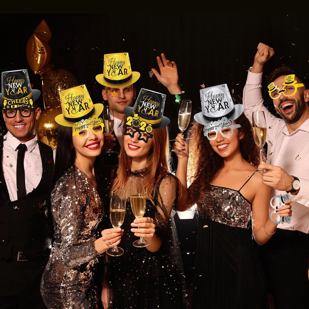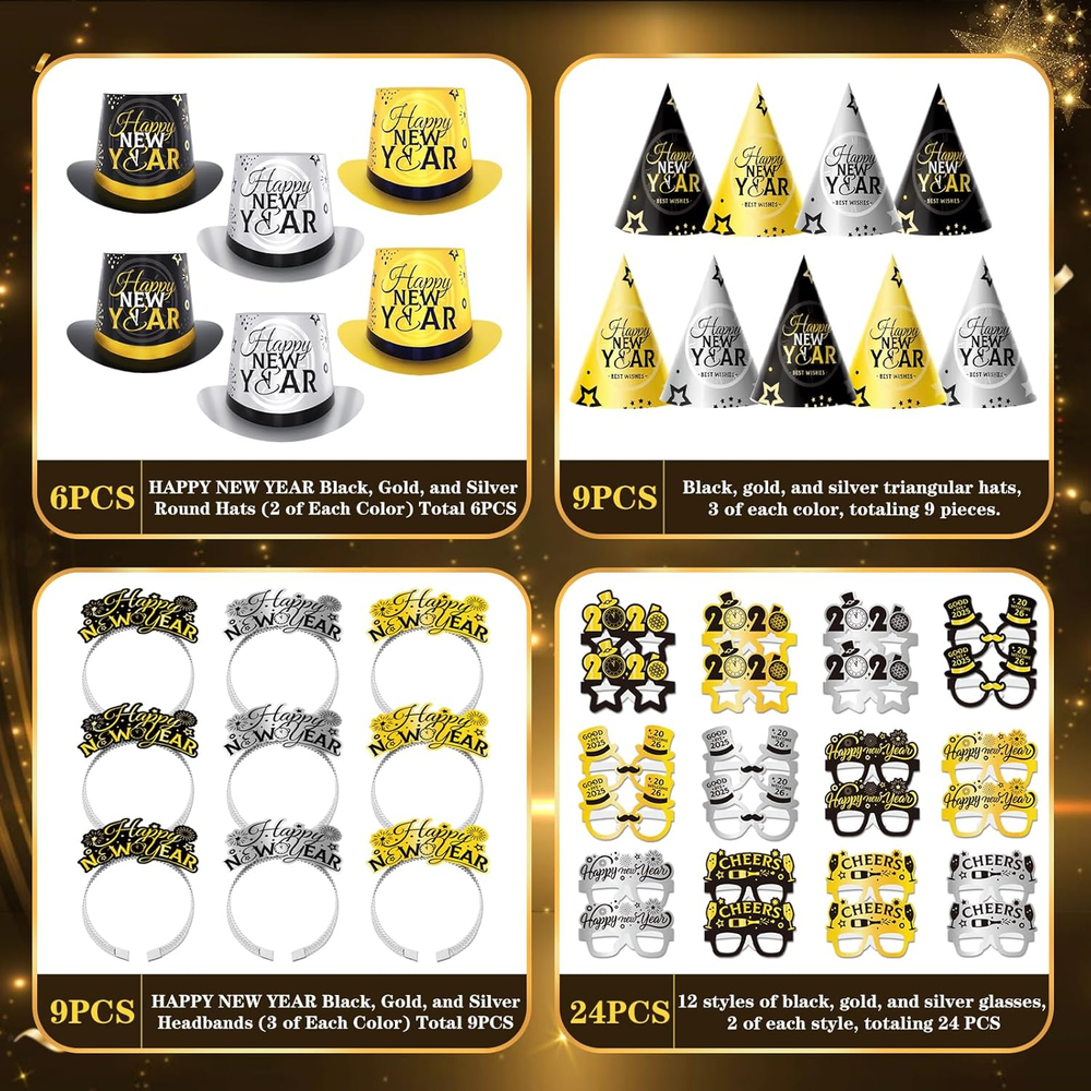 New Year Party Favors Kit: Includes 6 top hats, 9 cone hats,9 Happy New Year headbands (in classic black, gold, and silver), 24 party eyeglasses—offering a complete set of festive accessories to elevate your New Year celebrations. Quality Material: Our 2026 New Years Eve party supplies—including cone hats, headbands, and glasses—are crafted from sturdy cardstock and durable plastic-paper. safe, odor-free, and kid-friendly, perfect for New Year gatherings. Unique Design: Our nye party favors set features “Happy New Year”, reflective firework patterns, plus subtle glitter details on headbands. Under party lights, it emits a soft glow—helping everyone stand out naturally in the crowd while adding strong festive vibes to group photos. It effortlessly turns wonderful moment into unforgettable 2026 New Year snapshots. Easy to Use: The new years decor set assembles quickly without tools, features lightweight materials for comfortable wear. It includes ready-to-use noise makers, is easy to fold, store, and reuse after parties, ensuring convenience and hassle-free use throughout. Perfect for Every New Year Occasion: Whether it’s a home New Year’s Eve party, family reunion, friend get-together, or even office celebrations—this kit has all the decor you need. It’s also a great New Year gift for kids or friends, bringing joy and festive vibes to their celebrations. Product description