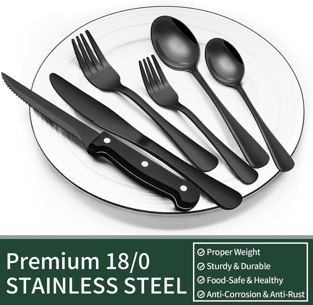Specific Uses For Product Utensils Material Stainless Steel Special Feature Durable Color Black Finish Type Polished Unit Count 48.0 Count Package Type [Predicted: Shipped in a box with protective packaging materials] Number of Items 48 Manufacturer EWFEN See less Item Weight 5 Pounds Number of Compartments 5 About this item PREMIUM 48-PIECE BLACK SILVERWARE SET FOR 8: This flatware set contains 8 dinner forks, 8 salad forks, 8 dinner spoons, 8 dessert spoons, 8 dinner knives and 8 steak knives. It’s the ideal set for home daily use, and also for restaurants, pubs, cafes, and hotels. This cutlery set also help your dinner full of design while having a party. 8 STEAK KNIVES INCLUDED: 8 additional steak knives are offered in this pack that are also made of stainless steel with sharp serrations on the blades help it easy to cut meat, and being ideal to use for eating. The triple riveting handle is strong and durable even when cut hard, and the ergonomic design makes it very comfortable to hold. COMFORTABLE DESIGN: This flatware set has a classic silhouette with clean lines and polish-finish surface in all black, a good choice to go with your existing tableware. The smooth edge of the handle is pleasure to hold, appropriate weight and perfect balance are added to ensure maximum comfort during use. HIGH-QUALITY STAINLESS STEEL: Made of premium food-grade stainless steel, providing the longest term value and the best properties, it offers nice resistance to rust and corrosion to get the most sturdy and healthy experience while using, never bend in daily use. Specific Uses For Product Utensils Material Stainless Steel Special Feature Durable Color Black Finish Type Polished Unit Count 48.0 Count Package Type [Predicted: Shipped in a box with protective packaging materials] Number of Items 48 Package Dimensions 15 x 12.95 x 2.72 inches Item Weight 5 pounds