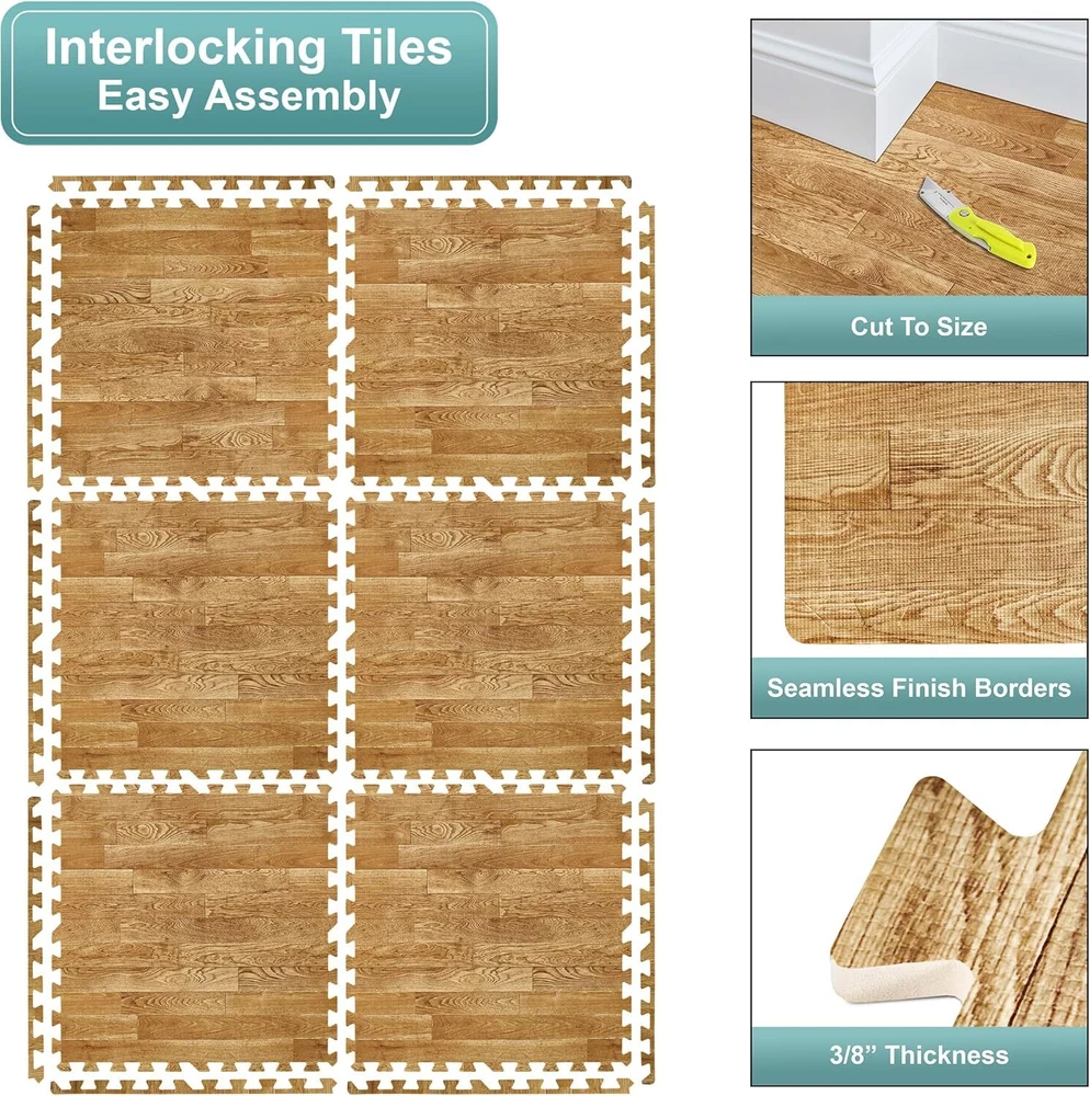 Product details: Wood Grain Floor Mat (12 Tiles, 48 Sq Ft, Pine): Provides comfort and cushion to hard floor surfaces with classic faux wood finish — Includes 6 floor mat wood grain tiles to enhance the comfort and appearance of your space Interlocking Mat Wood Puzzle Tiles: Mats interlock with simple jigsaw puzzle connection for secure, seamless look — Detachable edge pieces allows any tile to be a corner, border, or center — Can be easily expanded with additional wood flooring tiles as your living or workspace grows — Install in specific areas or wall-to-wall — Combine multiple sets to cover larger areas For Home & Business: Fits any room décor that complement a mats wood or foam tiles wood style pattern — Ideal foam tiles for floor and multi-purpose floor mat for living room, basement, interlocking exercise floor mats, yoga/meditation room, dorm, laundry room, beneath camping tents and sleeping bags — Makes a great anti fatigue mat for trade shows, conventions, office environment, gym, health care facility, daycare, classroom, and more Comfortable & Safe: Enjoy comfortable foam squares for hard indoor surfaces — Provides durable soft floor cushion option with foam — Easy on your feet for hours of standing — Thick cushion protects from injury — Suitable foam tiles for anyone seeking cushioned, anti-fatigue flooring Easy to Install: Easy do-it-yourself installation, no adhesive needed — Interlocking flooring mats wood tiles set up in just minutes — Printed Film material is OPP 100% Plastic, Mat is 100%PE — Lightweight and portable — Durable enough to withstand common foot traffic — Waterproof and non-absorbent — Easy to clean — Each tile measures approximately 24"L x 24"W (Entire Unit Covers 48 Sq ft) Color Wood Grain - Pine Brand Sorbus Special Feature Cushioned, Waterproof, Durable Pattern Solid Product Care Instructions Wipe with Damp Cloth Material Foam, Plastic Shape Square