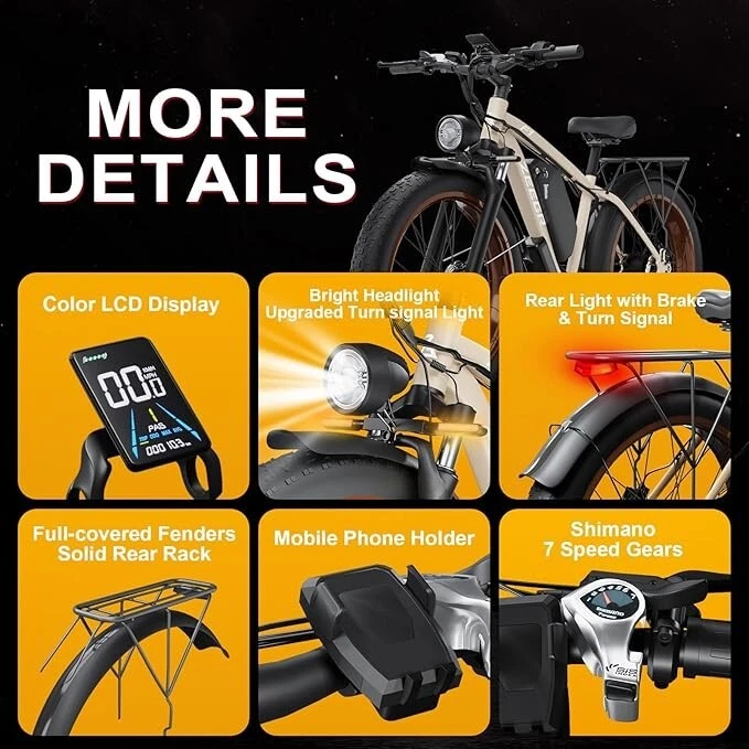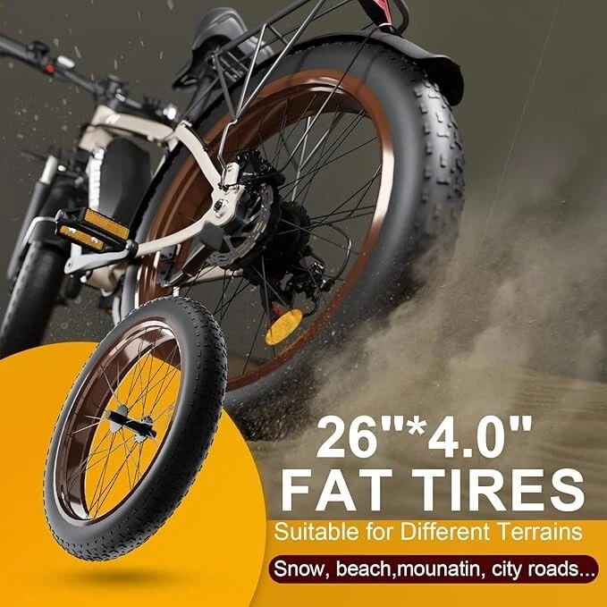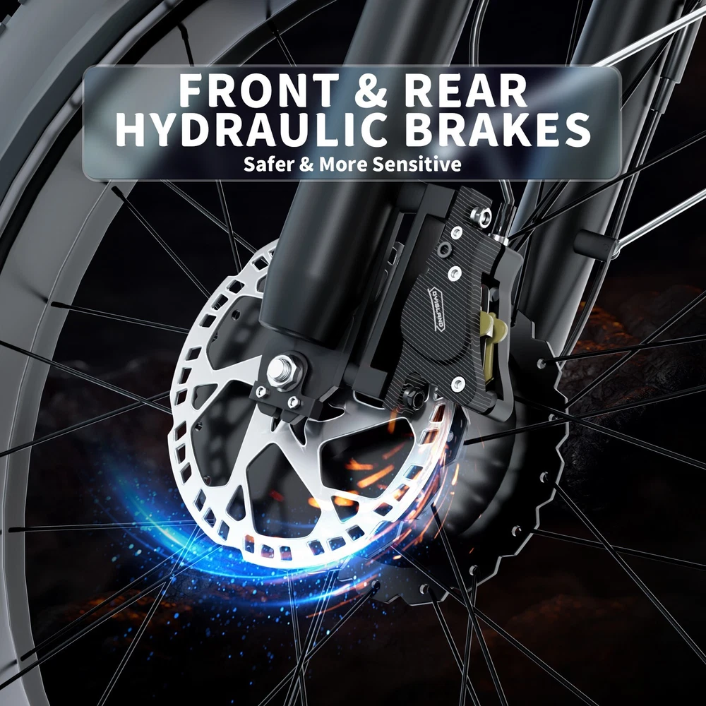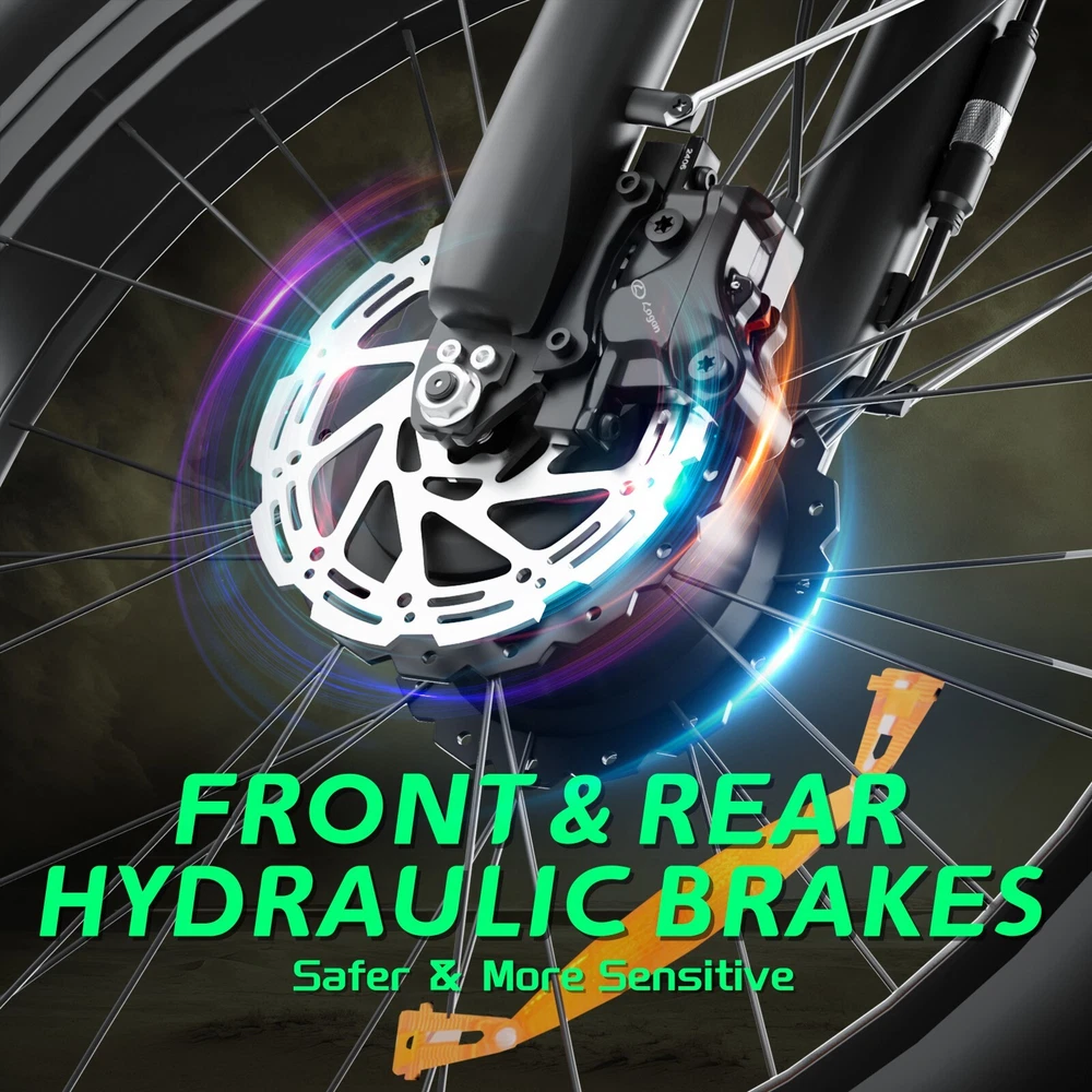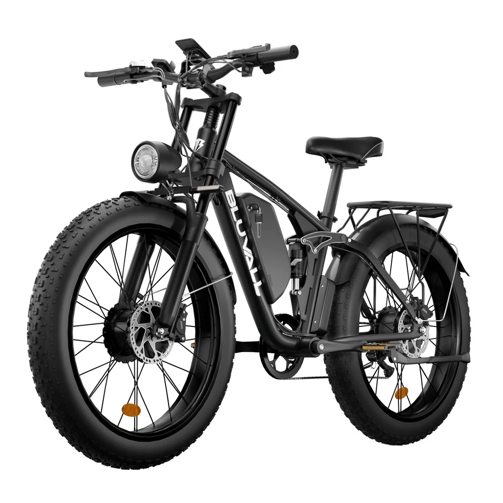 V1 Full Suspension Description 【Dual Motor Electric Bikes for Adults】 TWO upgraded 52V 1000W high speed Front & Rear brushless motors provide electric bicycles with stronger power and climbing ability, helps to reach the top speed of 36MPH with ease. Removable large capacity 52V 22.4Ah battery offers a long riding range up to 40-60 miles in pedal assist mode. It takes only 5-8 hours to fully charge the battery 【Big Capacity Lithium Battery Ebike】 Large capacity 52V 22.4Ah battery offers ebikes long riding range of 40-60 miles,the waterproof battery of ebike is not only large capacity and long lasting, but it's also removable, convenient to take home or office for charging.Upgraded 54.6V 2A charger completes charging quickly in 5-8 hours 【Full Suspension 26" Fat Tire Electric Bike】 Equipped with a dual-crown front suspension fork and rear shock absorber , which greatly reduces bumps during riding. 26" x 4" fat tires also provide good grip and excellent shock absorption. This full suspension ebike offers a more comfortable riding experience in the snow, beach, mountain, city roads, helps you conquer most road conditions 【Hydraulic Disc Brakes & Shimano 7 Speed Gears】 The ebikes for adults adopt front and rear hydraulic disc brakes, which provides more effective braking in rainy weather, heavy off-road, long downhill and adverse conditions. The bike frame is made of high quality 6061 aluminum alloy, more lightweight and durable. Equipped with professional Shimano 7 speed gears, more accurate and stable 【 5 Riding Modes 】 Enjoy versatile riding with 5 modes: dual motor electric, single motor electric, pedal assist, cruise, and bike mode. With 5 levels of assist, the bike can reach speeds up to 35 mph, depending on battery charge, load, and road conditions. Choose from speeds of 12, 18, 24, 29, or 35 mph.Whether cruising or conquering tough terrain, ride faster, farther, and freer. Don’t just ride—feel the power beneath you! 【Upgraded Lights for Night Riding】 The color LCD display keeps track of real-time speed, battery level, pedal assist level and mileage. This electric bicycle comes with an upgraded bright headlight & turn signals & rear brake light, making you visible and safe at night 【Easy to Assemble】 This e-bike comes 85% pre-assembled. 【1-year warranty】If there is any problem, pls contact us, we’ll reply your message within 24 hours. Pls keep the original bike box for 30 days for possible return 【Custom Service】 Contact US: Monday - Friday (9:00 AM - 6:00 PM); Saturday - Sunday (Closed). Due to the time - zone differences, please be informed that all emails will be replied to within 24 - 48 hours. We appreciate your patience and understanding during this time. We provide lifetime technical support, and committed to providing 1-Year warranty service. Specification V1 Double Engine Electric Bicycles, (Front 1000W + Rear 1000W), 1x 52V 22.4AH Battery Waterproof Wiring, Shimano 7 Speed MTB 26" Fat Tires 1. Wheel size: 26" 2. Frame: 18", Aluminum Alloy 6061 3. Handlebar Sets: Aluminum Alloy with Matte, H31.8*680,S31.8*90, SP31.6*350mm 4. Fork: Dual Crown suspension, Rear shock 1000 pounds 5. Shifting Lever: SHIMANOTX50-7,SHIMANOTZ30 & TY500 7PS 6. Crank sets: Aluminum alloy, Square hole, 48T 7. Brake:Brand Logan Hydraulic oil brake 8. Tire: CHAOYANG 26"* 4.0" 9. Riding Mode: Electric Power Assist(5shifts); Pure Electric(5shifts); Pure Human riding 7 Speed, cruise function 10. Travel Range: Pure Electric 20~25Miles; Electric Power Assist 40~60Miles 11. Max Speed: 35mph,Battery Charging Time: 8~10 hours 12. Monitor: 81F Middle digital display B1 Suspension Fork Description 【Dual Powerful 1000W Motors】 The electric bike is equipped with high-speed front & rear 1000w motors, top speed is up to 35MPH . It has stronger hill-climbing performance and offers more power for daily commuting and long travel. You can get excellent riding experience in the snow, beach, mountain, city road, and conquer most road conditions 【Large Capacity Battery 】 With a removable 48V 22.4Ah battery, this fat tire electric bike supports a longer range up to 40-60 miles in pedal assist mode. Your adventures and daily commutes will become wilder and more cost-effective. Upgraded 54.6V 2A charger completes charging quickly in 5-8 hours 【Hydraulic Disc Brakes & Suspension Fork】 The hydraulic disc brakes enable the ebike to brake more quickly and smoothly when riding at high speed, shortening the braking distance even on a wet road. The lockable suspension fork helps you pass rough terrain with less effort. The 26" x 4" fat tires provide good grip and excellent shock absorption for greater durability 【Excellent Riding Performance】 Electric mountain bike frame is made of high quality 6061 aluminum alloy, more sturdy and durable. Equipped with professional 7 speed gears, more accurate and stable. Upgraded headlight, turn signals and rear brake light, intelligent LCD display, this electric bicycle will be a better choice for long time travel and night riding 【4 Working Modes】 Pure electric mode, pedal-assist mode (5 levels), cuise mode, normal bike mode. This adult electric bike can meet your daily commuting needs and outdoor needs, either it is to explore new trails outdoors, get in some exercise, or rush into work 【Professional Customer Service】 1-year warranty. If there is any problem, pls contact us, we’ll reply your message within 24 hours. Pls keep the original bike box for 30 days for possible return Specification: B1 AWD Front 1000W+ Rear 1000W Motor, 48V 22.4AH Battery Waterproof Wiring, 7 Speed MTB 26" Fat Tires 1. Wheel size: 26" 2. Frame: 17.5" , Aluminum Alloy 6061 3. Handlebar Sets: Aluminum Alloy with Matte, H31.8*680,S31.8*90, SP31.6*350mm 4. Fork: Aluminum Alloy Suspension Fork with mechanical lockout 5. Shifting Lever: SHIMANOTX50-7,SHIMANOTZ30 & TY500 7PS 6. Crank sets: Aluminum alloy, Square hole,48T 7. Brake:Brand Logan Hydraulic oil brake