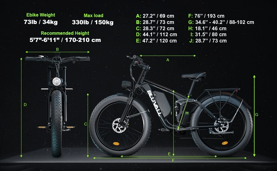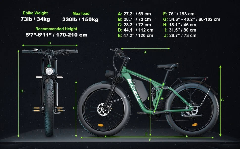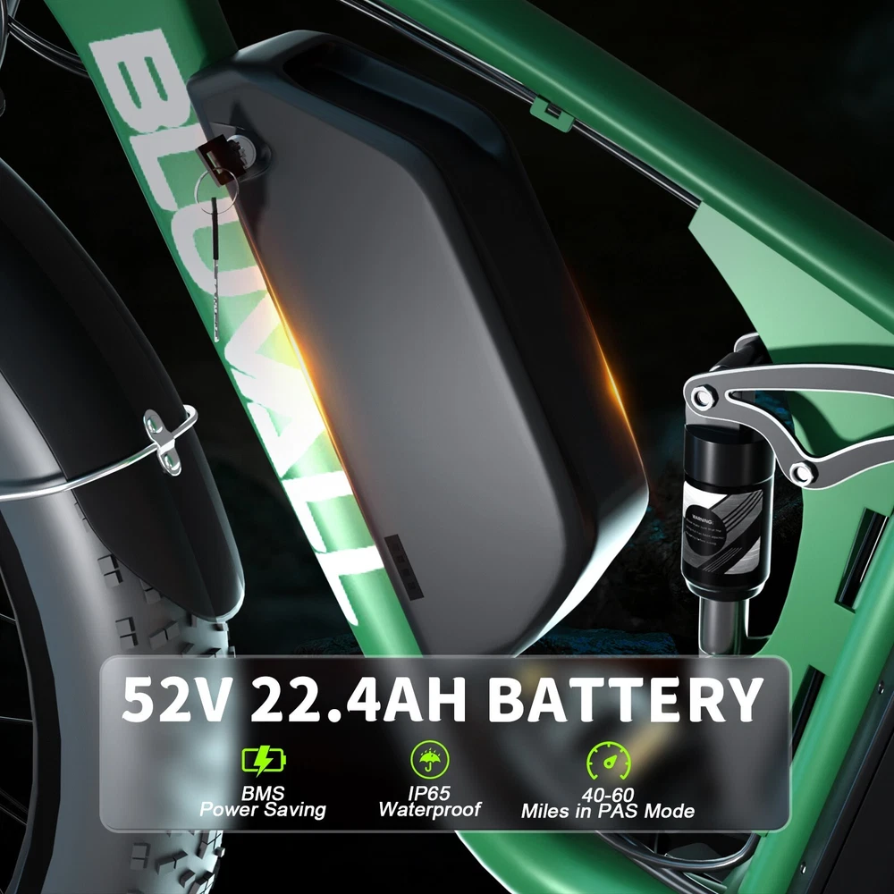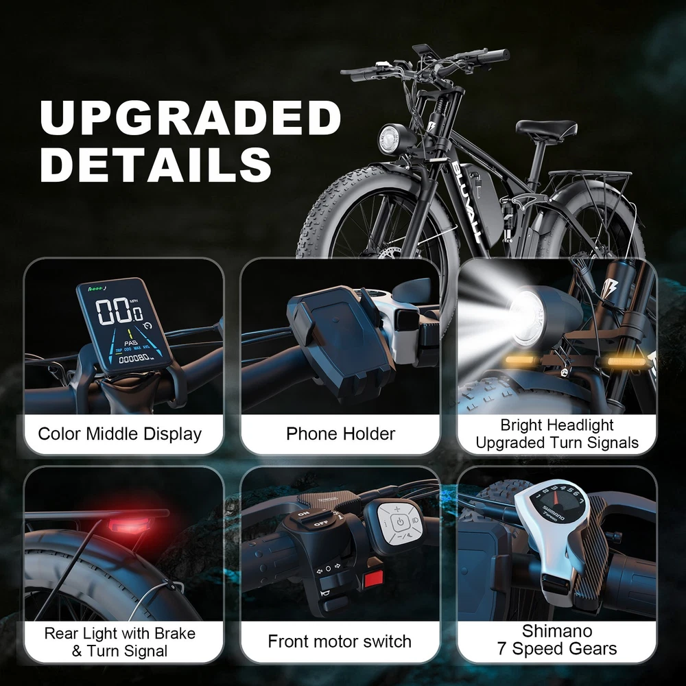 Package Size: 58.3"*12.6"*31.5" (148*32*80CM) Charging Time: 5-8 hours Model Year: 2025 MPN: B1 / V1 Number of Speeds: Shimano 7 Speed Tire Type: Fat Tires 26" * 4.0" Manufacturer Warranty: 1 Year Throttle: Twist Throttle Maximum Range: 40-60 miles (65-95km) in PAS Mode Battery: 48V / 52V 22.4AH Lithium-ion Battery Max Load: 330 lbs (150 kg) Frame Number: B1 / V1 Maximum Speed: 35 mph Item Weight: 75 lbs (34 kg) Shifter Style: Thumb Shifter Voltage: 48V / 52V Gear Change Mechanism: Derailleur Gears Material: Aluminum Alloy Bike Size: 76.0"*28.7"*44.5" (193*73*113CM) Display: Multifunctional Color LCD Display Motor Type: Dual Motors Handlebar Type: Cruiser Bar Features: Adjustable Seat,Pedal Assist,Rear Bike Rack,Fenders,Fat tires Model: B1 / V1 Brake Type: Disc Brake - Hydraulic Department: Unisex Adults Suspension Type: V1 Dual Suspension / B1 Suspension Fork 4 Modes: Pure Electric, Pedal-assist (5 Levels), Cruise Mode, Normal Bike Wheel Size: 26 in Fork: V1 Dual Suspension / B1 Suspension Fork Frame: 6061 Aluminum Alloy Motor Power: 2000W Package Weight: 97 lbs (44 kg) Frame Size: Large Country/Region of Manufacture: China Bike Type: E-Mountain Bike Brand: Bluvall