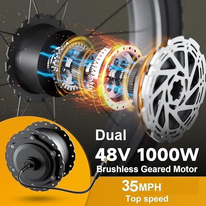 1. This electric bike is a powerhouse! The dual 1000W motors make climbing hills effortless, and the top speed of 36MPH is thrilling. The 52V 22.4Ah battery lasts up to 60 miles, and it charges fast. Perfect for commuting or off-road adventures—smooth, powerful, and super fun to ride!