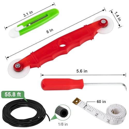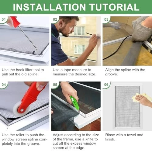 6 in 1 Window Screen Replacement Kit Discover a comprehensive and professional solution for your window screen repair needs. This all-in-one kit provides everything you need to efficiently replace and repair window screens. Kit Includes: Window screen Rolling tool Spline Removal hook Knife (color random) Tape measure (color random) Long Enough Screens and Splines: The kit features a 48"x236" fiberglass patio screen mesh and 55 ft long splines, offering increased length and size to help you replace more window screens with ease. Durable Window Screen Replacement: Crafted from fiberglass mesh, these replacement screens are resistant to tears, weather, and damage. The screen rolling tool is designed with two sides, featuring cams and concave wheels with smooth edges that ensure a scratch-free installation. Easy to Install: This window screen door repair kit allows for a simple replacement process that can be completed in just ten minutes. With the fiberglass patio screen mesh kit, you can achieve professional results quickly and effortlessly. Widely Used: The window screen replacement kit is versatile and suitable for various applications including sliding screen doors, patio screens, garden screens, pool screens, storm doors, porch screens, entrance doors, and patio doors.