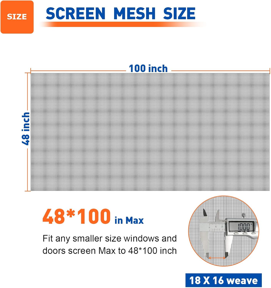 Upgraded Material: Crafted with heavy duty fiberglass mesh, The upgraded screen mesh is specially designed for house. Our screen fiberglass mesh stronger and more durable than regular polyester, can effectively resist scratches and tear resistance Product Benefit: Enjoy enhanced protection with our screen door mesh and window screen mesh, designed to keep bugs out while allowing fresh air in, ideal for house windows, patio screens, and sliding screen door replacements Long-lasting Durability: This screen door mesh replacement ensures years of use. The patio screen mesh and window screen replacement are UV-resistant, washable, and maintain functionality without sagging or tearing over time Effortless Installation and Replacement: Our window screen mesh great for all DIY projects for your house, patio, yard, porch screen,or door screens, window screens, pet screens. Measuring 48 x 100 inch, you can easily cut it to the desired shape and size. Replacing our window screens enhances health and wellness by improving airflow, ensuring a fresher and cleaner indoor environment Superior Choice: Opt for our replacement window screens, offering higher quality than typical supermarket alternatives. Though folded for packaging, any creases will naturally smooth out after installation. If you have any questions, please contact us, we promise to solve it for you until you are satisfied Product Description