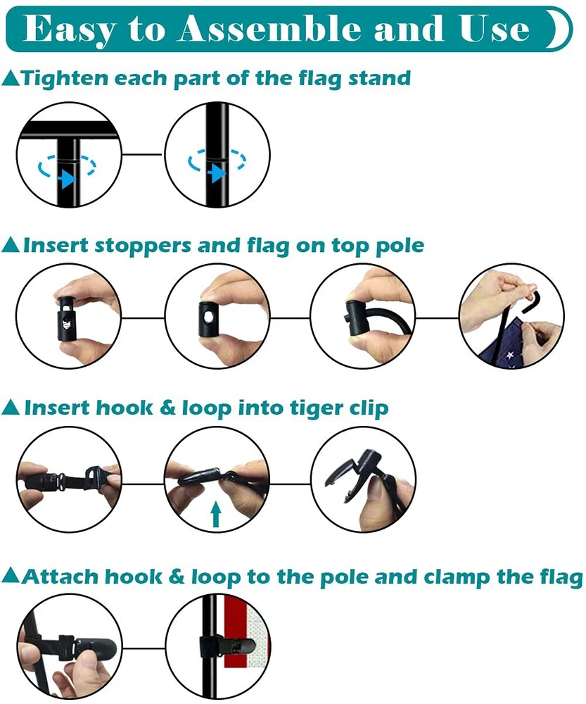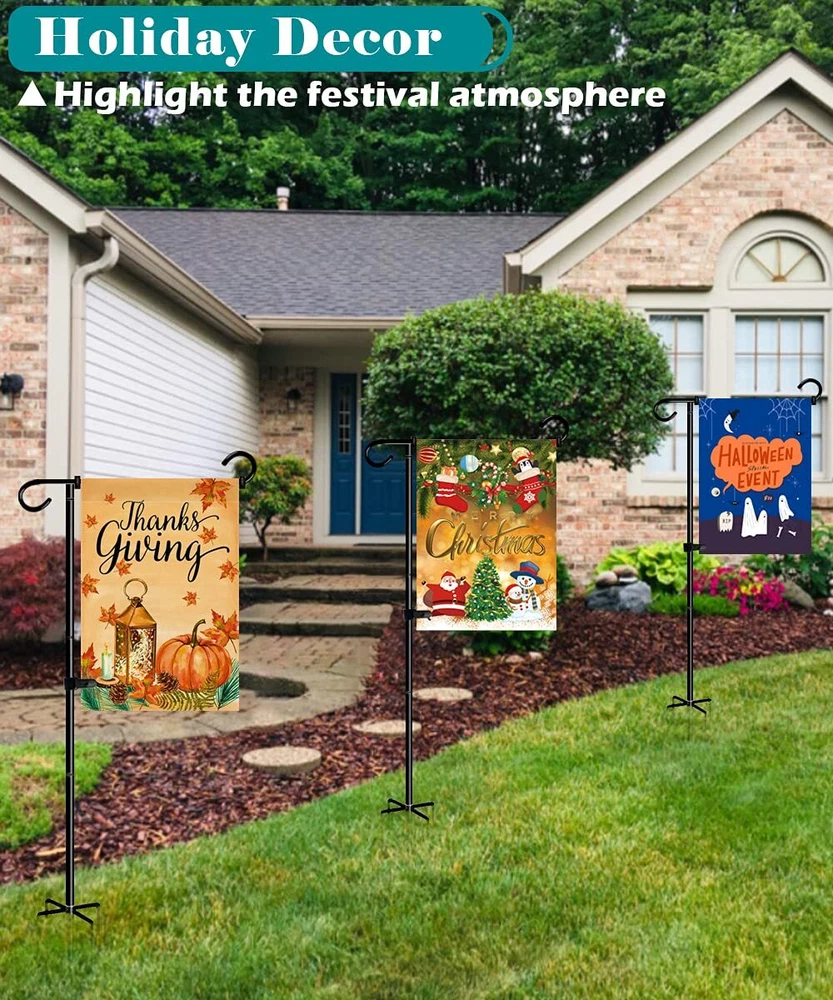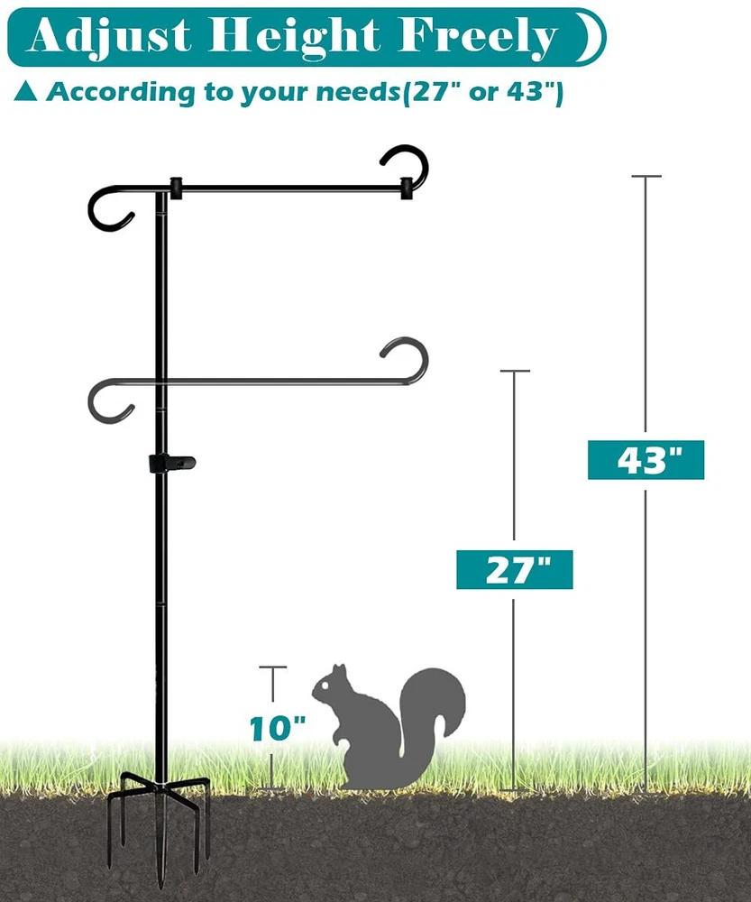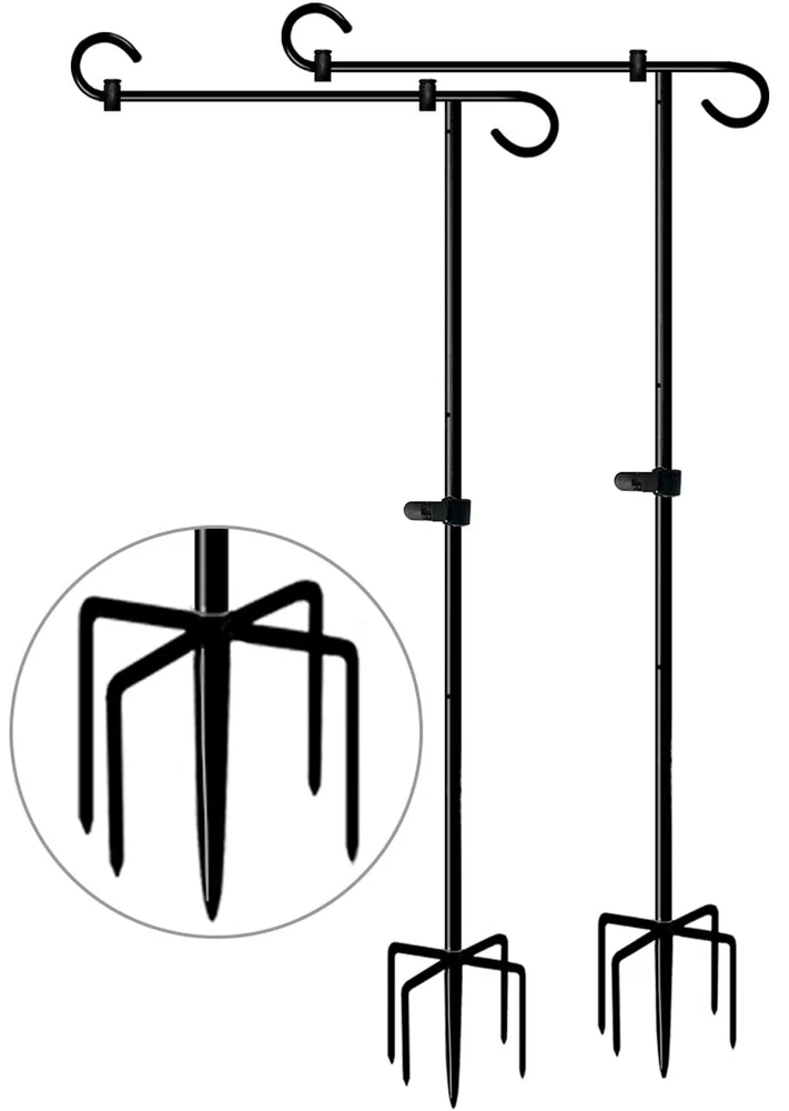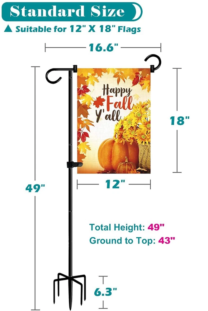 Garden Flag Stand Fills Life with Love: Hold our heavy duty flag stands, swap out garden flags as seasons and festivals change. Display different colorful designs on the garden flag stand. Enjoy all kinds of holidays and parties. Key Features: 1, A total height of 49 inches can better highlight the garden flag. 2, 0.4 in diameter thick heavy duty pipes provide high stability. 3, Powder coated finish surface is water-proof, rust proof and durable. 4, 5 forked bases provides a strong grip and prevent bending over in windy. 5, The total height can be adjusted according to your requirements( 33 " or 49 ") . 6, 2 wind-proof stoppers and clip keep the flag from moving side to side and tangling in windy. 7, Easy to assemble and use. Specification: Total Height: 49 in Net Height (off ground): 43 in Color: Matte Black Net Weight: 3.3 LB Material: Heavy Duty Steel Finish: Black Powder Coated Finish Applicable Flag Size: 12" x 18" TOTAL 49 INCH TALL - The total height of 49 inch can be better highlight the garden flag. The standard dimension is perfect for the mini fall flags & banners in 12" x 18" size. Moreover, each flag stand set comes with 2 extension pipes and the height which can be adjusted to your require height of 33" or 49", and make sure that the flag post can be adapted to different scenes, leaving beautiful scenery for your garden. 5 PRONG BASE - Our large outdoor garden sign holder with 5 prong bases is made of 0.4 in diameter thickened steel pole and high quality longer screw thread which is more solid and durable, can avoid metal flag stake bending, breaking or unscrewing itself in the wind. What's more, processed with black powder paint coated finish, the heavy duty steel flagpole features better water-proof, rust proof and keeping the tall garden flag holder for long lasting use. GREAT FOR HOLIDAY DECORATION - Hold a beautiful small flag for any party theme, season, or holiday! Such as American National Day, Patriotic Celebrations, Spring, Summer, Fall, Winter, Mother’s Day, Halloween, Easter, Valentine’s Day, Thanksgiving, Christmas, Birthdays, and more. Perfectly decorates the outdoor garden lawn, front yard, backyard, new house, school, cemetery etc., leaving you with beautiful scenery. EASY TO ASSEMBLE - Our freestanding courtyard flag hanging pole is equipped with screwing-in joints, just turn the flagpole kit clockwise for a few laps and ensure the bars are 100% fully tightened. Moreover, all accessories (stoppers and tiger clip) of flag stands are very easy to install for use. You can refer to our installation instructions in the description pictures. AFTER SALES & WARM TIPS - We are proud to offer 24/7 service to all our customers. If you have any doubts about our flag hanger, you could tell us by please, will try our best to deal with your problem asap. Warm tips for use: turn clockwise again to make sure the joints are 100% fully tightness when the stand insert into the ground.