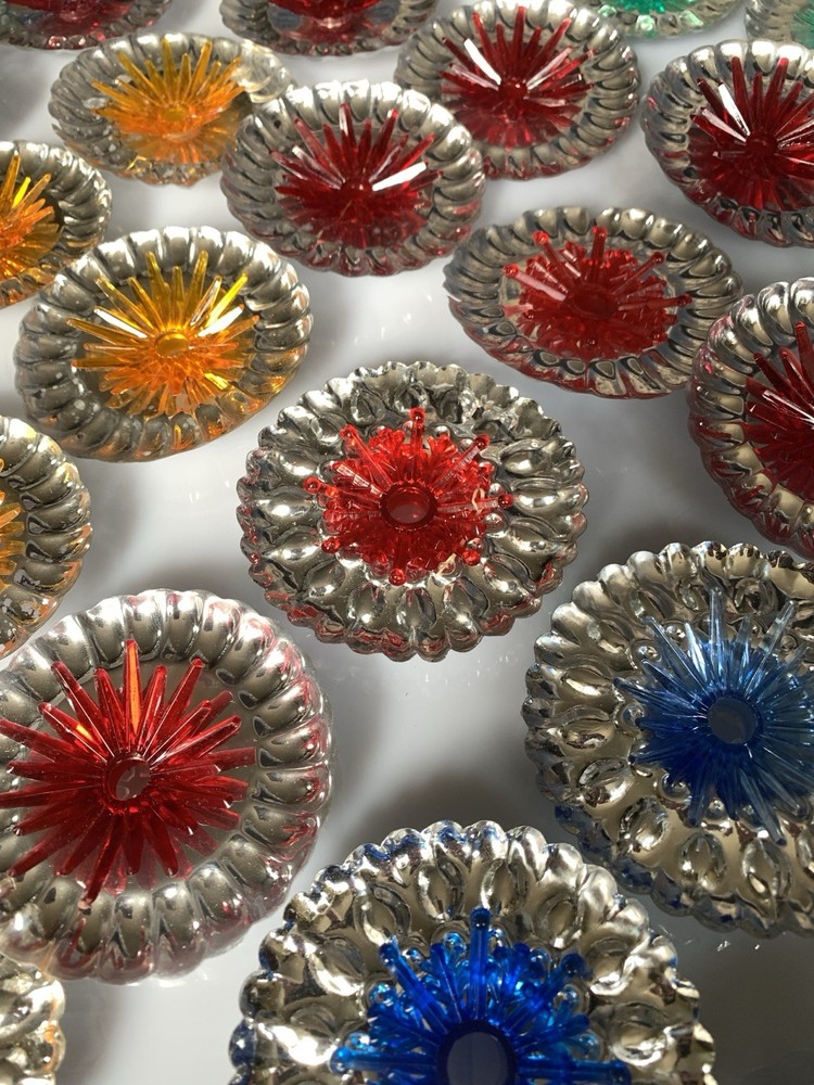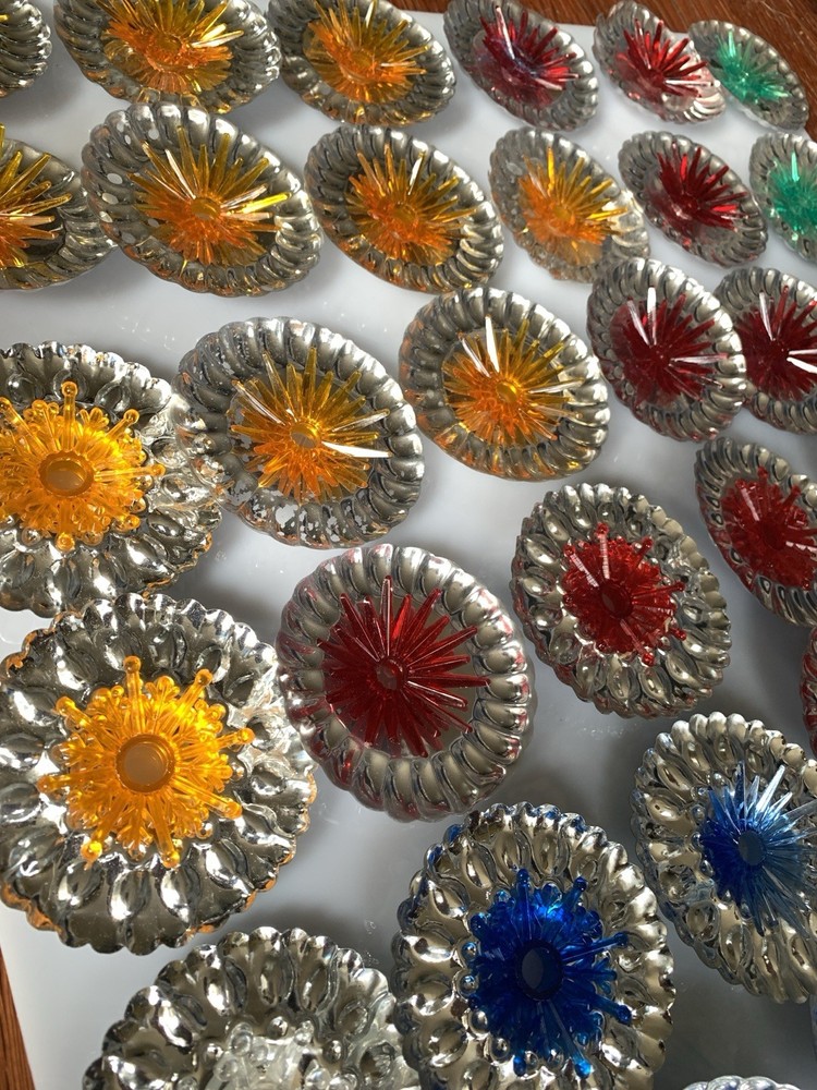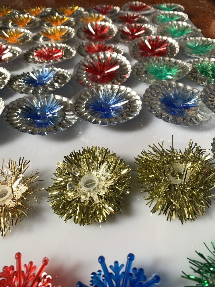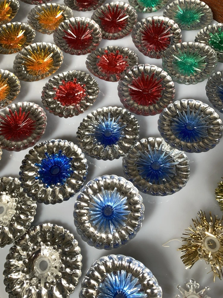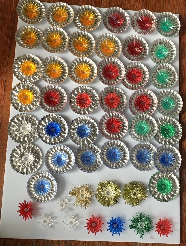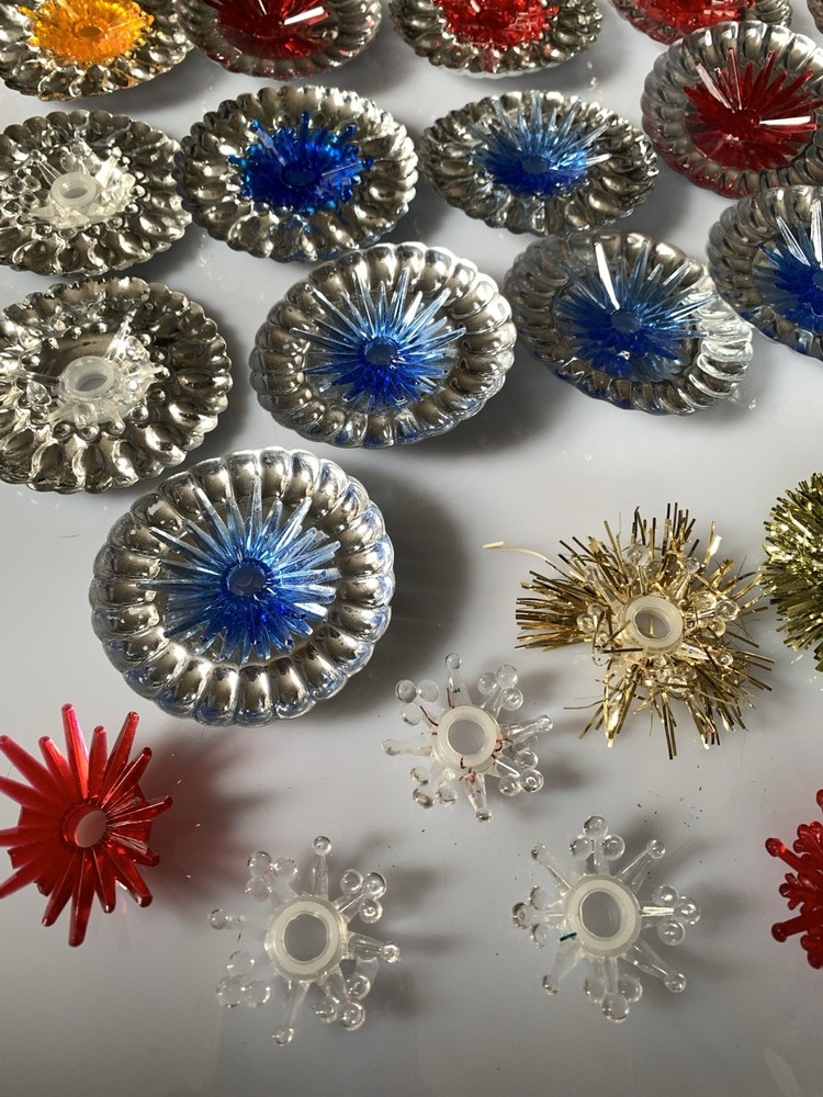 Add classic mid-century sparkle to your holiday display with this vintage lot of Christmas light reflectors! These silver-tone starburst style reflectors feature colorful plastic centers that beautifully amplify light for that nostalgic glow everyone loves. Perfect for restoring vintage light strings or adding retro charm to your tree, garland, wreaths, or window décor. Details: • Assorted vintage Christmas light reflectors • Silver-tone fluted/starburst design • Color centers include red, blue, green, amber, clear & gold tinsel styles • Designed to clip onto standard C7 / C9 style bulbs • Lightweight plastic & metallic-look construction • Great for replacement parts or crafting Condition: Pre-owned vintage condition. May show light wear from age and use such as minor scuffs, surface marks, or slight discoloration. No major cracks noted. Please see photos for exact condition and quantity included. Perfect for: • Mid-century modern (MCM) Christmas décor • Vintage tree light restorations • Retro holiday displays • DIY & craft projects • Collectors of vintage Christmas lighting 🎄 These reflectors bring back that warm, old-fashioned holiday shimmer you just can’t get with modern lights! **PLEASE NOTE*** I'm not a collector or expert so please see all photos for condition and let me know if you have any questions or need any more photographs. Due to the reason of light and the display, you can see the picture may have a slight color difference, this is inevitable, please understand. Please review images to make your judgment on cosmetic condition which I believe is a matter of personal opinion. You will get what you see. The photos will overrule the listing title or descriptions if there is any discrepancy.