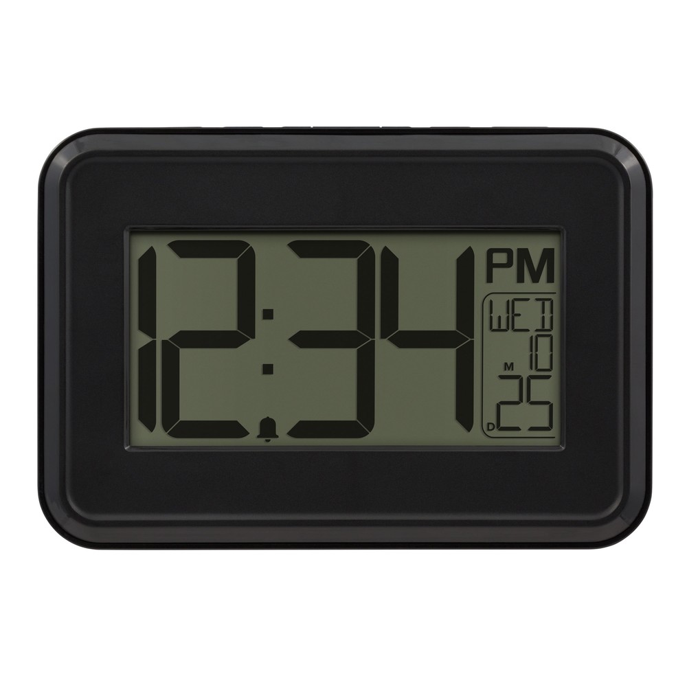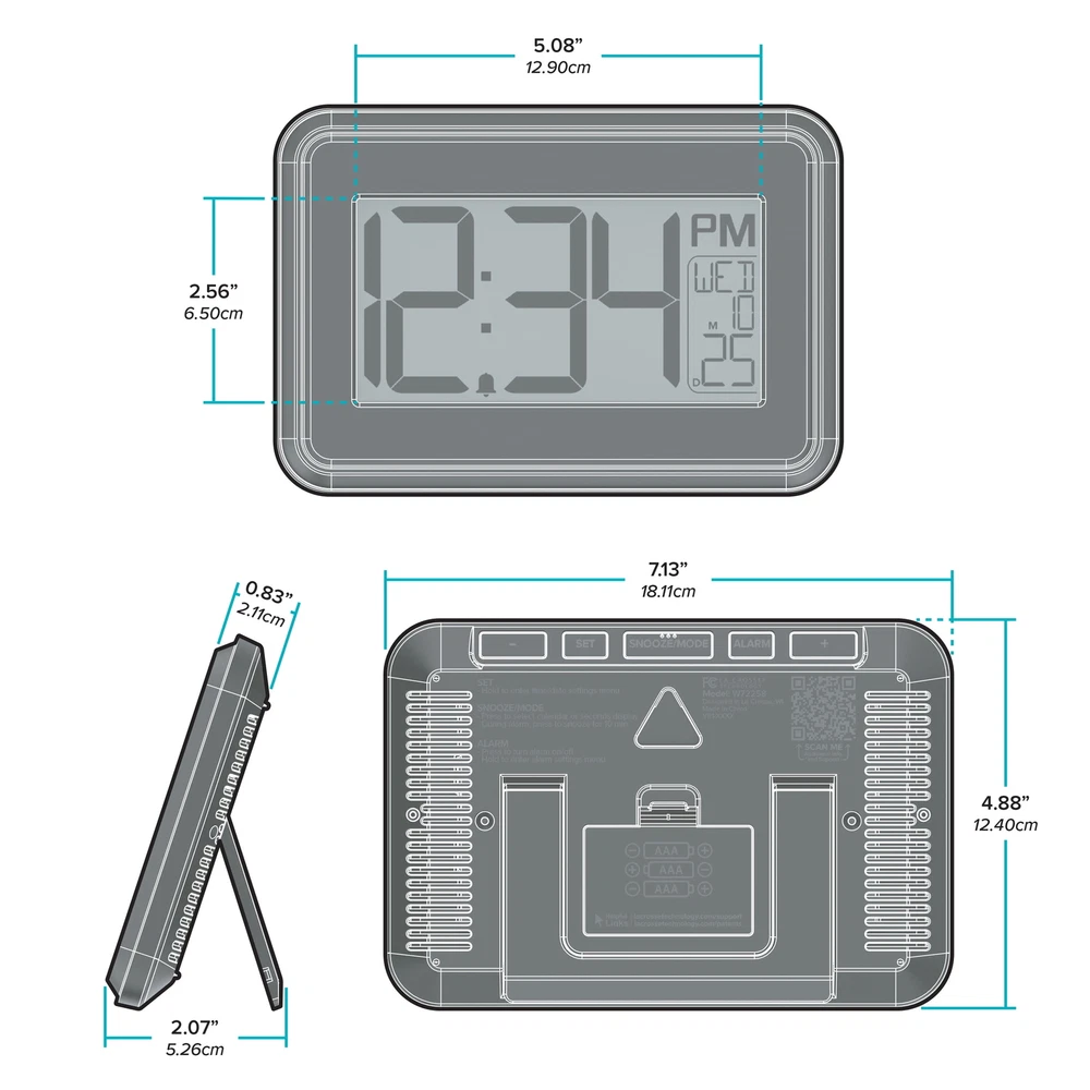 The Mainstays 4.90" Digital Table and Wall Clock features a large 12-hour digital display for easy readability. It includes a crescendo alarm with a 10-minute snooze function , calendar display , and indicators for low battery and active alarm. The clock can be wall-mounted or freestanding , and its compact design makes it suitable for home or office use. With a simple manual time set, it can operate anywhere, and its low battery indicator ensures timely replacement. The clock's versatile design and clear display make it a practical choice for keeping track of time and date. The Mainstays 4.90" Digital Table and Wall Clock features a large 12-hour digital display for easy readability. It includes a crescendo alarm with a 10-minute snooze function , calendar display , and indicators for low battery and active alarm. The clock can be wall-mounted or freestanding , and its compact design makes it suitable for home or office use. With a simple manual time set, it can operate anywhere, and its low battery indicator ensures timely replacement. The clock's versatile design and clear display make it a practical choice for keeping track of time and date. Introducing MainStays Digital Table/Wall Clock with Calendar for a Hands-free convenience. No need to stop what you are doing as simple design digital timepiece features large time digits that are easily viewable to keep you on task with today's calendar day. Easily suited for the home or at the office features a crescendo alarm with snooze option. It's 12-hour manual time set allows the clock to operate anywhere in the world. Also features a low battery indicator and easily mounts on a wall or stands on a flat surface. Stylish, compact, and easy to read, the Table/Wall clock puts the information you need where you need it. Mainstays 4.90" Digital Table and Wall Clock with 12-Hour Display and Alarm Large digital display with 12-hour format for easy readability Crescendo alarm with a 10-minute snooze function for convenience Calendar feature displaying Day/Month/Date or Seconds counting Indicators for low battery, PM, and active alarm for user awareness Versatile design allows for wall hanging or freestanding placement On Jul 9, 2025 at 01:51:06 PDT, seller added the following information: