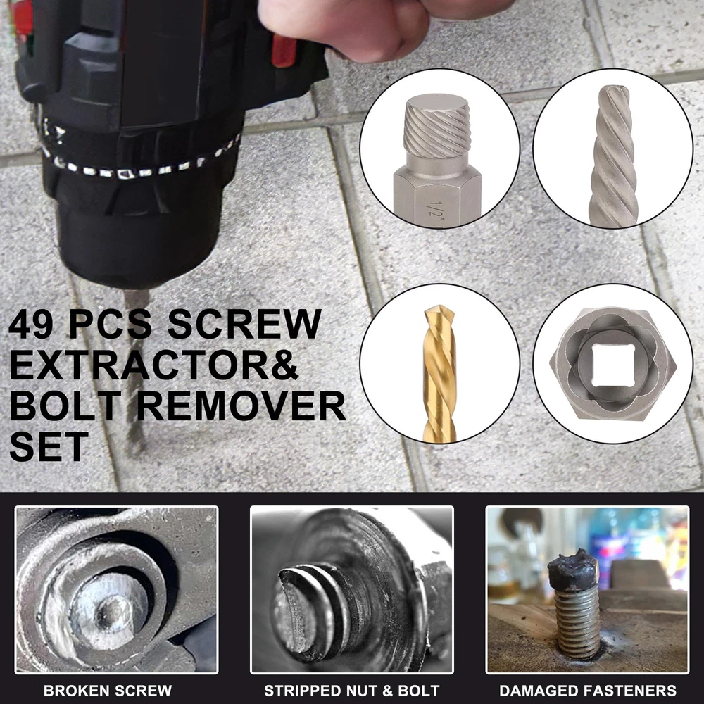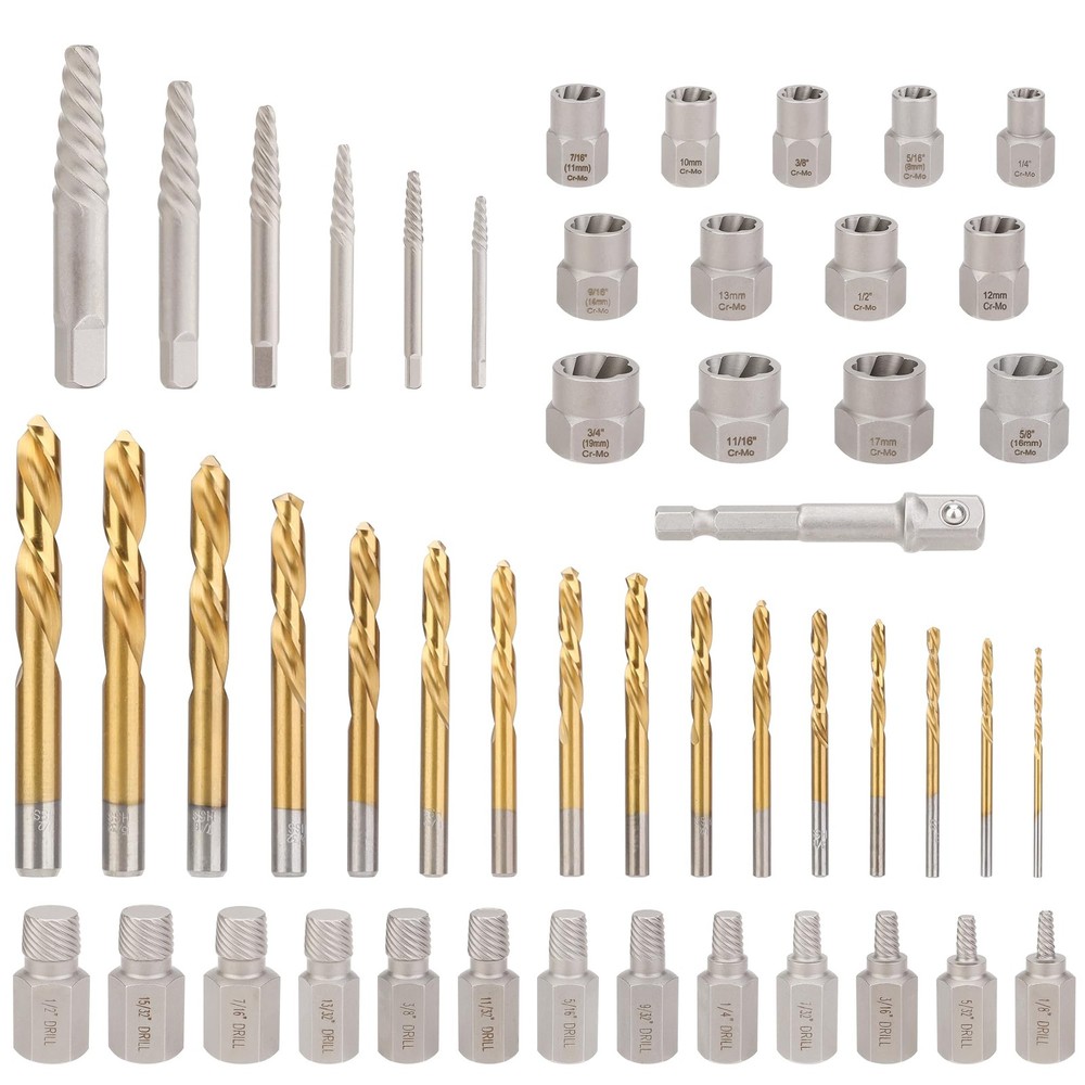 4-in-1 screw&bolt remover kit includes 13pcs most commonly used multi-spline screw extractors ,16pcs tough left hand cobalt drill bits, 6pcs spiral screw extractors 13pcs most commonly used bolt extractors and and 1pcs extension bar. 4-in-1 Screw & Bolt Remover Kit - includes 13pcs most commonly used multi-spline screw extractors ,16pcs tough left hand cobalt drill bits, 6pcs spiral screw extractors 13pcs most commonly used bolt extractors and and 1pcs extension bar. APPLICATION - Suitable for removing most damaged, frozen, rusted fasteners including bolts, nuts and screws. Equipped with bolt/nut busting power, this bolt extractor is ideal for freeing up various nuts and bolts that have gotten stuck. HIGH QUALITY - All the bolt&screw extractors are made of high hardness chrome-molybdenum steel(CR-MO) for high hardness and great toughness ,this material features higher strength than chrome vanadium steel. The left hand cobalt drill bit is made of high speed steel (HSS) with titanium coating for capability and durability. 2 TYPES SCREW EXTRACTORS - Made of Cr-Mo. 13PCS multi-spline extractors match the size of the drill bits are useful for higher torque and lower profile tools, spinning out partly-exposed damaged fasteners. 6PCS Spiral extractors provide extra help to reach deeper places for bolts and screws remove. Easy to use based on drill space with hand or pneumatic tool. CONVENIENT STORAGE & SELECTION - All the removers are placed in a storage case to prevent damage in transit and easy to carry when you are outside. The bolt remover set has laser-etched size markings for easy visibility and size selection.