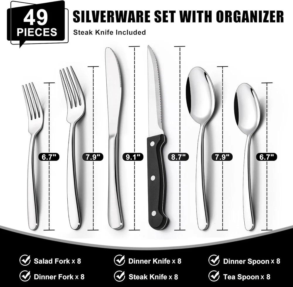 49-Piece Silverware Set with Organizer, Heavy Duty Stainless Steel Silver Product Details Brand: EWFEN Number of Pieces: 49 Material: Stainless Steel Color: Silver Product Care Instructions: Dishwasher Safe Recommended Uses For Product: Travel Special Feature: Rust Resistant Finish Type: Polished Included Components: Flatware,8 Dinner Forks,8 Salad Forks,8 Dinner Knives,8 Dinner Spoons,8 Teaspoons,8 Steak Knives Style: Heavy Duty Item Weight: 6 Pounds Is Stain Resistant: Yes Is Dishwasher Safe: Yes Manufacturer: EWFEN Package Dimensions: 17.36 x 13.54 x 2.72 inches Item Weight: 6 pounds Department: unisex-adult Item model number: xike-0054US 【49-PIECE SILVERWARE SET FOR 8】: This cutlery set with organizer come with 8 dinner forks, 8 salad forks, 8 dinner knives, 8 dinner spoons, 8 teaspoons, 8 steak knives and a silverware drawer organizer with 6 compartments. Ideal for Restaurant, weddings, catered events, party, family reunion, upscale catering, or home dinner, and much more. 【COMFORTABLE DESIGN】: This flatware set has a classic silhouette with clean lines and polish-finish surface in all silver, a good choice to go with your existing tableware. The smooth edge of the handle is pleasure to hold, appropriate weight and perfect balance are added to ensure maximum comfort during use. 【HEAVY DUTY】: 1.5 to 2 times the thickness of ordinary flatware set, thick construction will not bend or flimsy after heavy use, heavy-weight feel with exceptional balance, each eating utensil is a pleasure to hold. 【HIGH-QUALITY STAINLESS STEEL】: Made of premium food-grade stainless steel, providing the longest term value and the best properties, it offers nice resistance to rust and corrosion to get the most sturdy and healthy experience while using, never bend in daily use. 【DRAWER ORGANIZER INCLUDED】: This five compartments drawer organizer provides a great solution to your cutlery. Measures 12.8" x 16", fits in most kitchen drawers. Made from durable plastic that is sturdy to withstand normal wear and tear. Soft-grip lining and non-slip rubber feet ensure that items stay in their place.