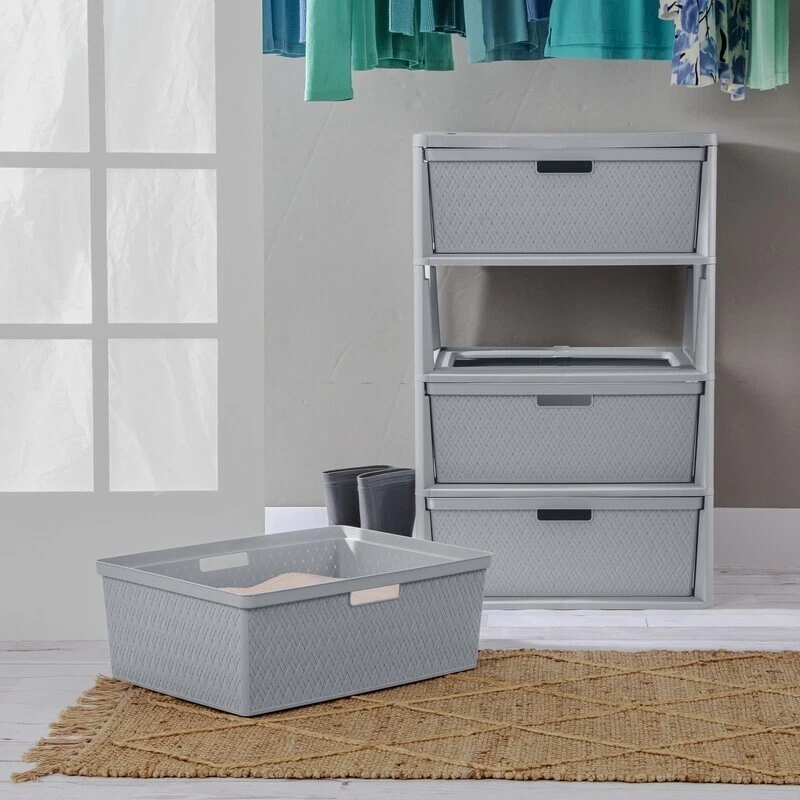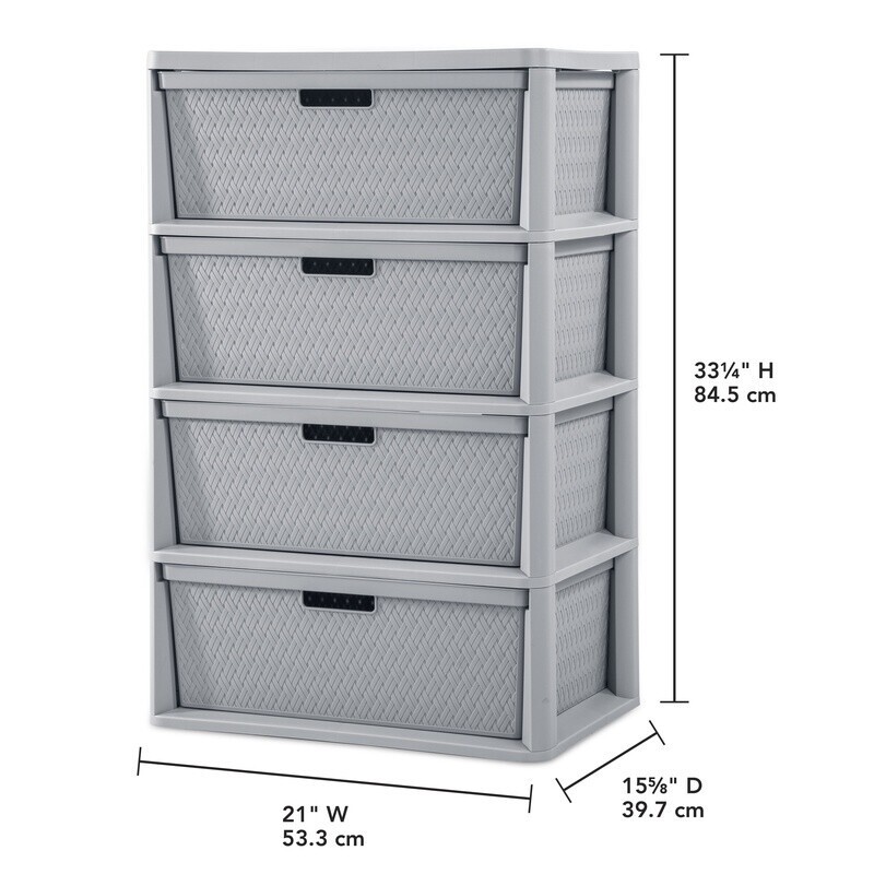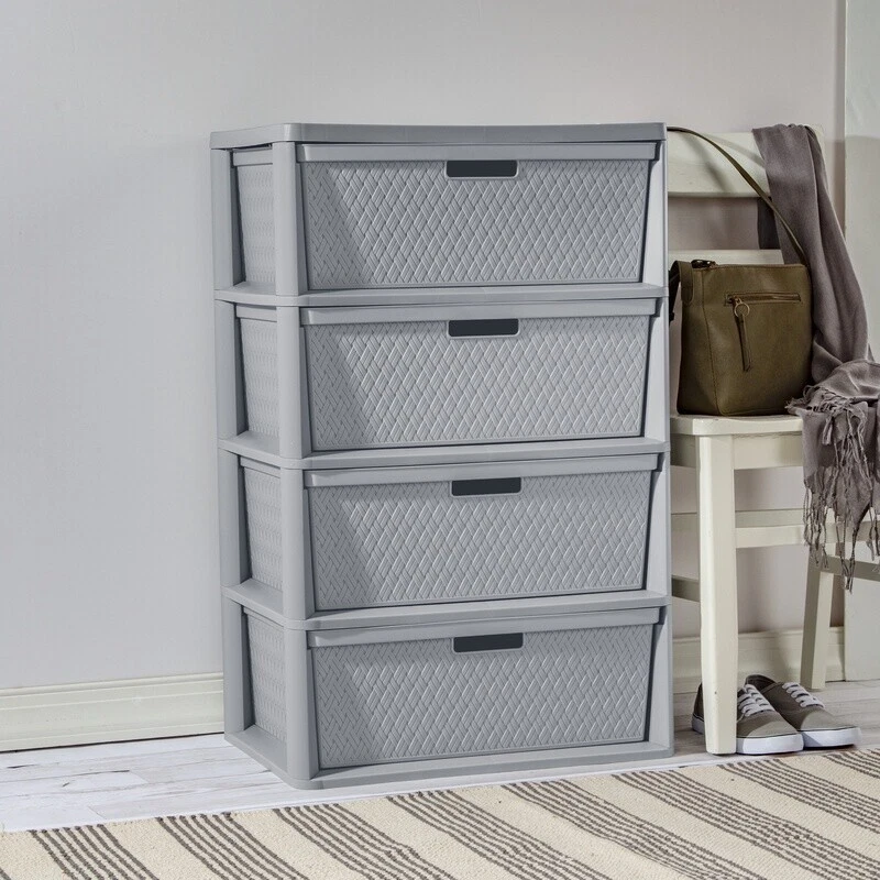 You may also like New Versatile Plastic Storage Cube File Crate Ideal Garage Office Dorm Utility 8.69 USD 9.15 USD Free shipping 5% off New Festive Holiday Print Stackable Design Plastic Storage Tote Bin W/ Lid 25.77 USD 27.13 USD Free shipping 5% off Extra Large Woven Cotton Laundry Basket W/ Handles Storage Clothes Toys Fodable 35.32 USD 37.18 USD Free shipping 5% off 3 Pcs Rectangle Lidded Storage Bins Stackable Bedrooms Bathrooms Plastic White 41.47 USD 43.65 USD Free shipping 5% off Customizable Under Cabinet 15-Piece Organizer Set Cleaning Products Storage New 24.1 USD 25.37 USD Free shipping 5% off Large Stacking Storage Baskets Organizing Bin Home Office Kitchen Laundry New 9.44 USD 9.94 USD Free shipping 5% off Non-Slip Interlocking Drawer Organizer Durable Plastic Design Easy Clean Storage 11.01 USD 11.59 USD Free shipping 5% off 2pc Two-Tone Collapsible Storage Bins Organizers W/ Handles Kids Playroom New 12.66 USD 13.33 USD Free shipping 5% off 3 Drawer Cart Storage Bin Wide Multi-purpose Versatile Storage Clear Handle Home 25.72 USD 27.07 USD Free shipping 5% off Stackable Storage Bins W/ Lids Clear Plastic Organizer Home Office Craft Storage 80.97 USD 85.23 USD Free shipping 5% off Mobile 6-Drawer Plastic Storage Cart W/ Organizer Top & Rolling Wheels New 60.26 USD Free shipping Set of 6 Jute Storage Baskets Durable Resin Organizer W/ Handles Home Decor New 27.81 USD 29.27 USD Free shipping 5% off Take decorative storage to a whole new level - literally! 's Wide 4 Drawer Cross-Weave Tower is the perfect storage solution for items to hide in plain sight, with the added feature of portability to each drawer. Slide out any drawer and transport it wherever needed with ease, using the two integrated through handles. When it's time for clean-up, return the drawer to the Tower by simply sliding it back in for clutter-free organization. Designed with a drawer stop, the drawer will stay in place - until removed - so there's no worry of the drawers coming out unintentionally. Ideal for arts and crafts supplies, school work, toys, health and beauty items, towels, linens, clothing, accessories and more, there is a place for everything and everything in its place. The opaque timeless cross-weave design keeps frequently used items sorted and contained where they are most often used for easy access - in any room of the home, office space, dorm room, or even the classroom. Keep your space stylish whether taking bins on the move or keeping them stored in place with the Cross-Weave Tower! The overall assembled dimensions of this item are 15 5/8" D x 21" W x 33 1/4" H. Adult Plastic Wide 4 Drawer Cross-Weave Tower Cement: Outside Dimensions: 15 5/8" x 21" x 33 1/4" Single unit option Cement Interior Dimensions at bottom: 18" x 13 3/4" x 7" Timeless and stylish cross-weave pattern in a multi-purpose and versatile storage option for any room in the home Each drawer can become a portable bin by simply removing from frame The integrated carry-through handles allow the bin to be carried with ease Opaque drawers keep contents concealed and clutter controlled Designed with a drawer stop so the drawer will not unintentionally fall out Assembles easily in minutes, without the use of tools BPA-free and phthalate-free You may also like Hypoallergenic Down Alternative King Pillows Gusset Comfortable Support White US 64.125 USD Free shipping Toddler Kids Plush Rocking Chair Ergonomic Armchair Indoor Nursery Playroom Sofa 147.23 USD 154.98 USD Free shipping 5% off 7.5ft Round Outdoor Patio Tilt Market Umbrella Push Up Canopy Shade Steel Frame 37.4625 USD Free shipping Super Soft Plush Blanket Cozy Polyester Warm Adults Teens Couch Camping New US 27.05 USD Free shipping Ultra Comfort Soft Toilet Paper 30 Mega Rolls 2 Ply Absorbent Clog Free White US 31.2125 USD Free shipping Humidifier Cool Mist Large Room Ultrasonic Essential Oil Bedroom Office 1 Gallon 52.45 USD Free shipping 7-Quart Black Pre-Seasoned Cast Iron Round Dutch Oven Pot W/Lid & Dual Handles 63.91 USD 67.27 USD Free shipping 5% off Original 1 Gal Vitamin Solution Plant Growth Mineral Supplement Indoor Outdoor 160.7375 USD Free shipping Heavy Duty Twin Metal Bed Frame Center Support Recessed Legs Easy Assembly Home 63.325 USD Free shipping Xtreme Trimmer Line 0.155in Dia 109ft Long Lasting Cuts Fits Most Trimmers New 27.925 USD Free shipping 12-Piece Non-Stick Cookware Set Induction Safe Ergonomic Handles Protectors New 142.4375 USD Free shipping Dresser for Bedroom w/8 Drawers,Wide Chest of Fabric Dresser,Black Living Room 91.2375 USD Free shipping