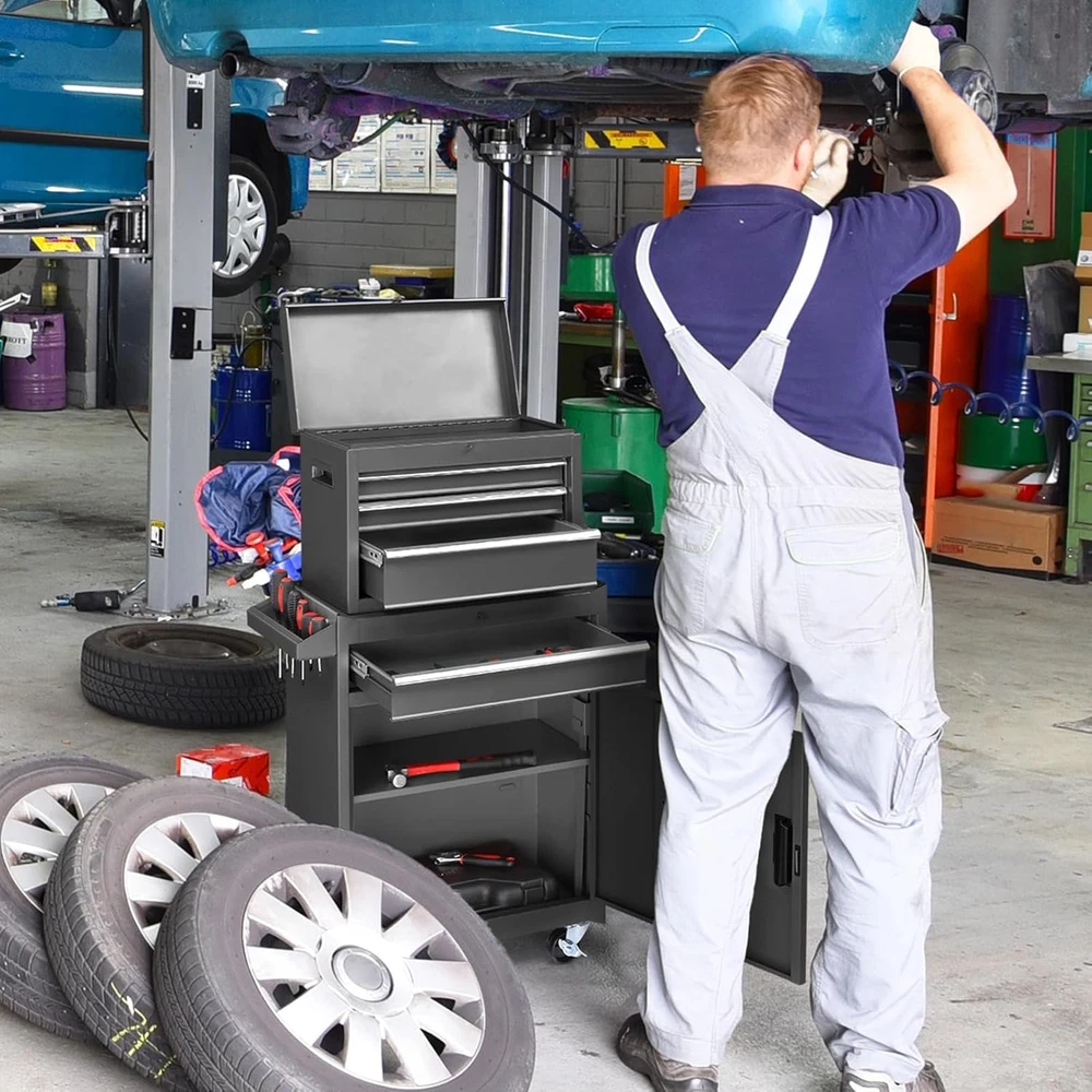 Product Description About this item Top Removable Tool Box - This Rolling Tool Chest has 1 rolling tool cabinet with 1 drawer on the bottom and 1 top box with 3 drawers on top. The whole tool box can be disassembled into two parts, and the top box can be put into the big bottom box, which saves space and is even convenient to carry 4 Drawer Storage - This tool cabinet is designed with a total of 4 drawers and 1 base cabinet for storing tools, small equipment or other items. The base cabinet has side hooks for hanging tools such as wrenches. There are holes on the side where tools can be placed for your convenience Easy to move - This tool storage chest & cabinet combo has 4 wheels, 2 of which are lockable and can be locked to prevent movement when it is not needed. The separate tool box on the top also has a handle design for easy movement Lock & Security - The top separate tool box of this product offers a locking bar to prevent the drawer from sliding out during movement, and the bottom rolling tool cabinet is also designed with a lock for added security Durable & Versatile - The tool chest with wheels is made of high quality steel for added durability and is powder coated for a smooth finish that is easy to maintain and clean. It can be used in various occasions such as garages, warehouses, workshops, repair shops and more Note: Please pay attention to product size when purchasing