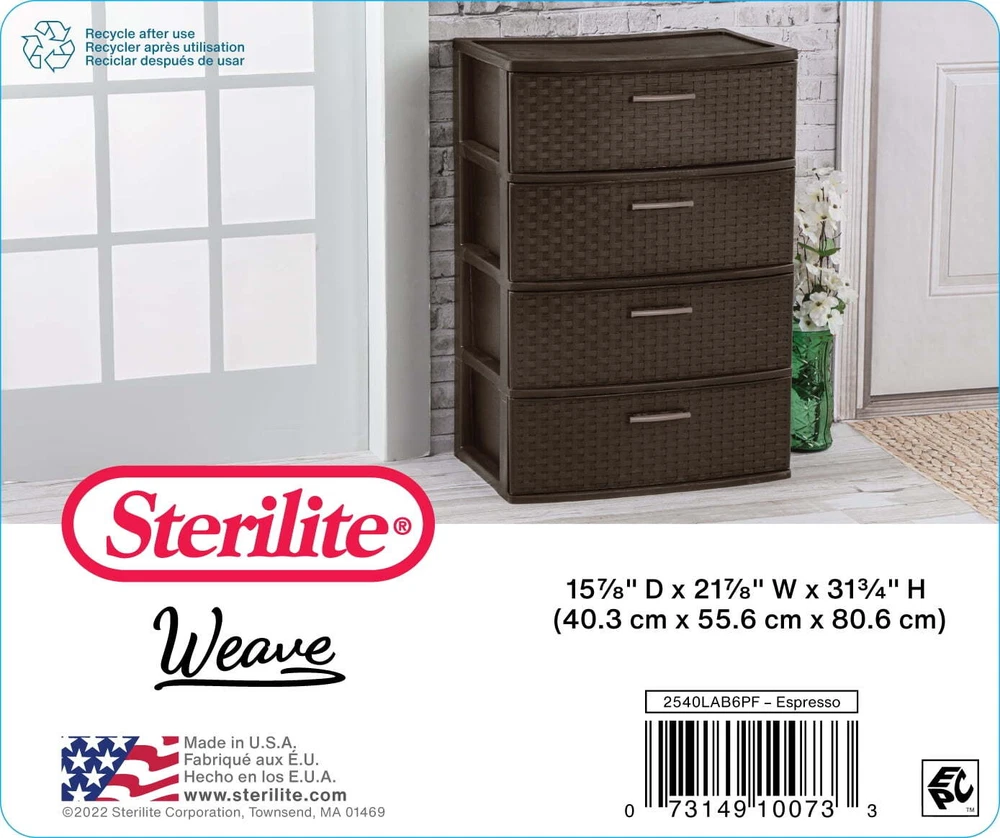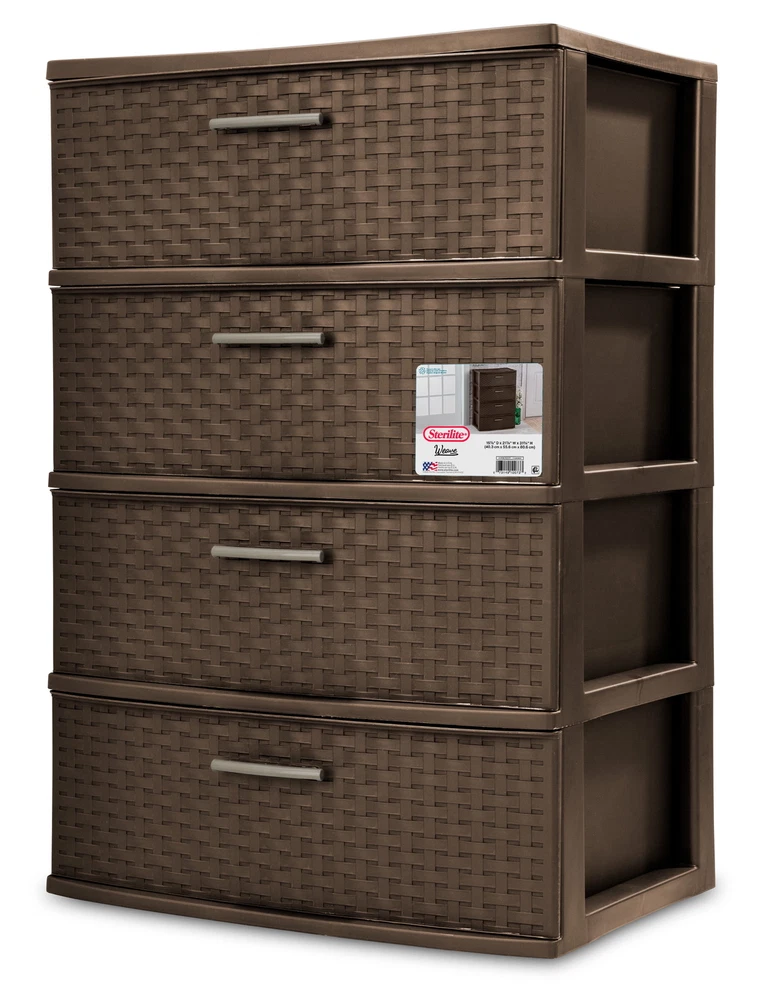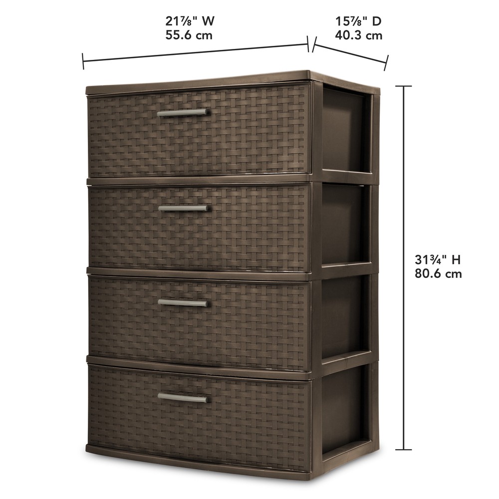 Organize visible storage areas with Weave collection. These Weave Storage items combine style and function; the trendy look of weave with the convenience, durability and value of plastic to provide a variety of décor solutions for your living spaces. The 4 Drawer Wide Weave Tower is ideal for "out in the open" storage needs. Four opaque drawers keep clutter controlled and concealed while providing access to frequently used items, where they are most often used. The easy pull handles allow drawers to open and close effortlessly, with a drawer stop to prevent drawers from being removed accidently. The overall assembled dimensions of this item are 15 7/8" D x 21 7/8" W x 31 3/4" H. Adult Plastic 4 Drawer Wide Weave Tower Espresso: Outside Dimensions: 15 7/8" x 21 7/8" x 31 3/4" Four opaque drawers keep contents concealed where they most often used Single unit option Opaque woven pattern to add a fashion touch to your storage - Espresso Interior Dimensions at bottom of drawer: 19 1/8" x 13 1/4" x 6 5/8" Stylish weave pattern in easy to clean, durable plastic is ideal for "out in the open" storage needs Versatile decorative storage solution is ideal for use throughout the home Opaque drawers keep contents concealed and clutter controlled Keep frequently used items contained and organized where they are most often used BPA-free and phthalate-free