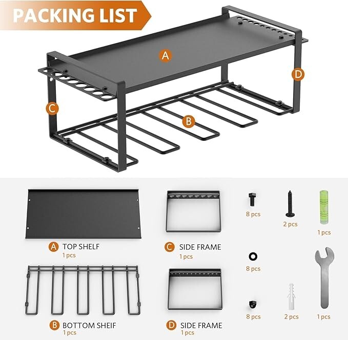 This power tool organizer is designed to store power tools in workshops or garages. It can hold up to 4 drills and can be used on pegboard. It also stores several small tools and has a shelf for other supplies. Assembly is required to set up the storage rack. Stock photo was used because I didn't want to open it and take it out of its original packaging.