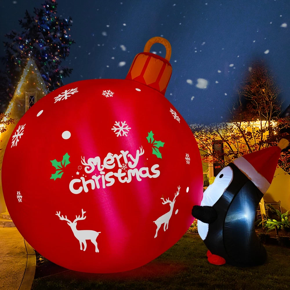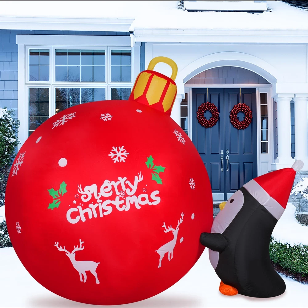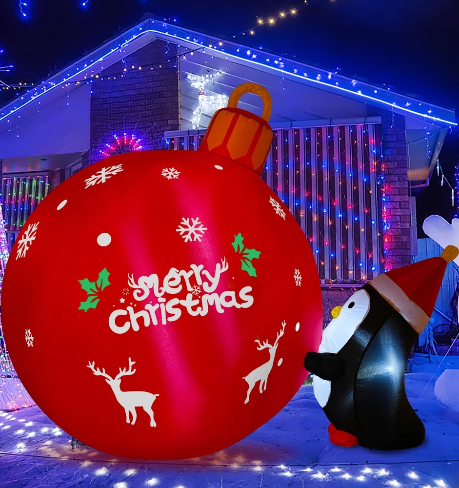 High Quality Durable Material: Made of high quality Polyester material, which is strong, secure and durable material, not easy to tear; The Penguin Push Christmas Bell inflatable is super easy to inflate, just zip it up and plug it in, you will see It go from laying down to fully inflated within a couple of minutes Build-In LED Light: This 4FT lighted Christmas Bell inflatable Decorations with 3 led lights inside, light up at night and make your home a new sight in your neighborhood; It adds a festive look to your holiday seasonal layout and welcome to your guests with warm wishes Stable and Steady Enough: Don't worry that the Penguins push Christmas Bell inflatables will fly away with the wind; It came with 3 stakes and 2 rope to hold in place if necessary; and built in sandbags; It is easy to stake down and seems fairly sturdy BLOW UP FAST: Setup is super simple; Just plug it in, everything pops up in a minute; The package comes with an extended cord, fan, ground stakes, fastened ropes, built-in sandbags, and a plug with UL certification Great for Festival: The Inflatables Christmas Bell fits harmoniously with the snow days in your garden in Christmas, creating a fun and memorable scene in your house or on your lawn during the holiday season; If used at outdoor, please make sure the Power plug away from water